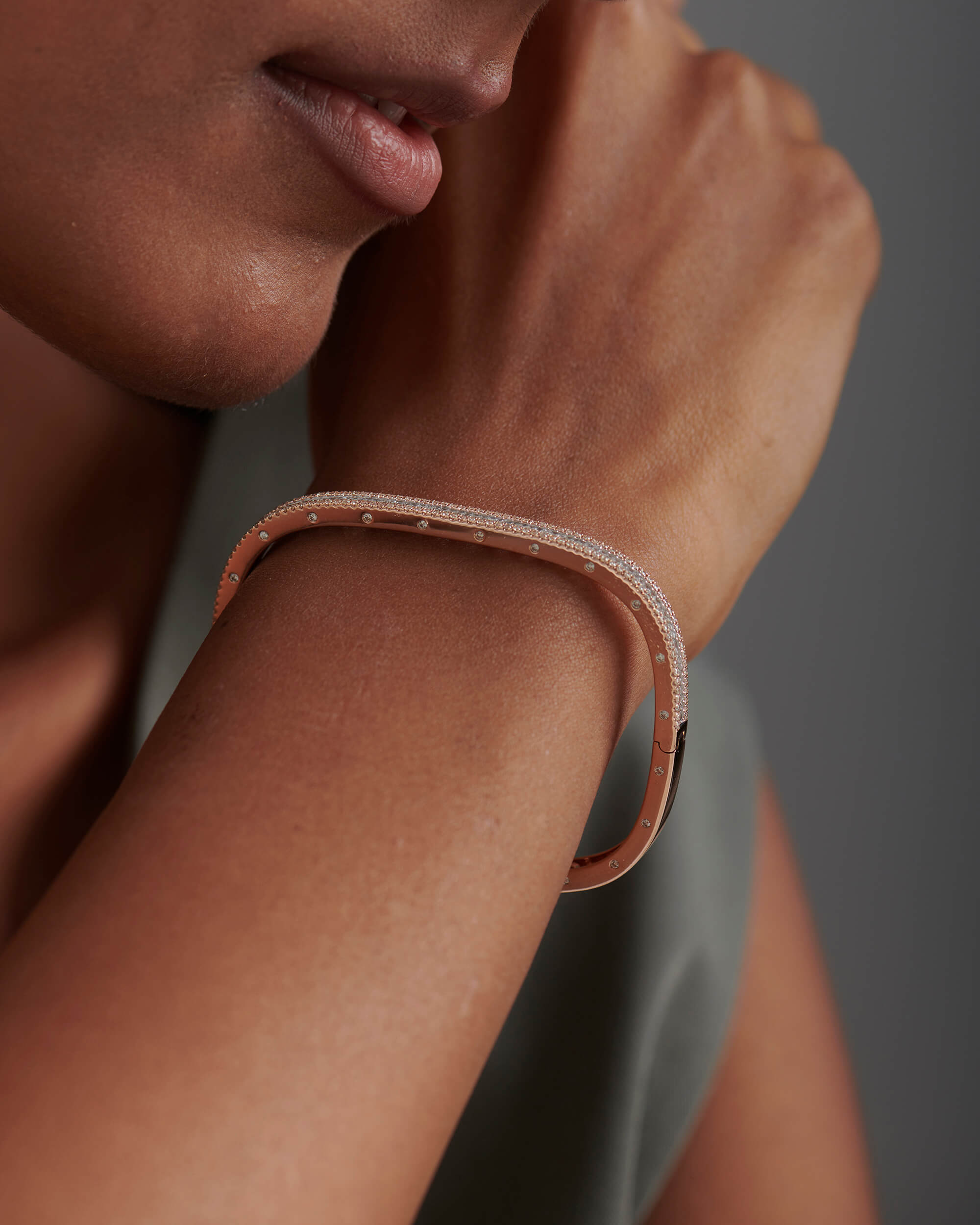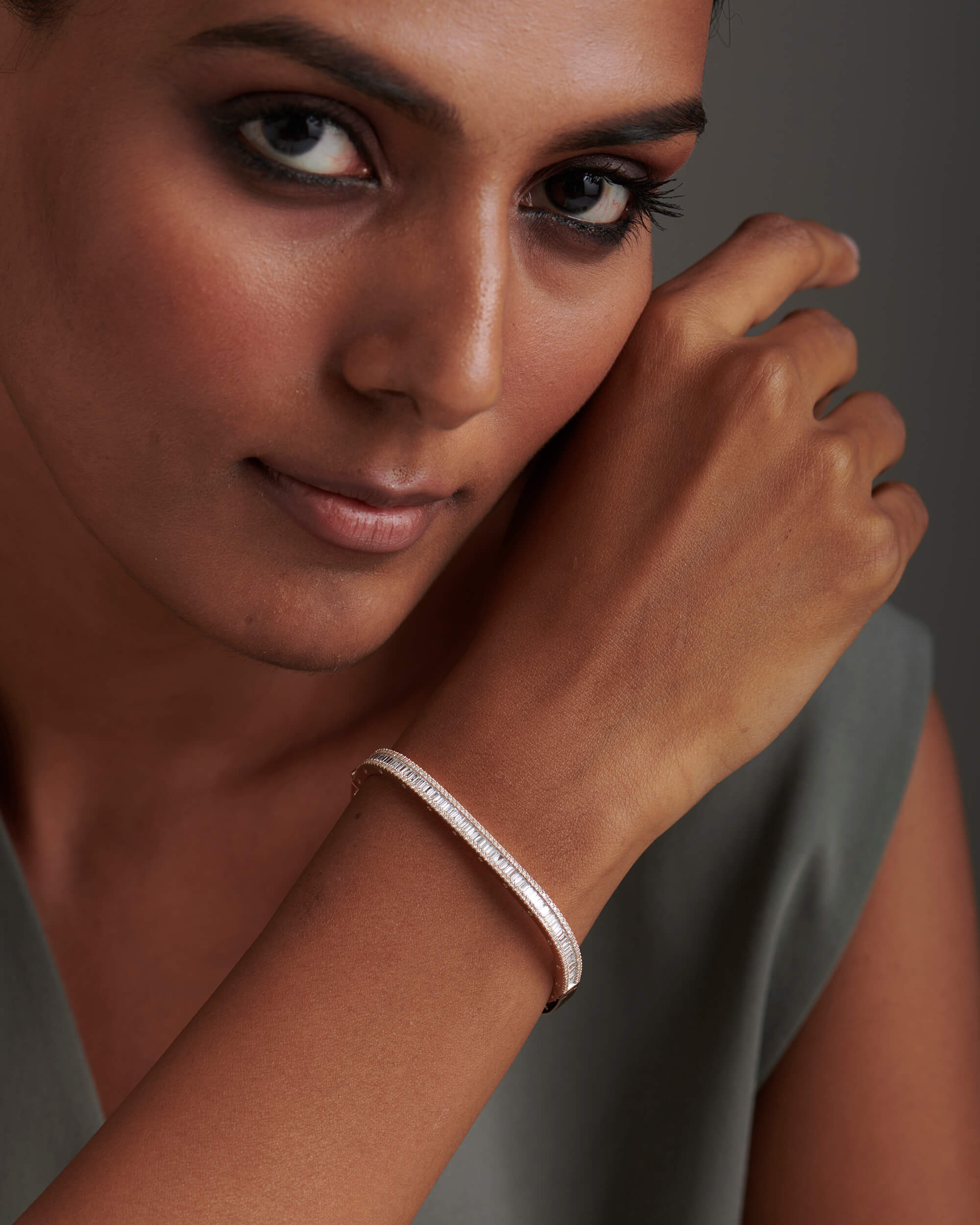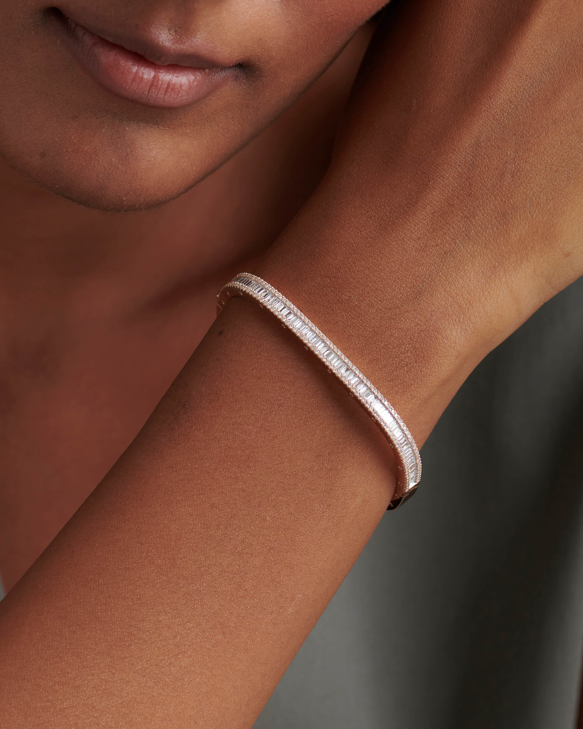 The Baguette & Round Diamond Cushion Bangle is crafted in solid gold with baguette diamonds in channel setting and round diamond in gold pave setting. The shimmering diamond accents along the sides adds an extra touch of glamour and luxury to this already stunning piece. The bangle hinges open and has a box type clasp opening for easier accessibility. This can be one of the favourite pieces to stack with a watch.