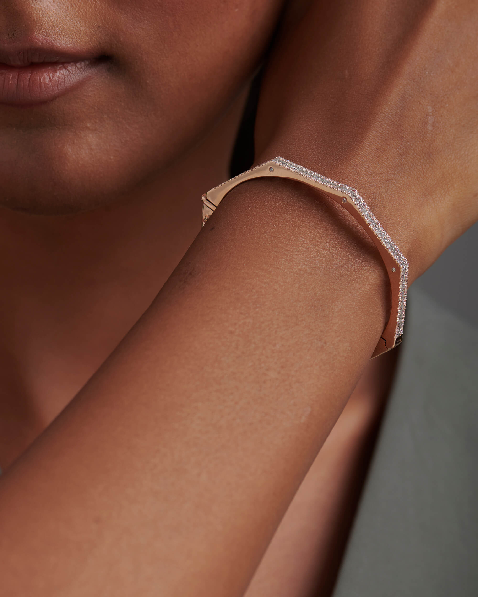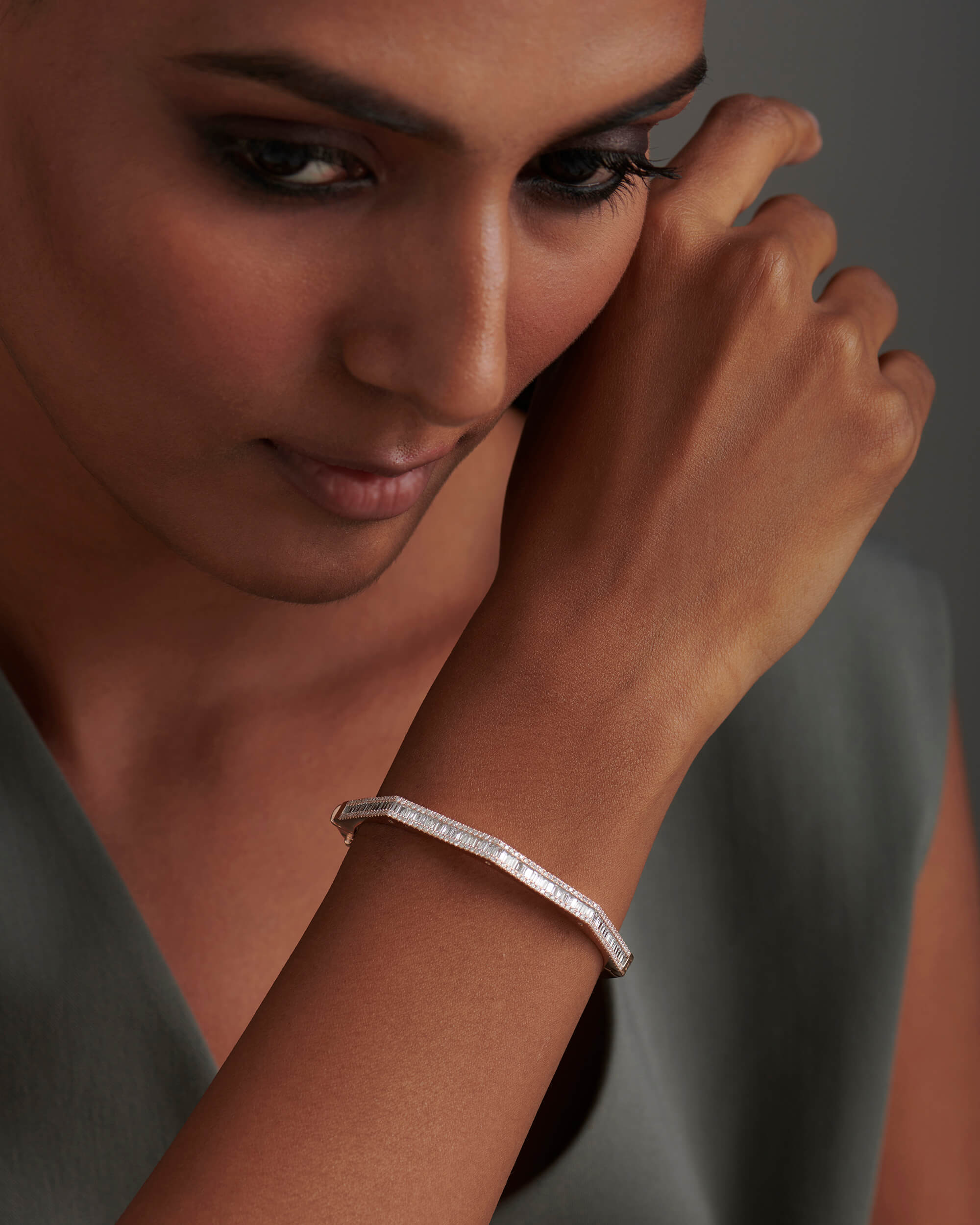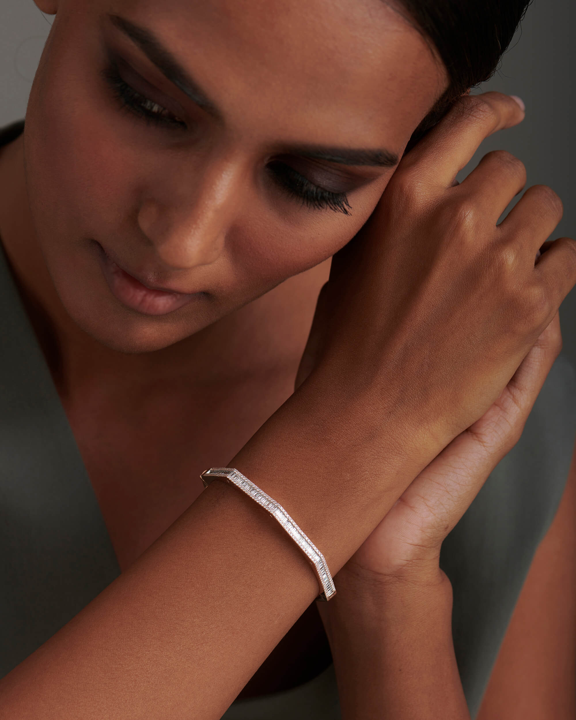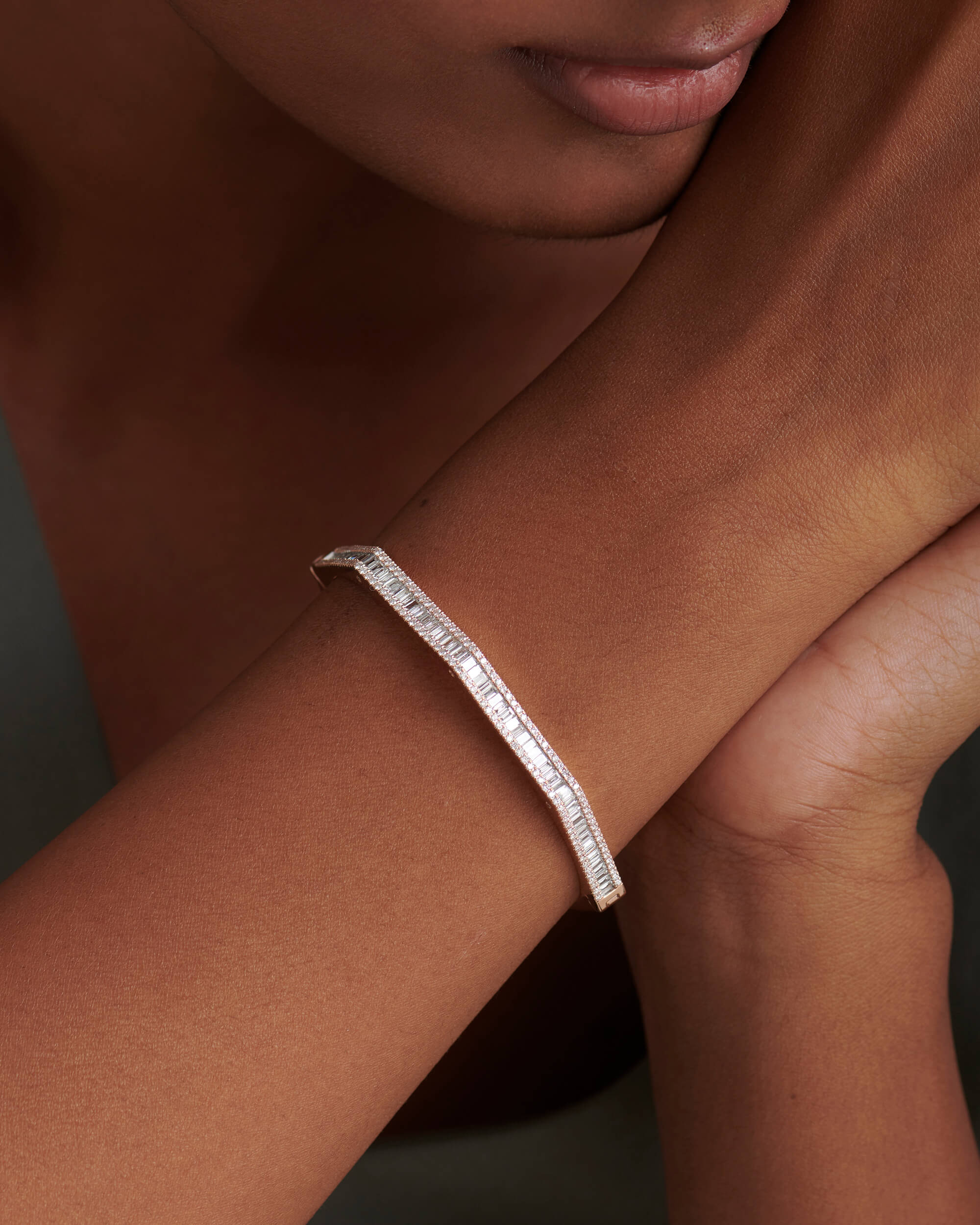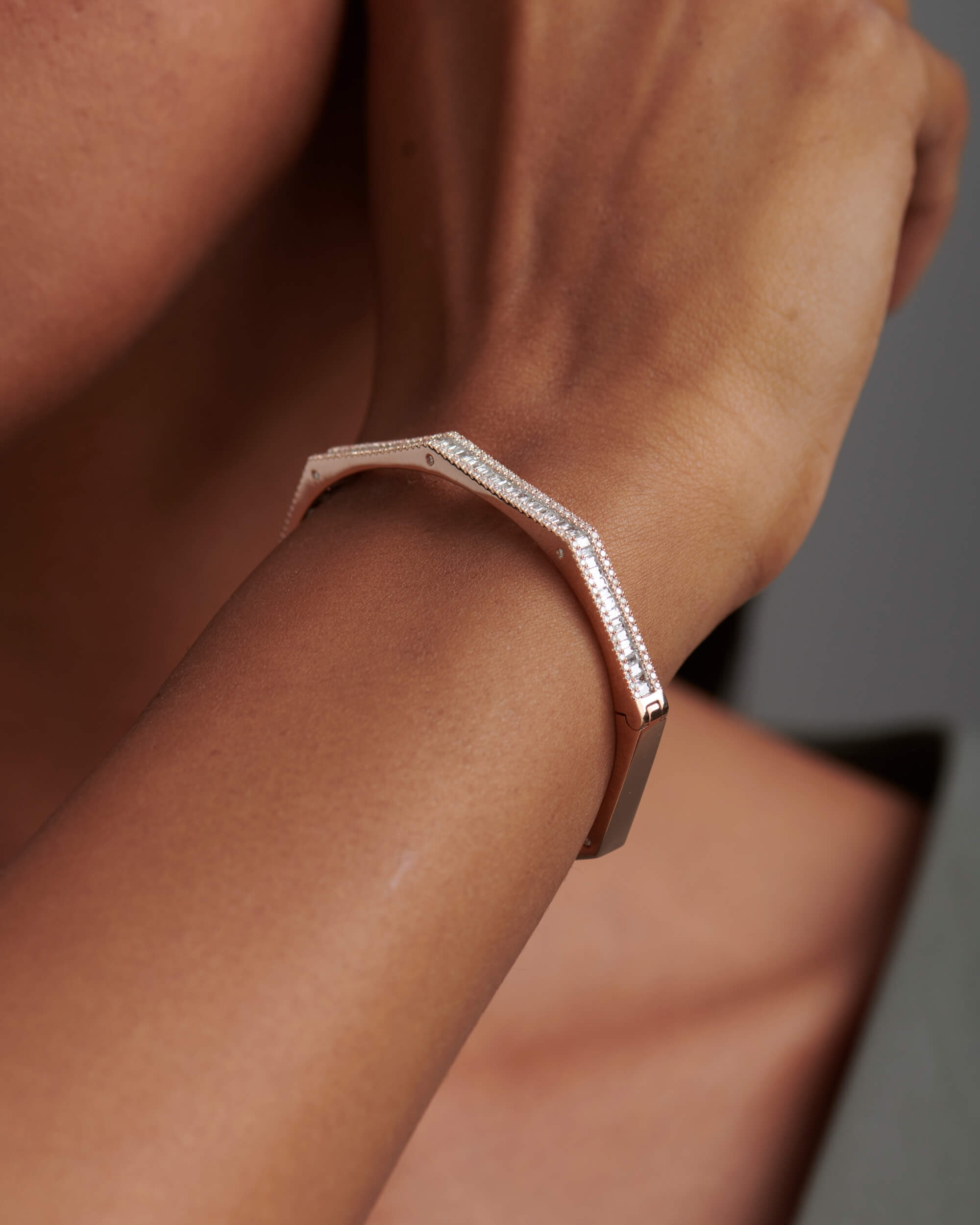 The Baguette & Round Diamond Octagon Bangle is crafted in solid gold with baguette diamonds in channel setting and round diamonds in gold pave setting.The shimmering diamond accents along the sides adds an extra touch of glamour and luxury to this already stunning piece. The bangle hinges open and has a box type clasp opening for easier accessibility. This can be one of the favourite pieces to stack with a watch.