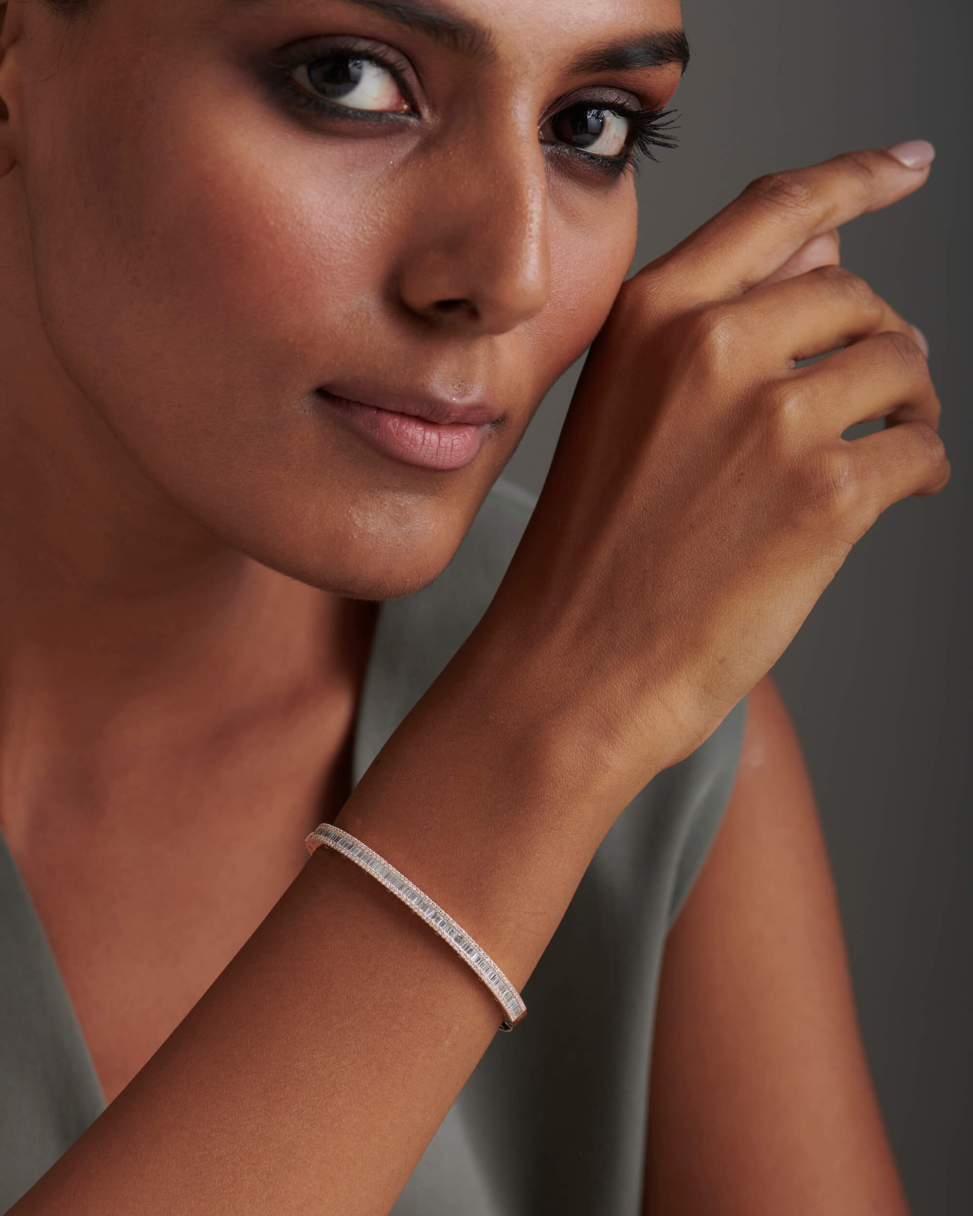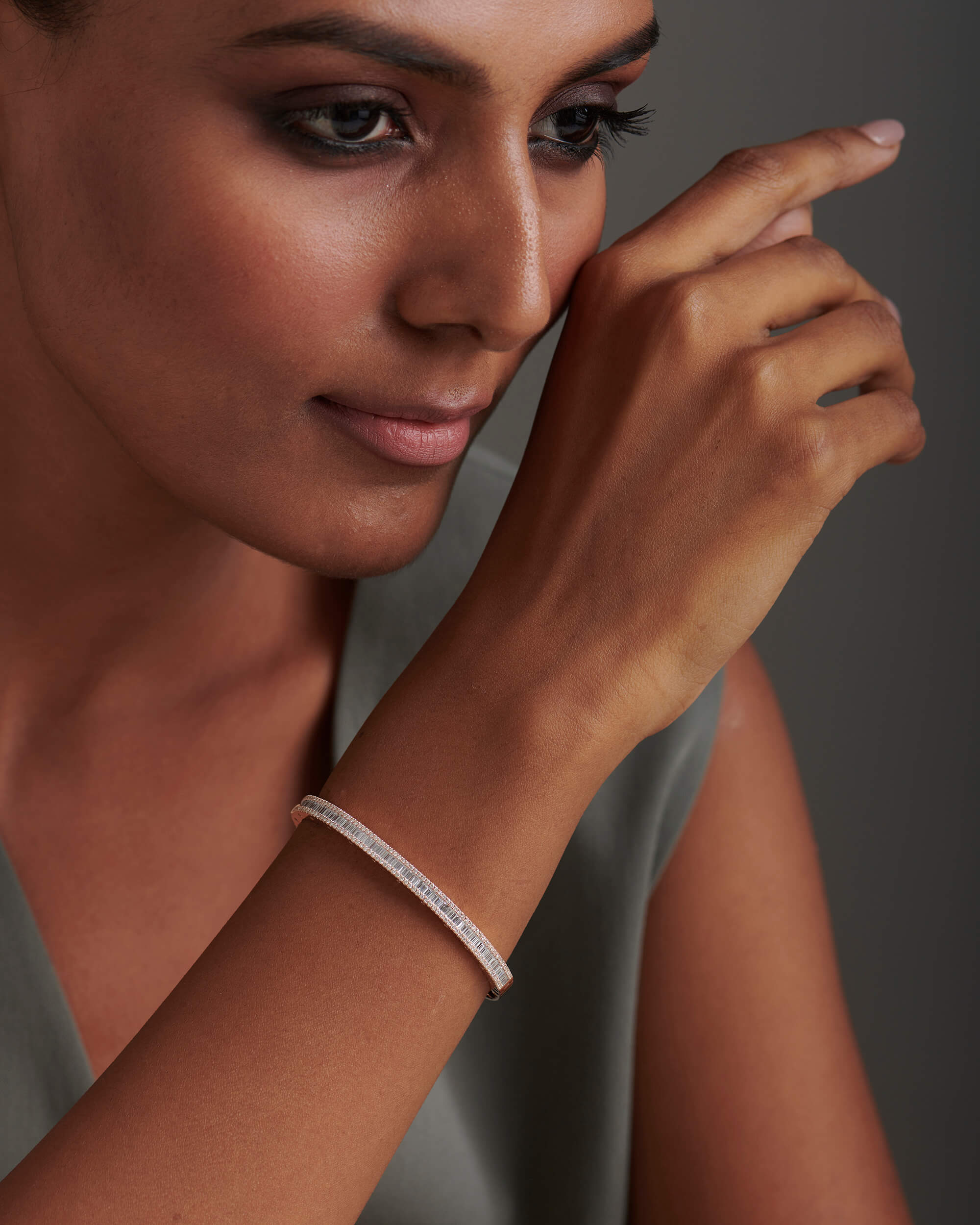 The Baguette & Round Diamond Oval Bangle is crafted in solid gold with baguette diamonds in channel setting and round in gold pave setting which is chic and stylish at the same time. The shimmering diamond accents along the sides elevates its elegance to the next level. The bangle hinges open and has a box type clasp opening for easier accessibility. This can be one of the favourite pieces to stack with a watch.