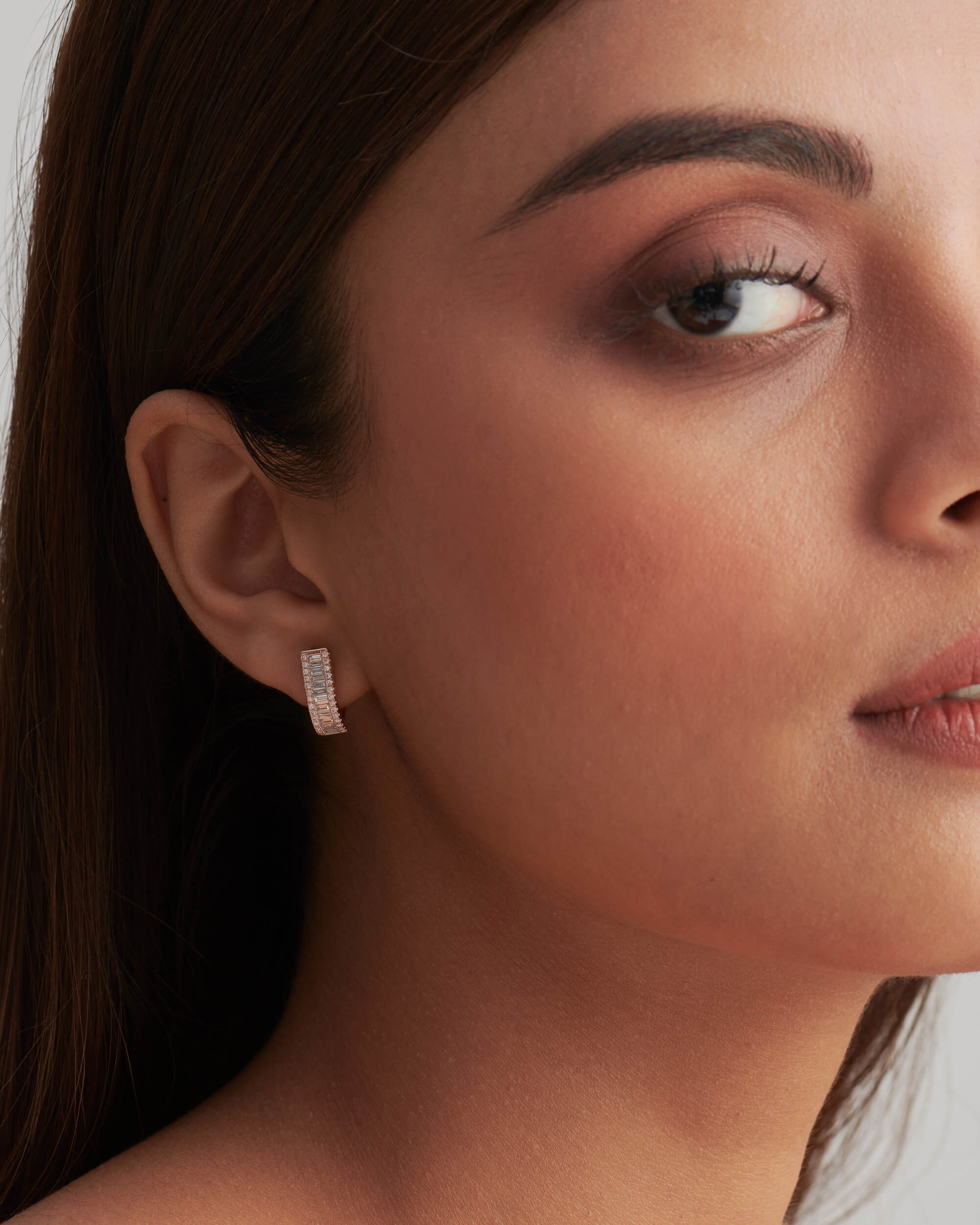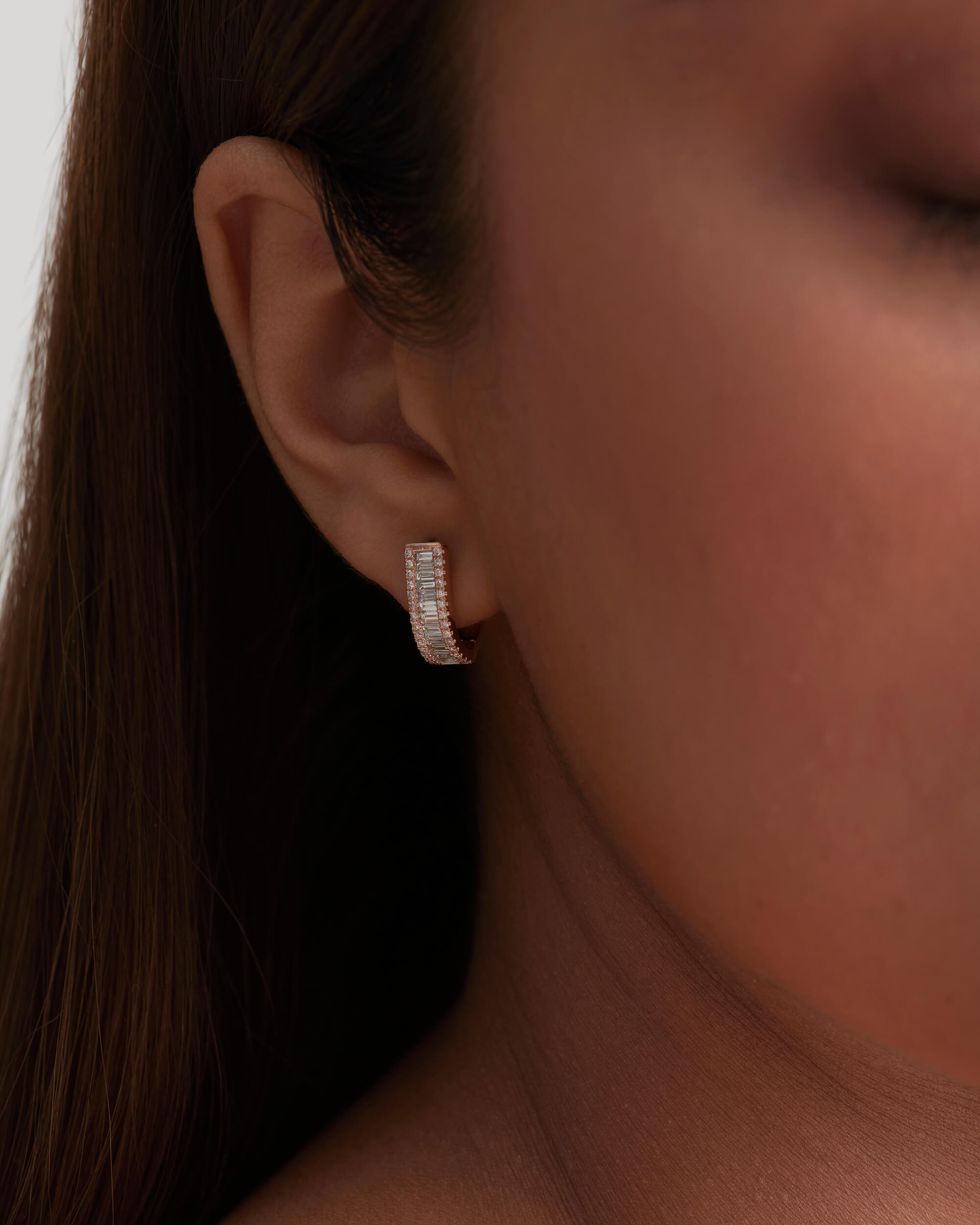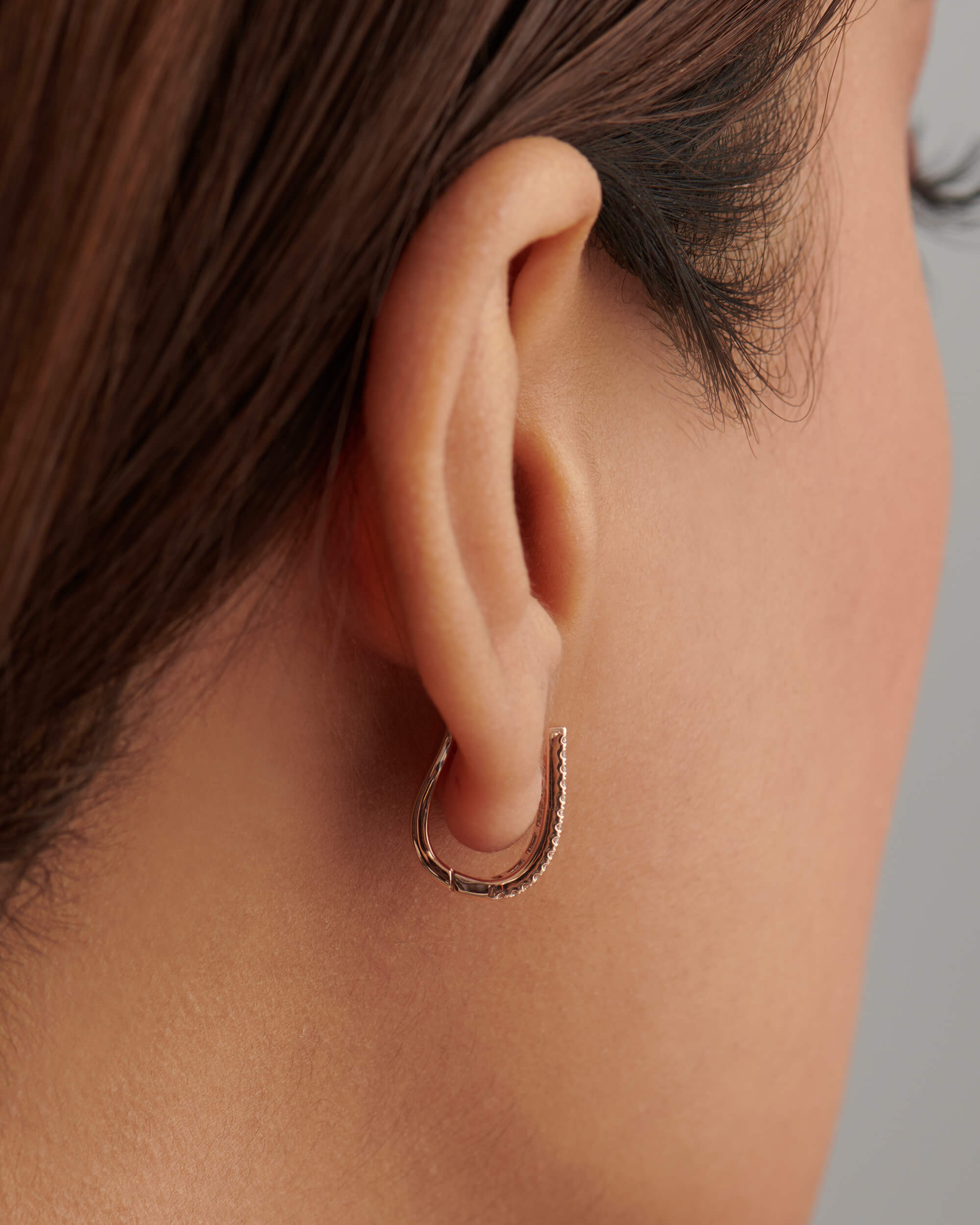 The Baguette & Round Diamond U Shaped Huggies are crafted in solid gold with baguette diamonds in channel setting and round diamonds in gold pave setting which is chic and stylish at the same time. Perfect for everyday wear these earrings come with hinged clasp.