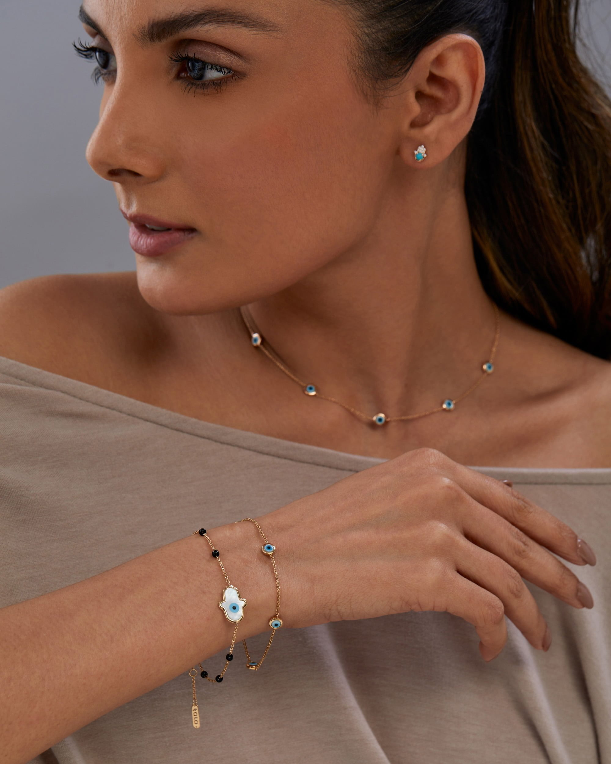The tiny evil eye beads are bezel set.