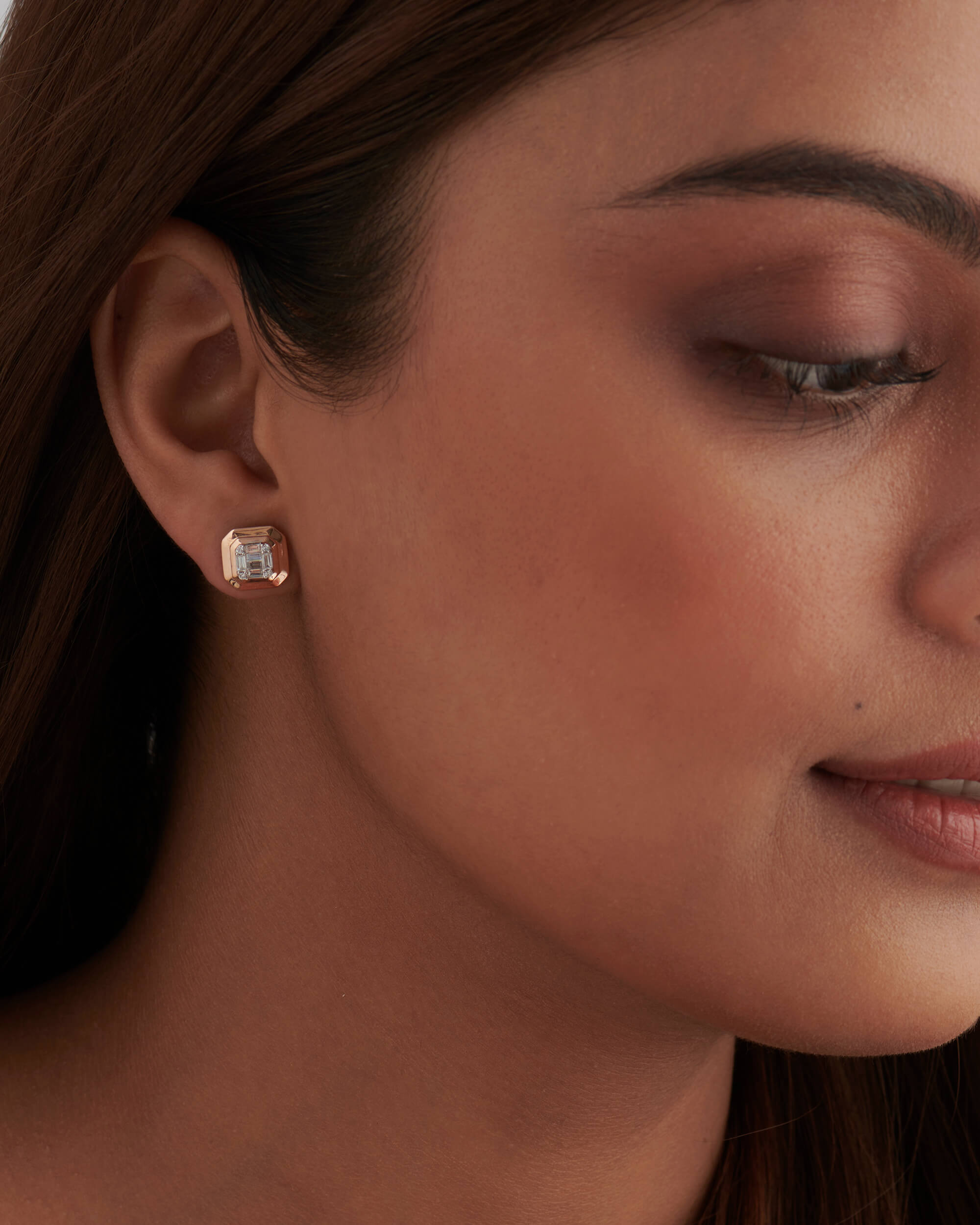 The Bold Gold Frame & Diamond Studs are crafted in solid gold with the composite set baguette diamonds in centre giving an illusion of a single sparkling rock.