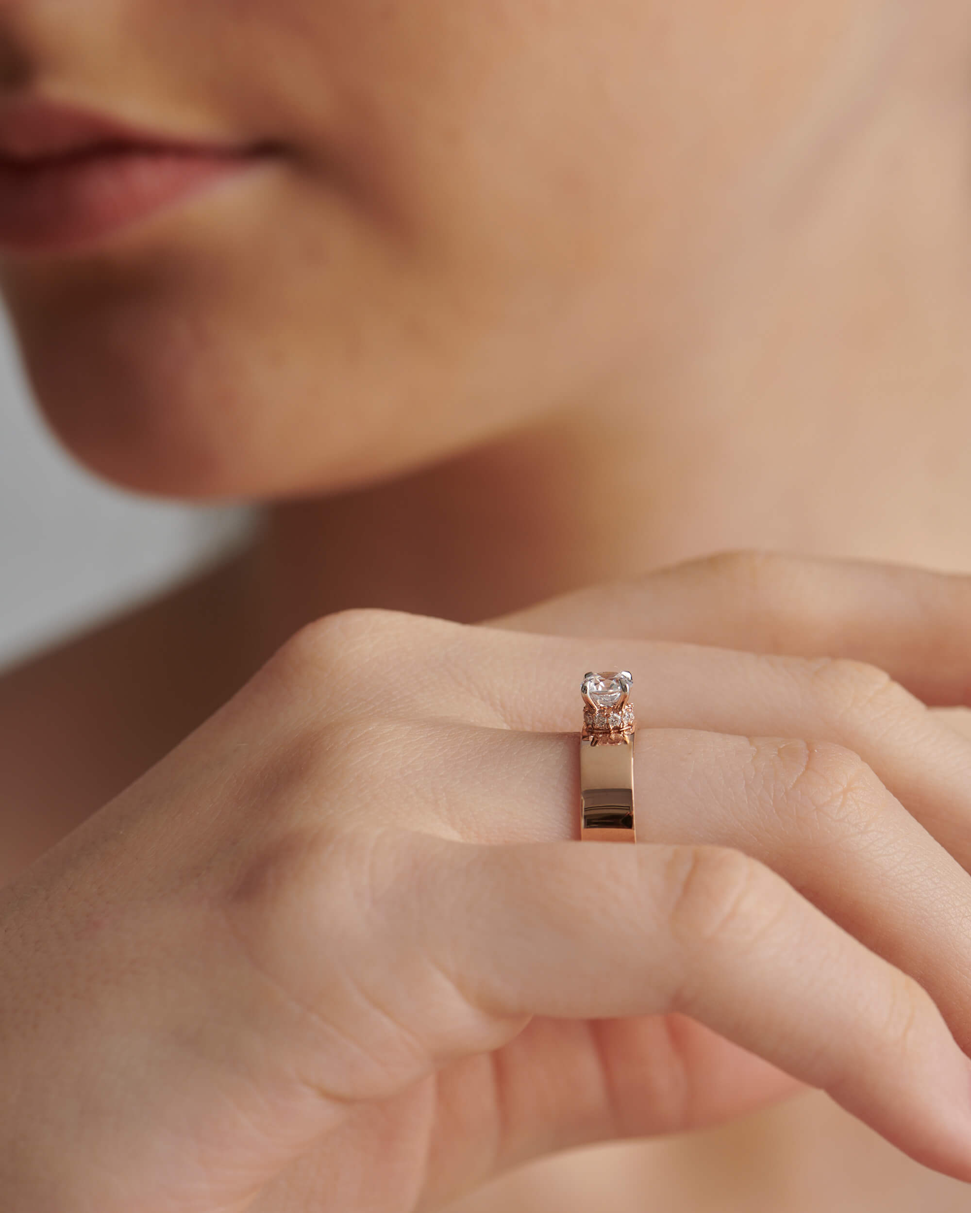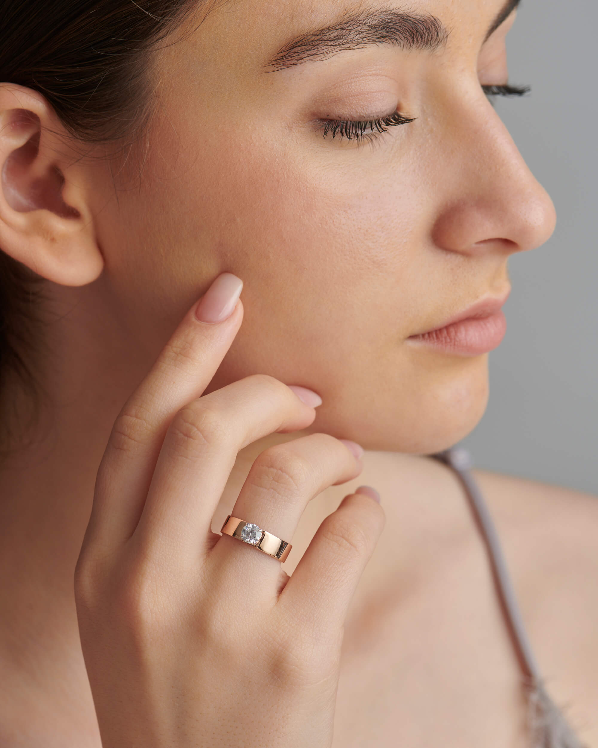 This Bold Gold Hidden Halo, Round Solitaire Ring is a clean and contemporary design with four prongs holding the centre round solitaire snugly from all sides. A wide band of polished gold provides a dramatic appearance and substantial feel. Tucked beneath the band,a hidden diamond halo shimmers whihc completes the look of this ring.
