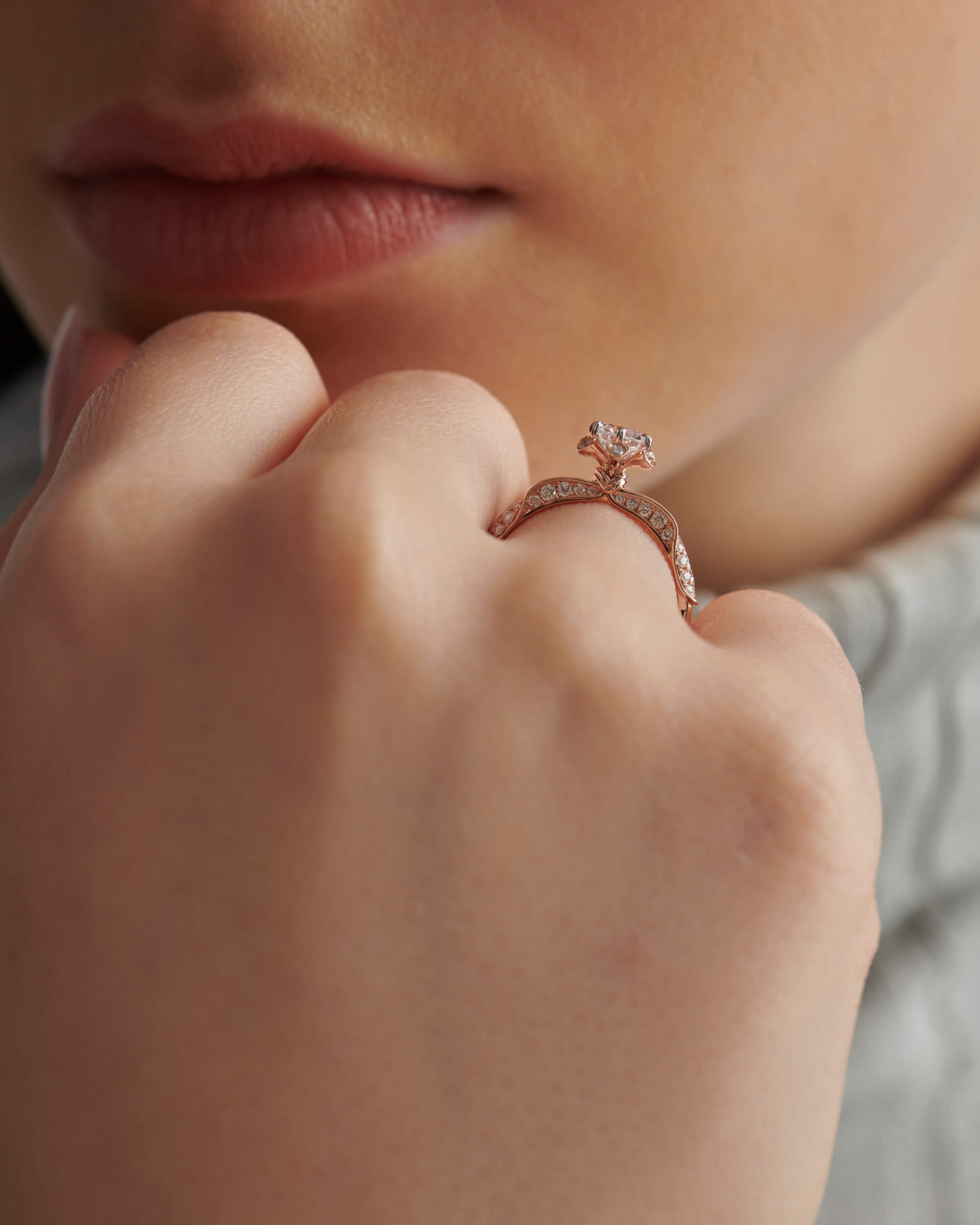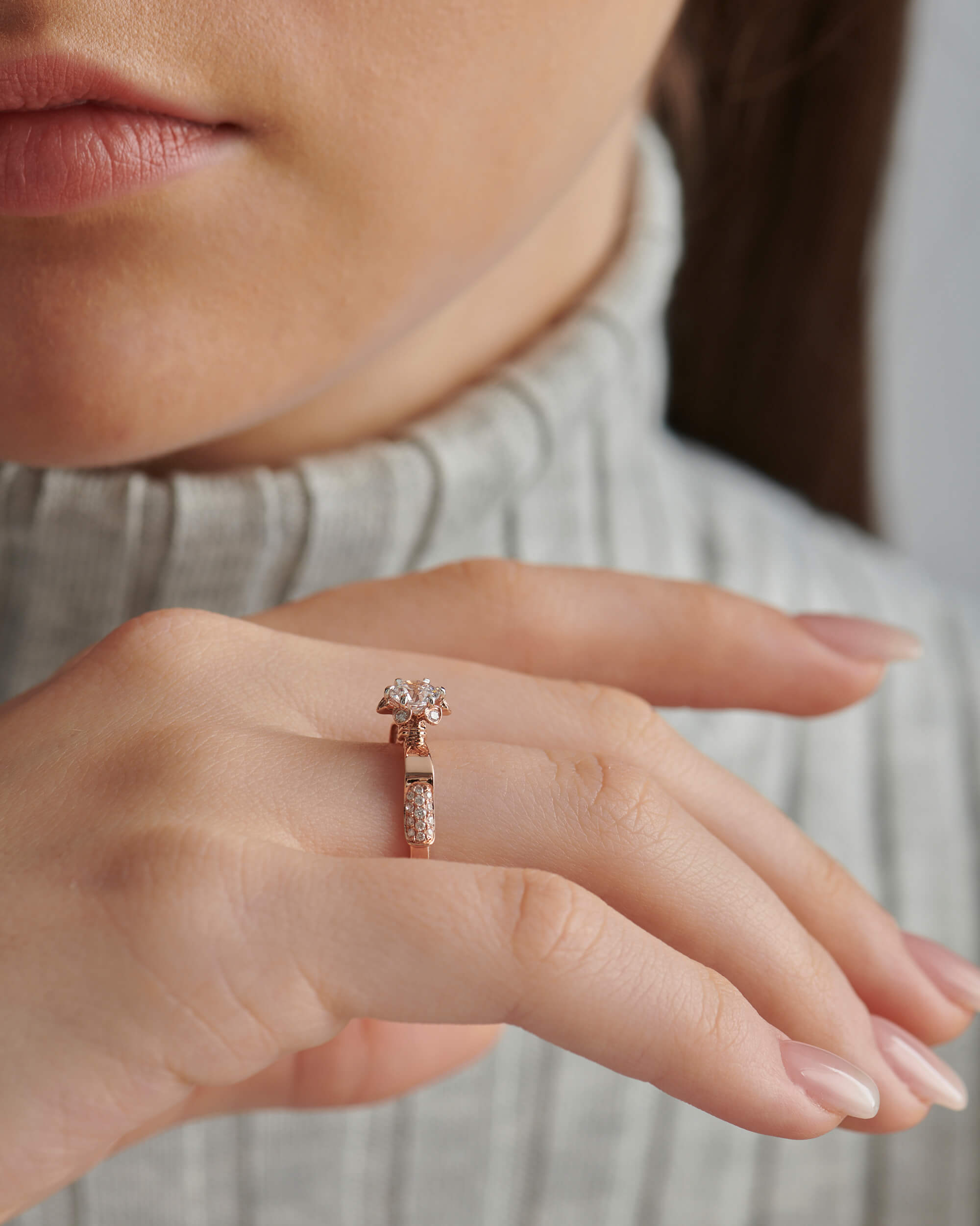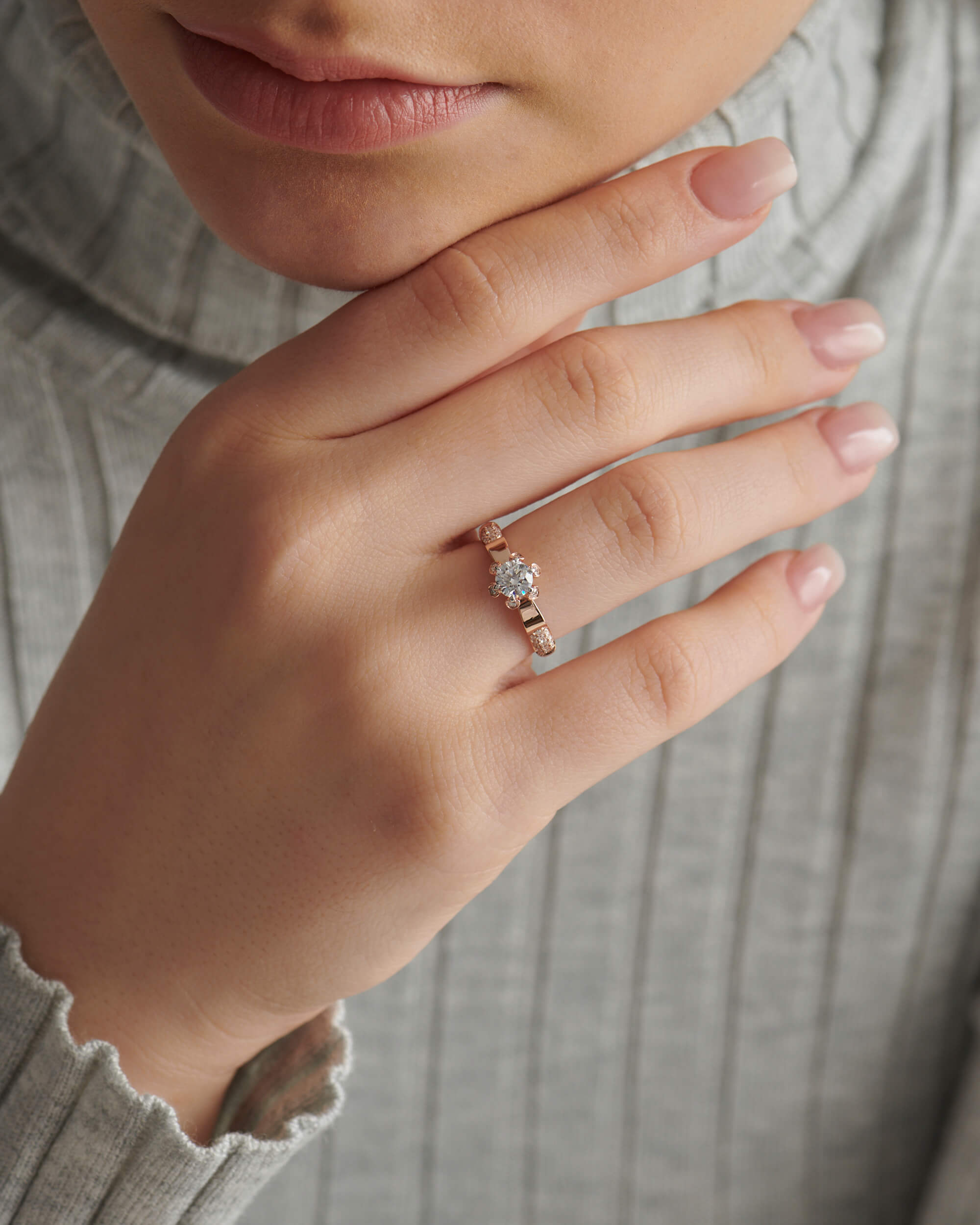 Radiating grace, the Bouquet Gold and Diamond, Round Solitaire Ring features center round solitaire nestled within the embrace of six prong and delicately sculpted diamonds set in heart shaped petals. The diamond blooms like a radiant flower, evoking a sense of sophistication and grace.