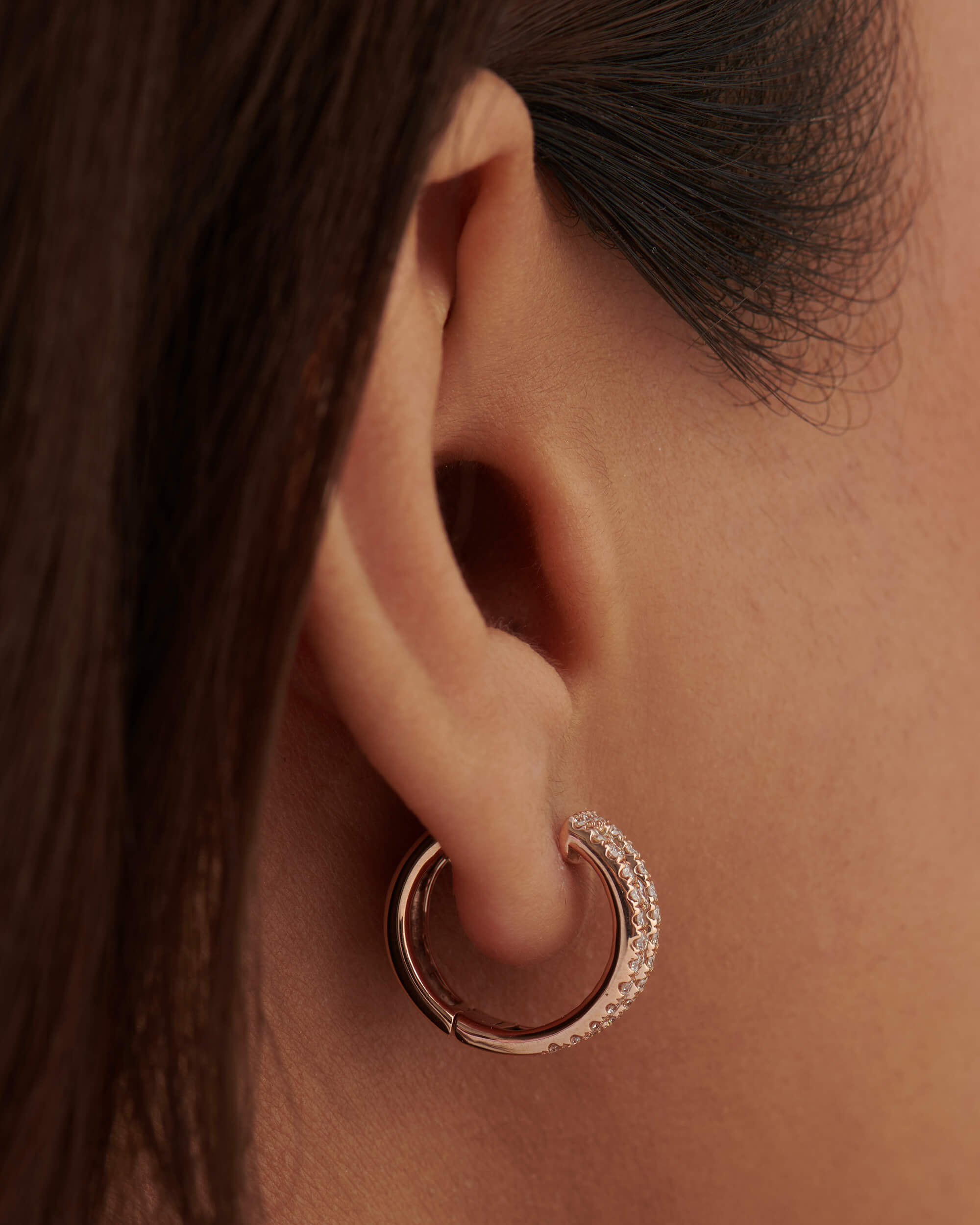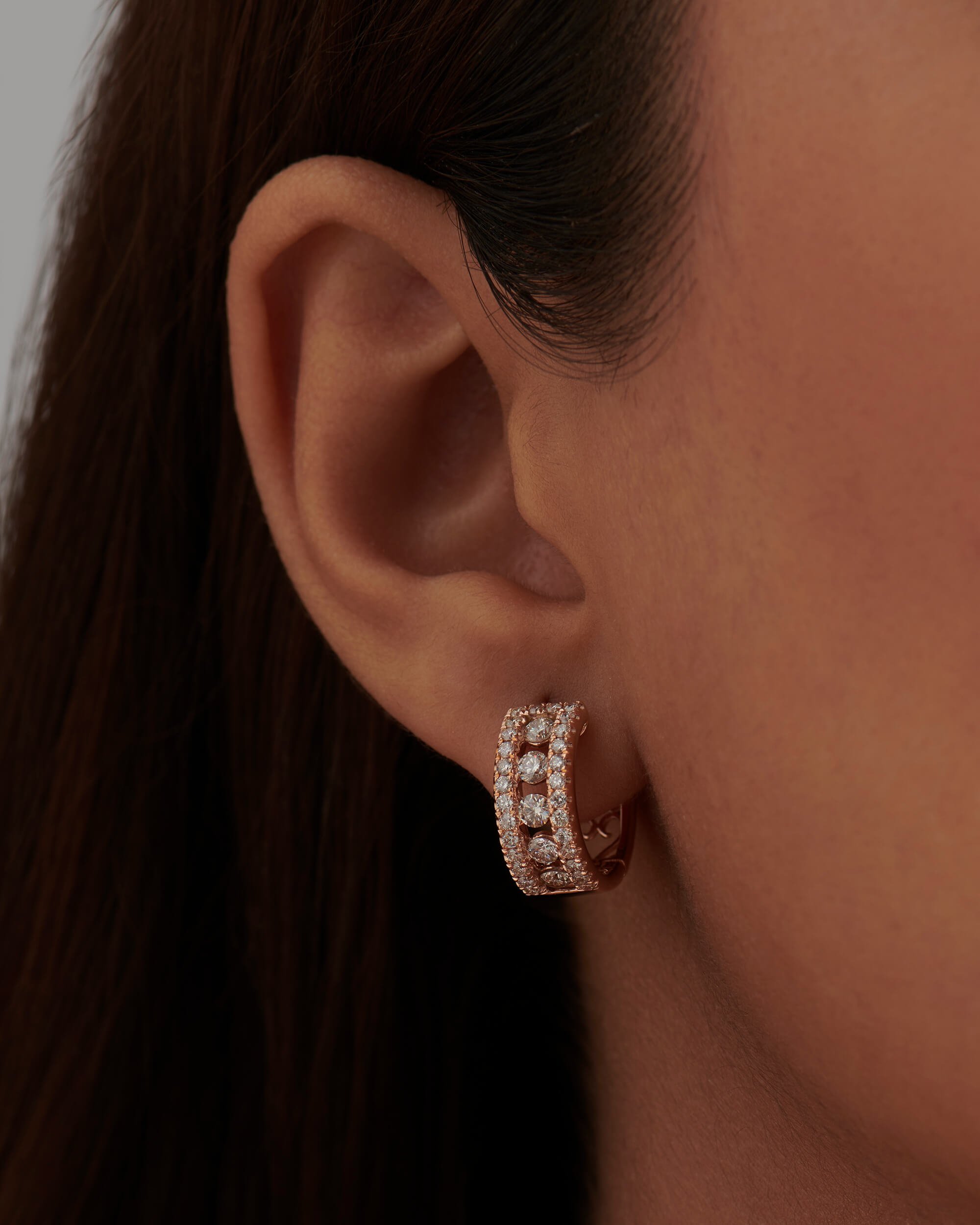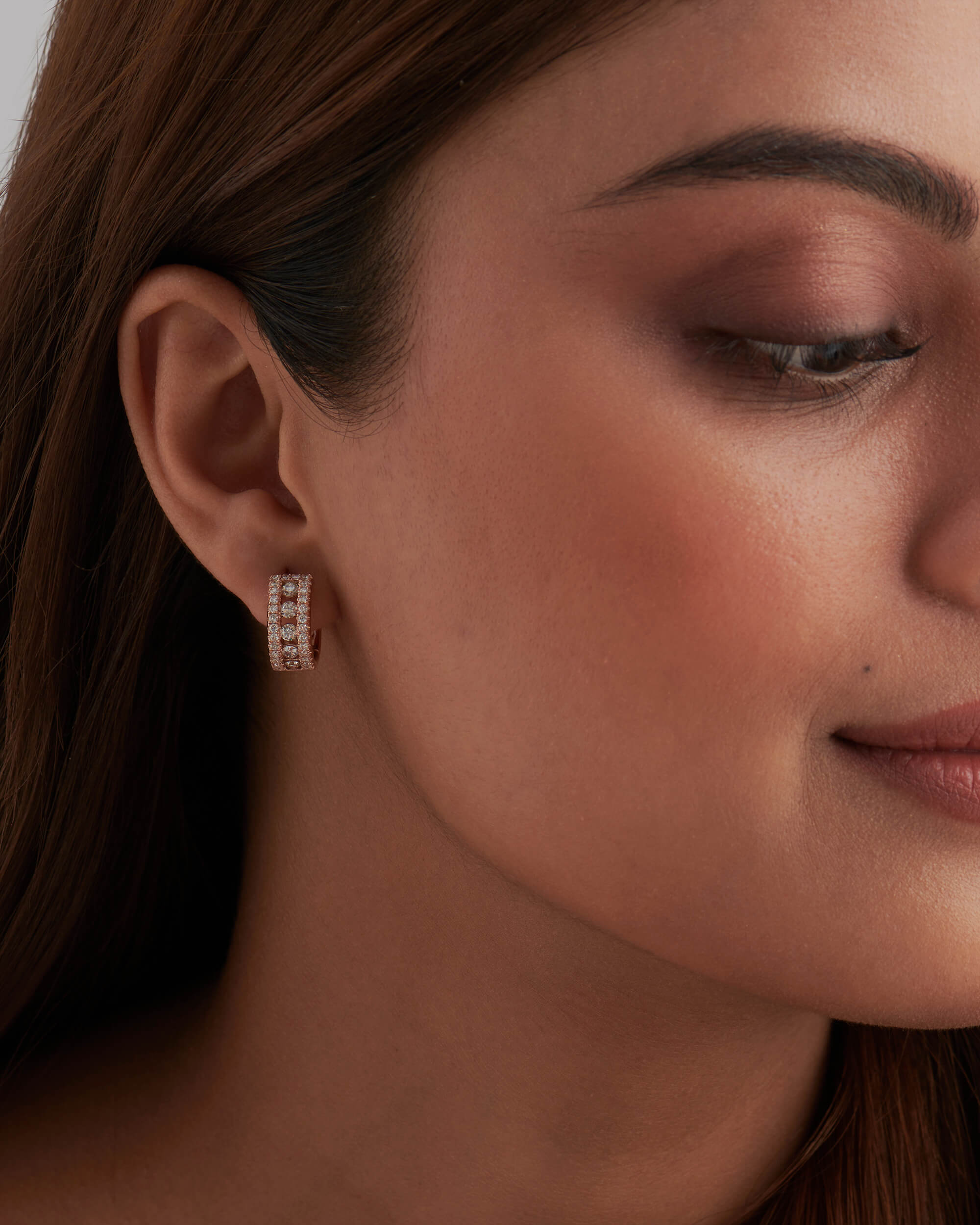 The Channel Set Triple Row Diamond Hoops is crafted in solid gold with centre row round diamonds in channel setting and side diamonds in gold pave setting which is chic and stylish at the same time.