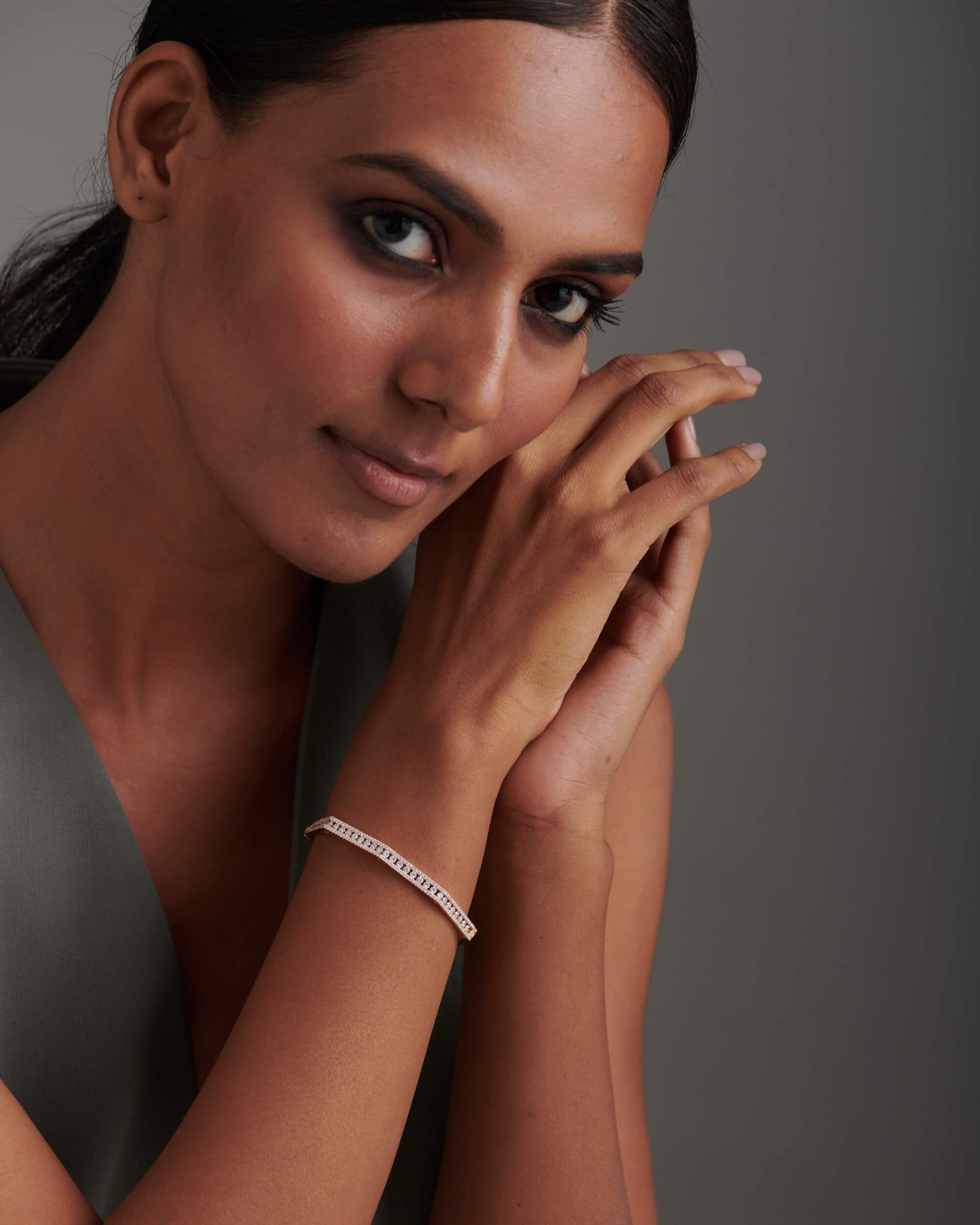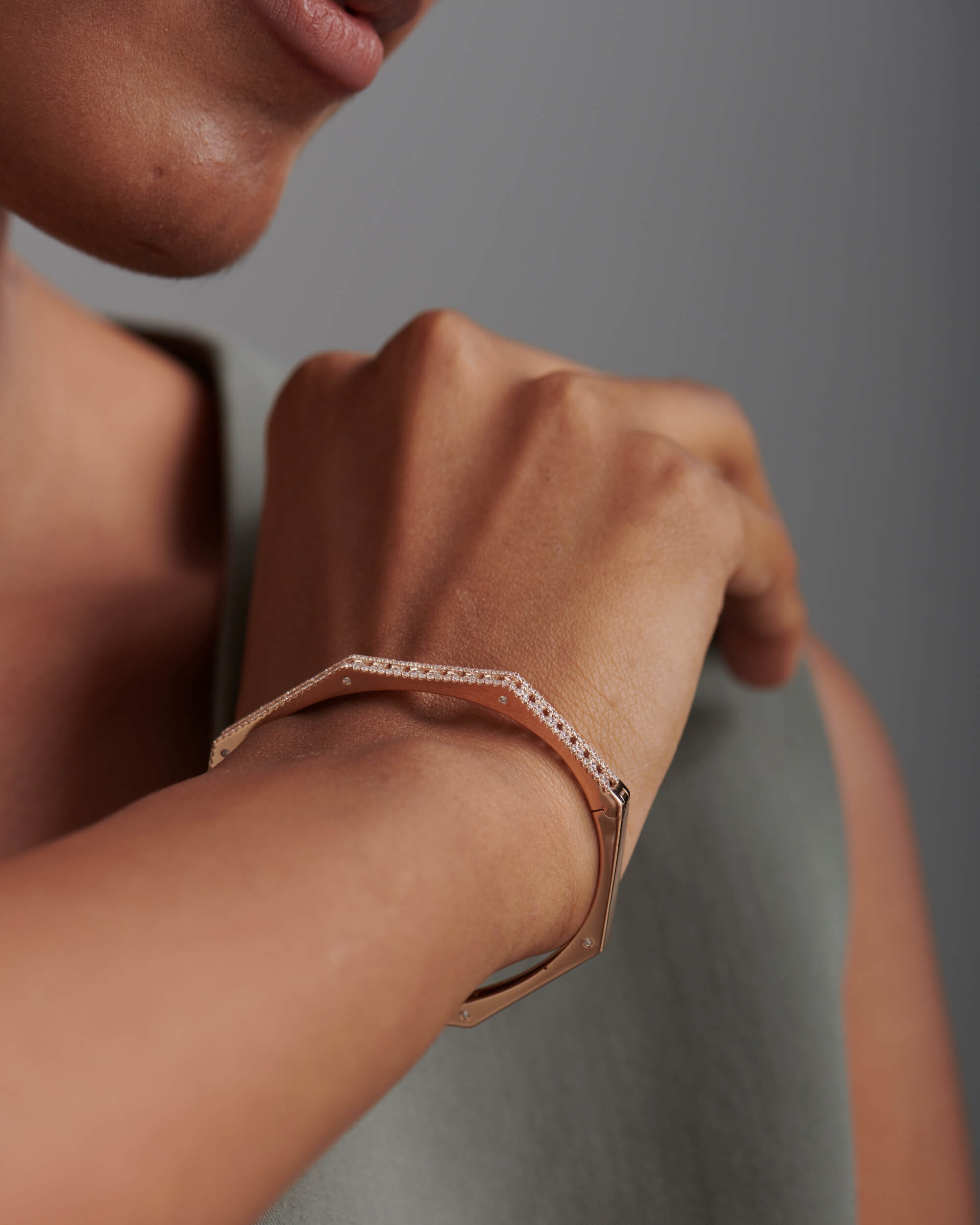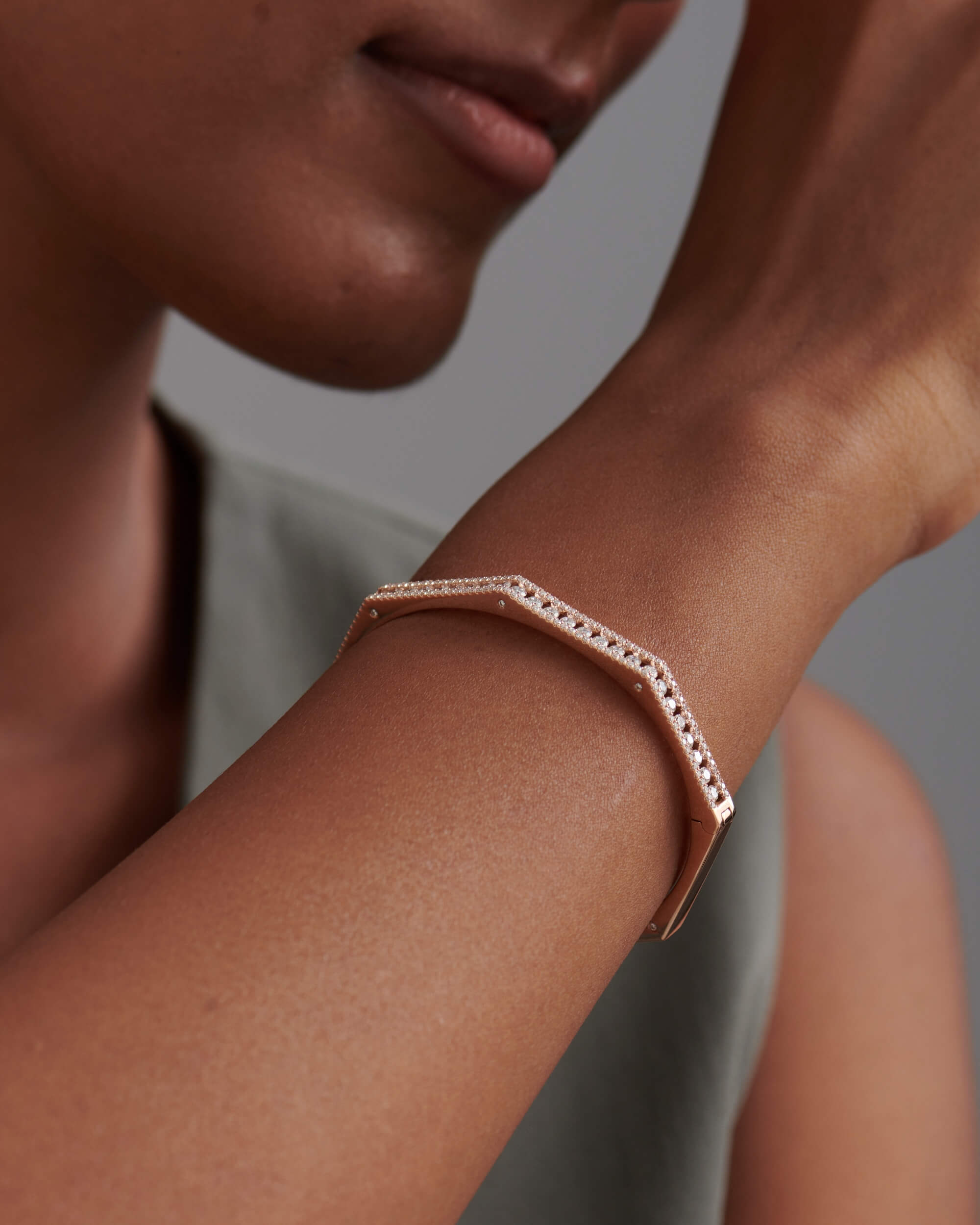 This solid gold Channel Set Triple Row Diamond Octagon Bangle offers a touch of dimension, featuring three rows of diamonds with a larger center row and petite pave borders. Its heavier weight also makes it more durable for everyday wear. If you’re looking for a piece that stands out while still maintaining a classic look, this bangle could be a great option.
