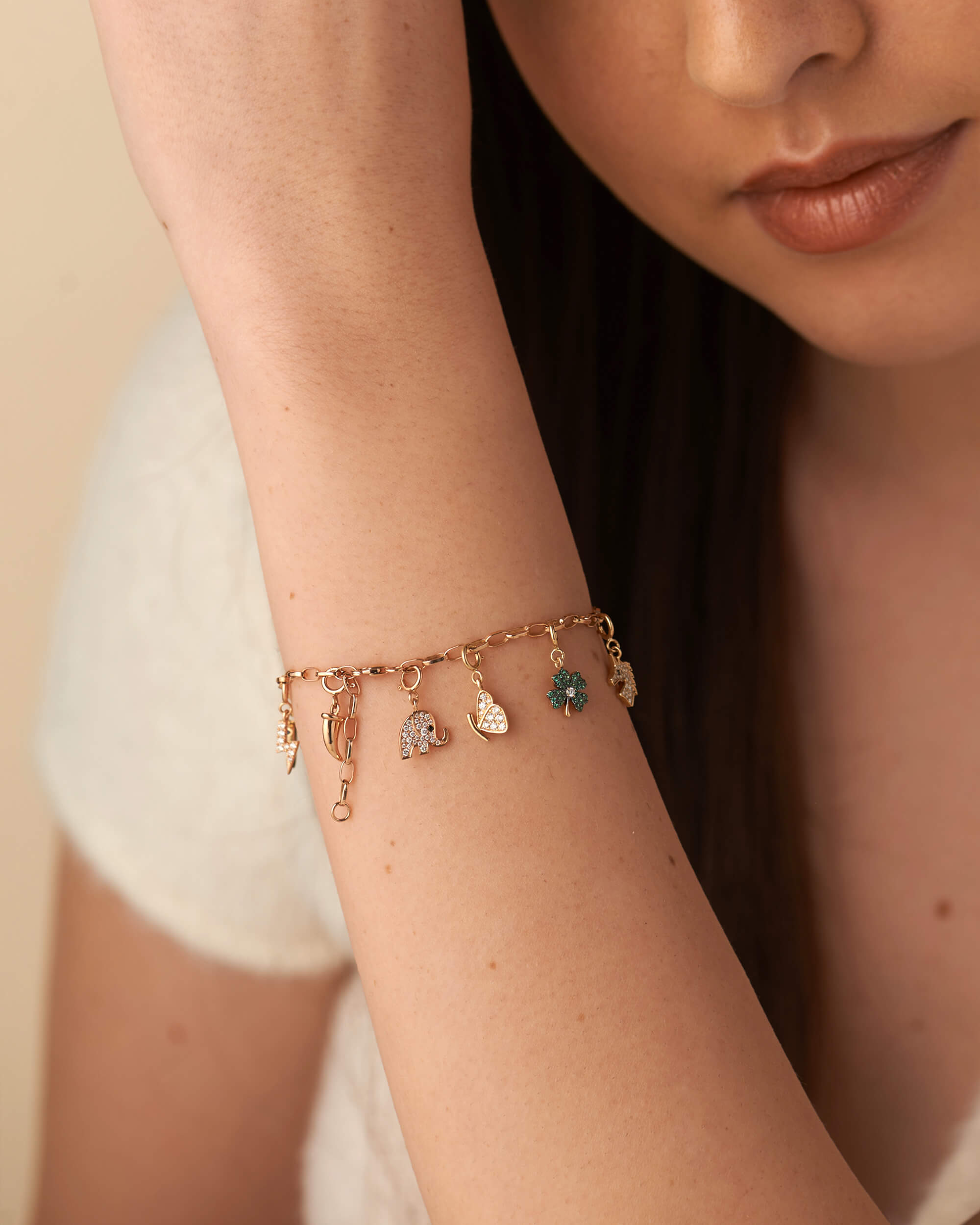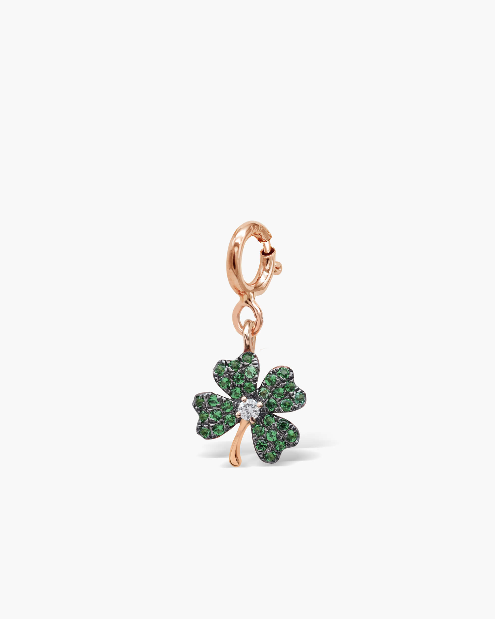 Wear this Clover Charm / Pendant, a symbol of hope and good luck. Handcrafted in solid gold and pave set green coloured synthetic gemstones.
