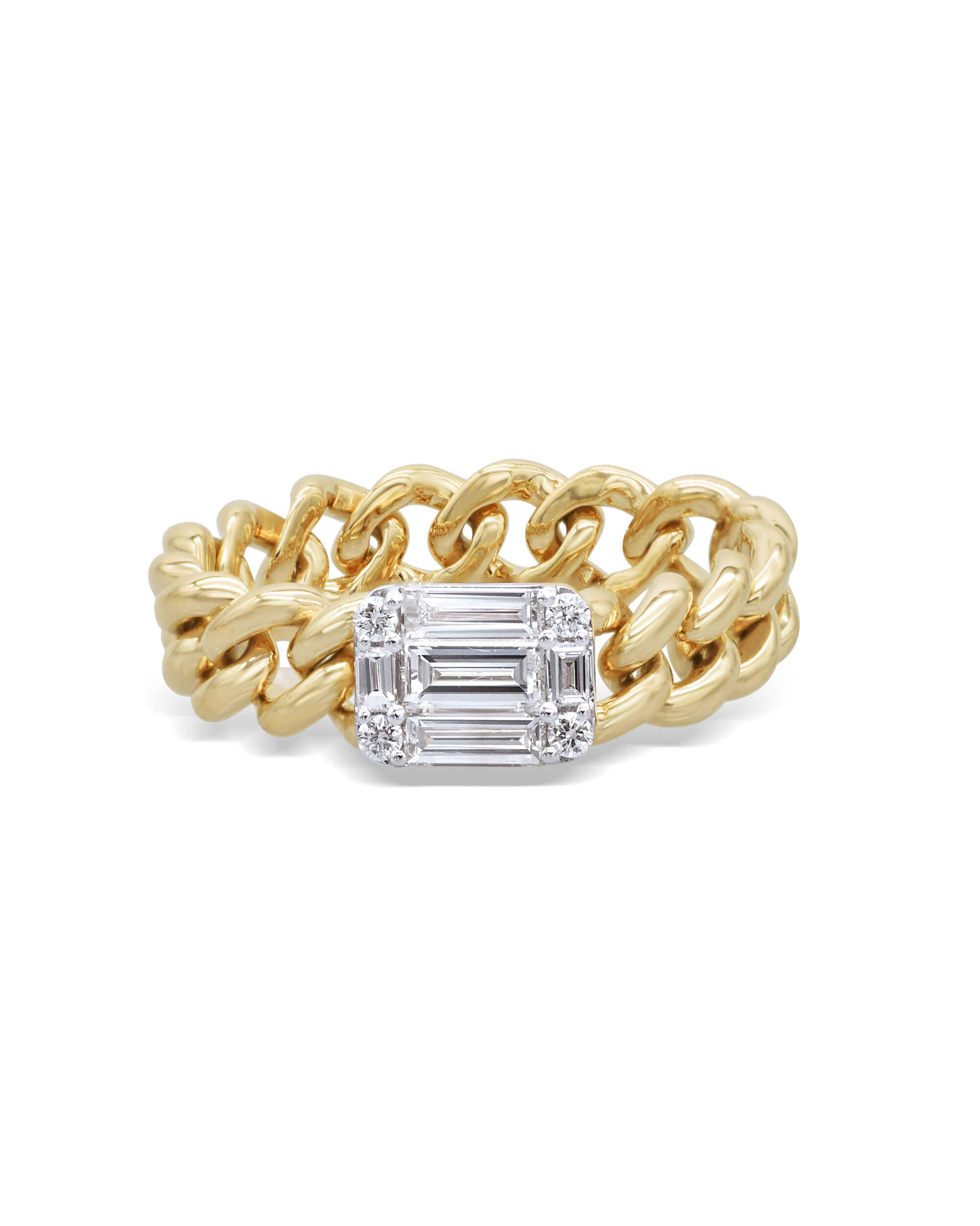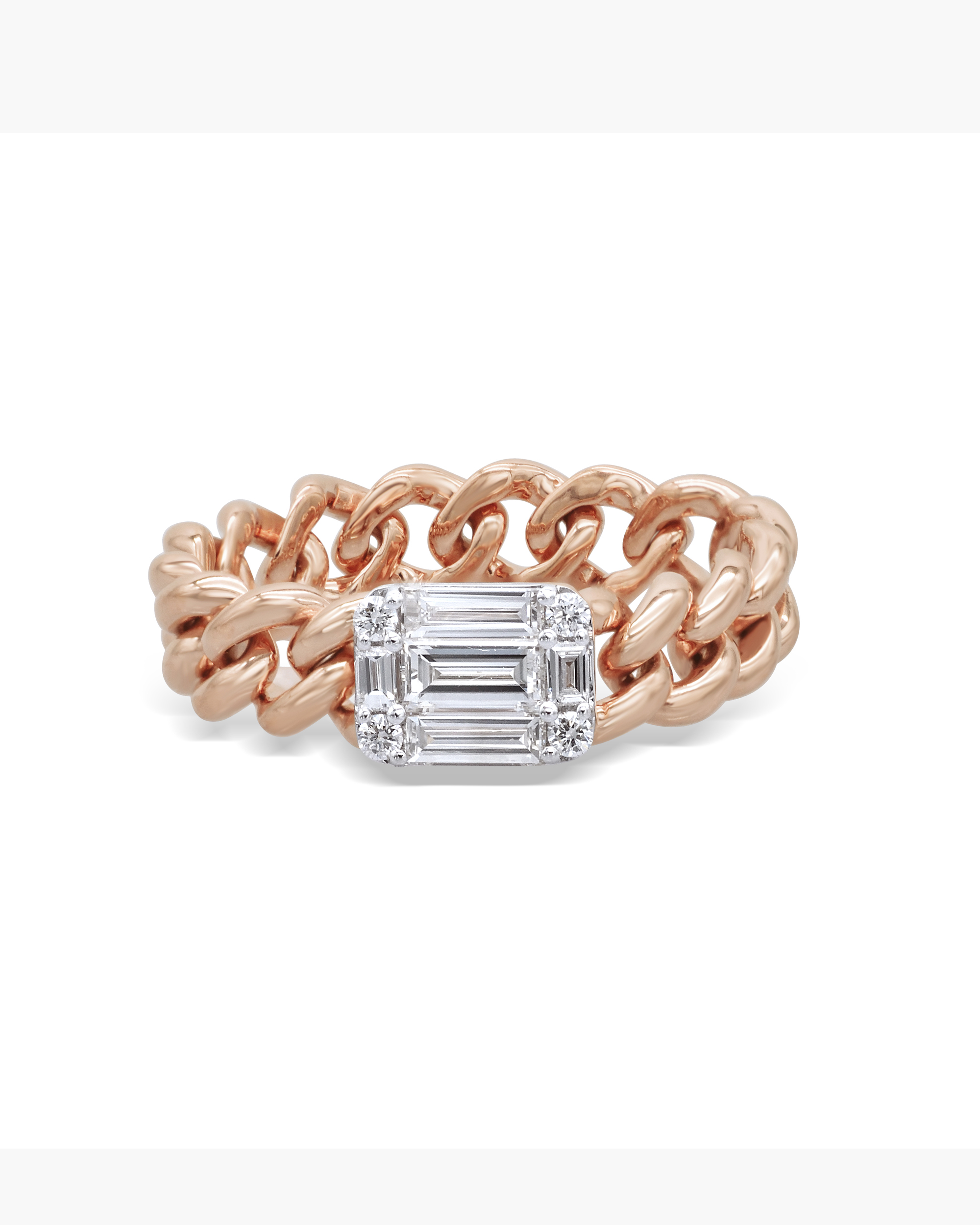 This Composite Baguette Solitaire Cuban Chain Ring features a large eye-catching cluster of baguette and round-cuts diamonds in the centre giving an emerald cut solitaire look of size (approximately 8x6mm), set into a chic Cuban chain design made from flexible links.