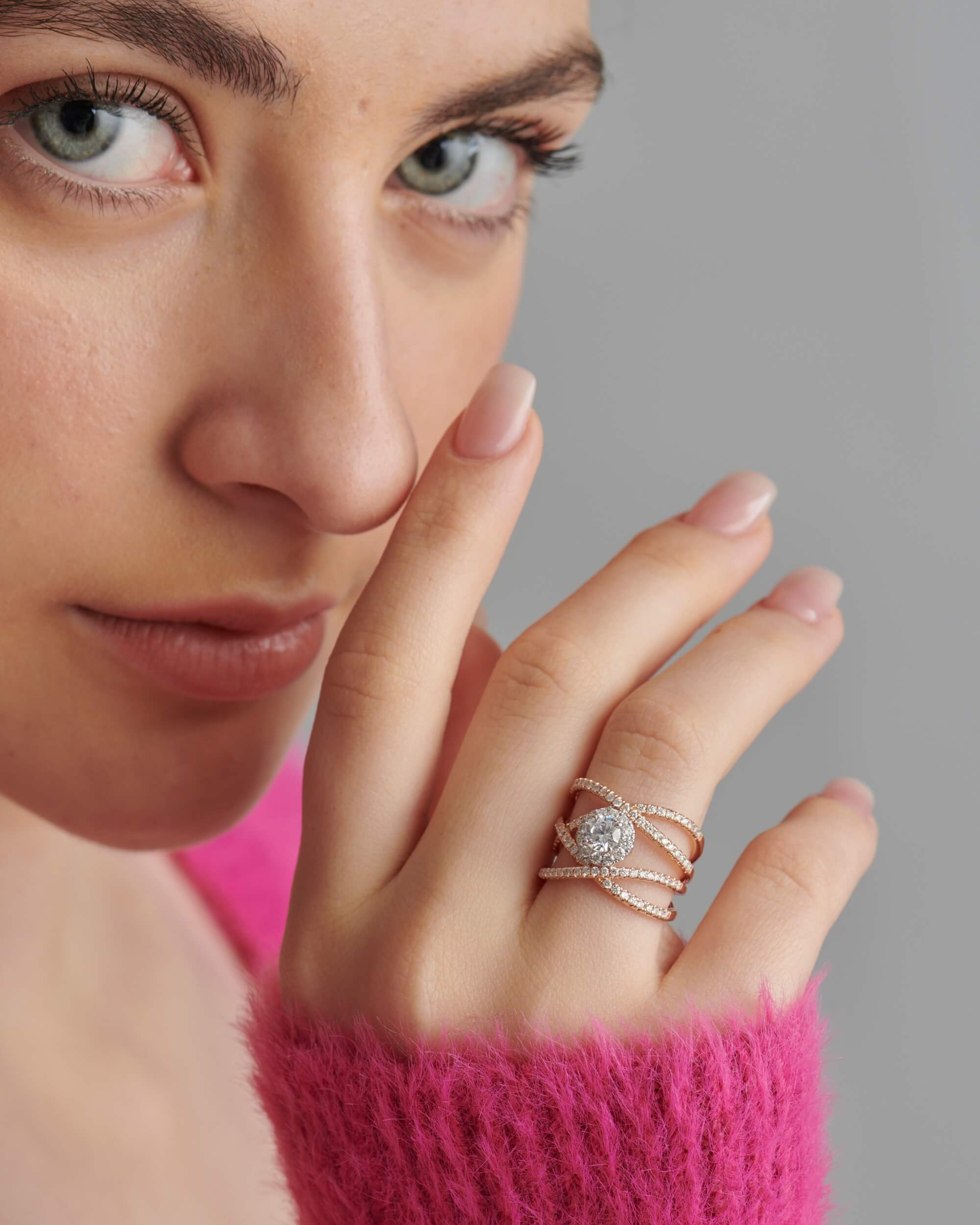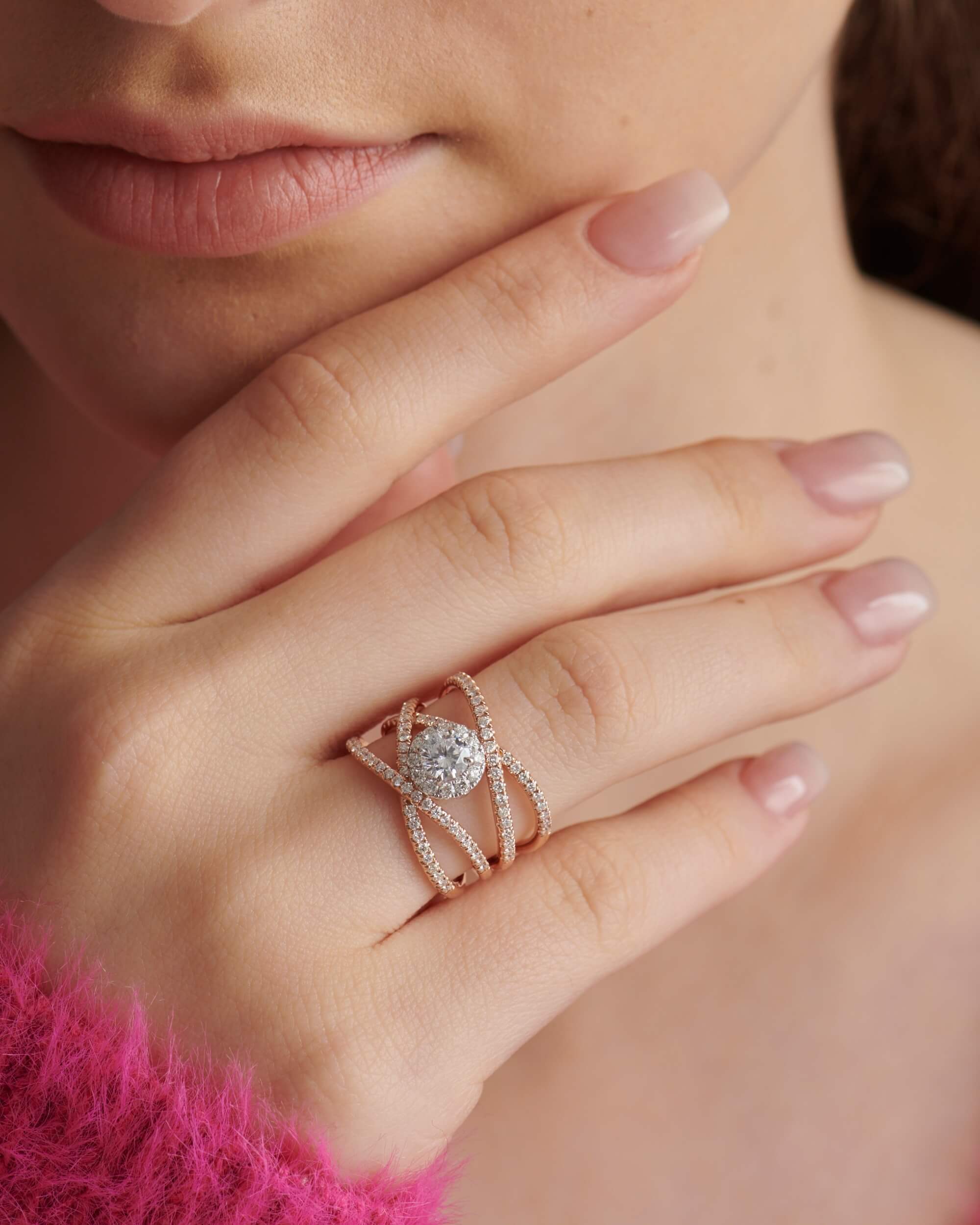 Criss-Cross Diamond Halo, Round Solitaire Ring