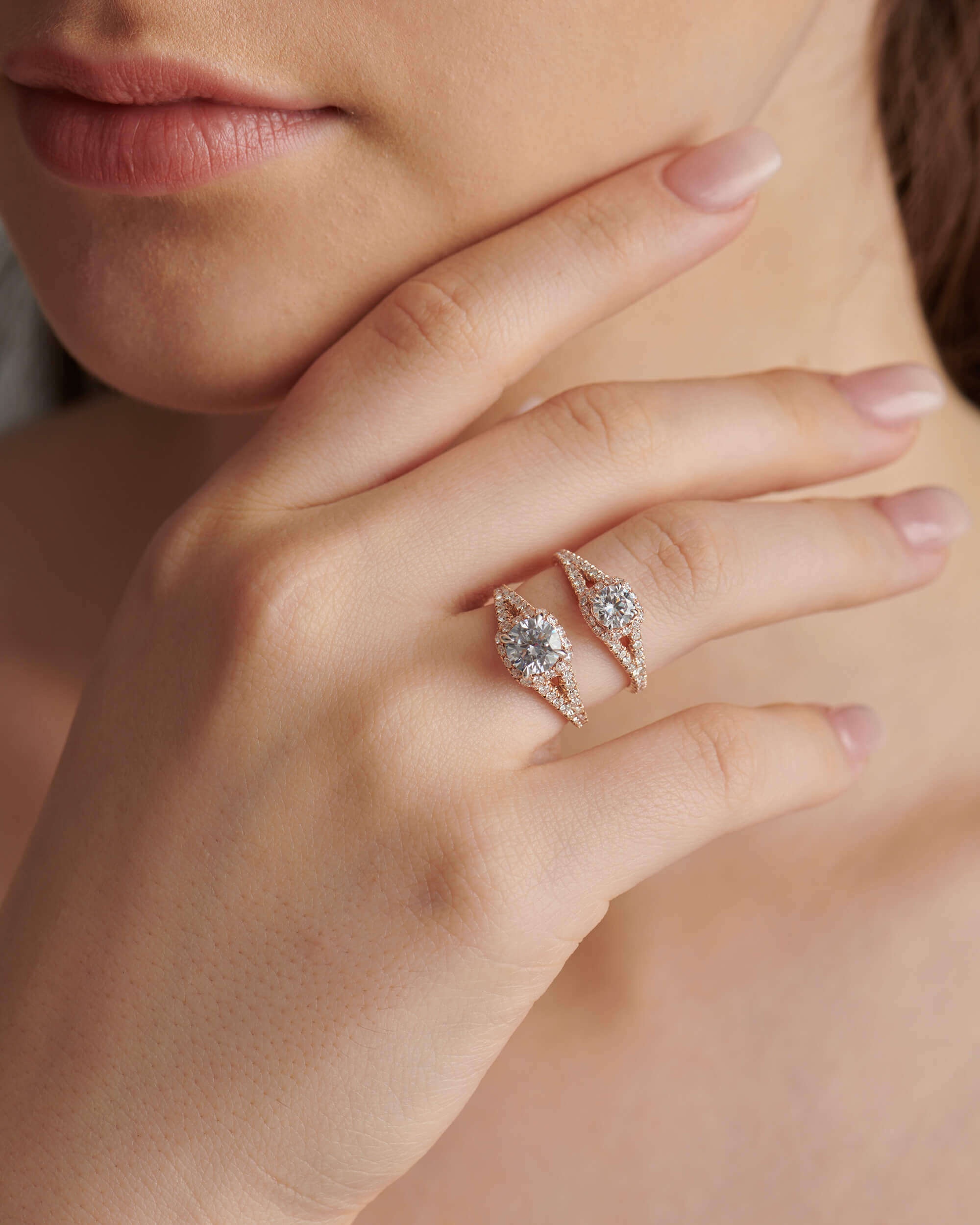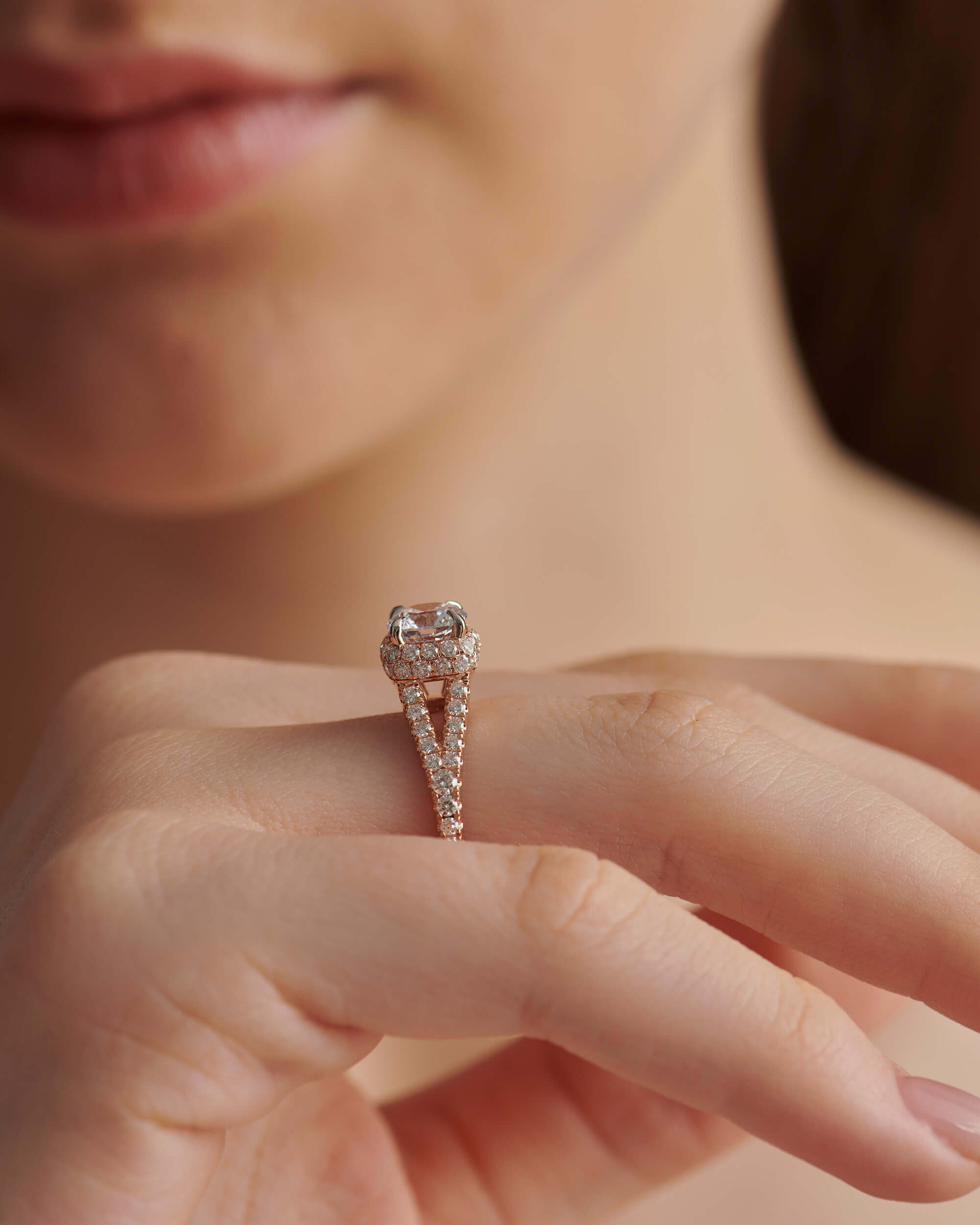 The Cushion Double Edge Halo, Split Shank, Round Solitaire Ring features a round brilliant-cut diamond wrapped in a stunning double edge cushion-shaped halo. The ring’s split cathedral shank is adorned with micro-prong set diamonds, adding to its elegance.