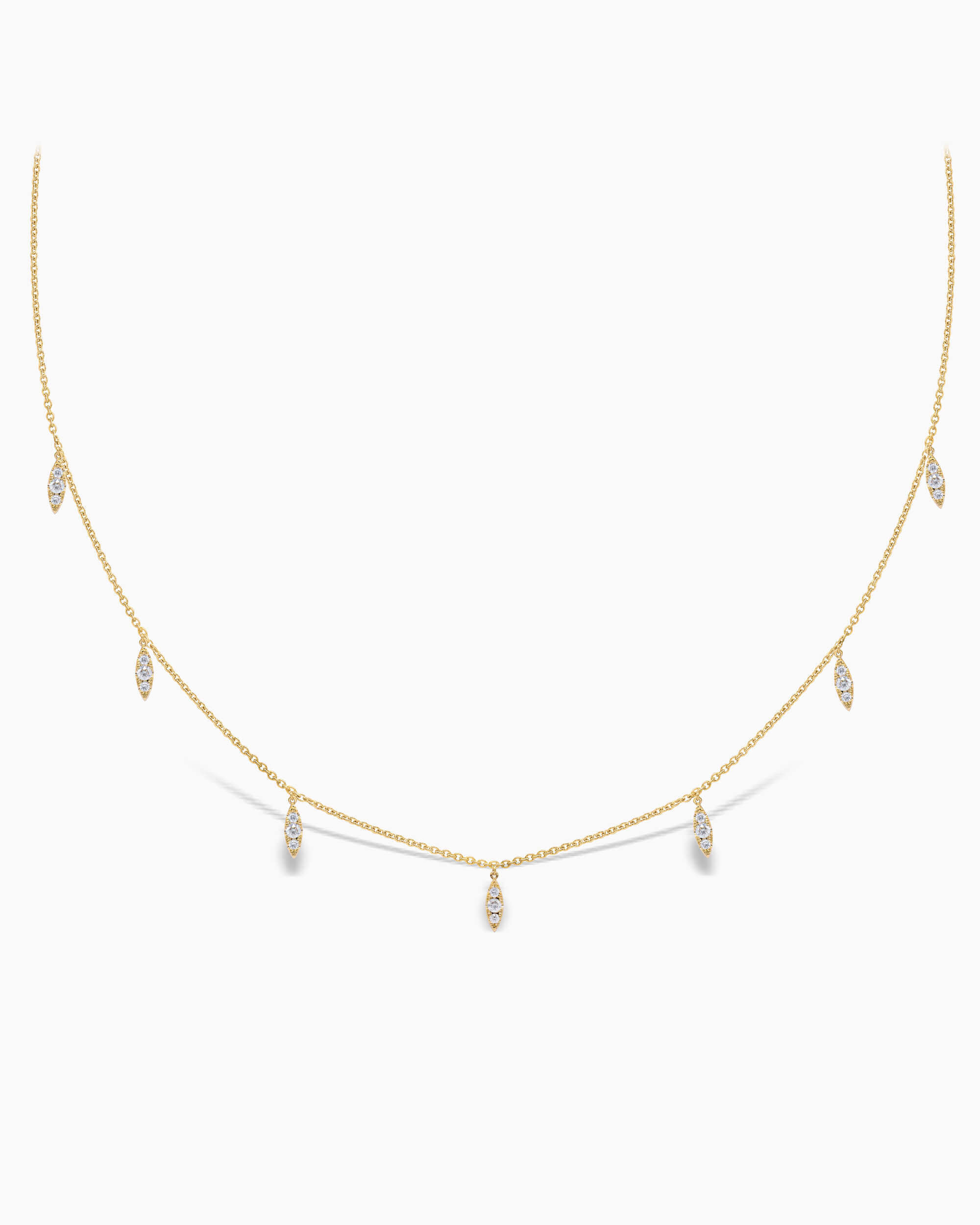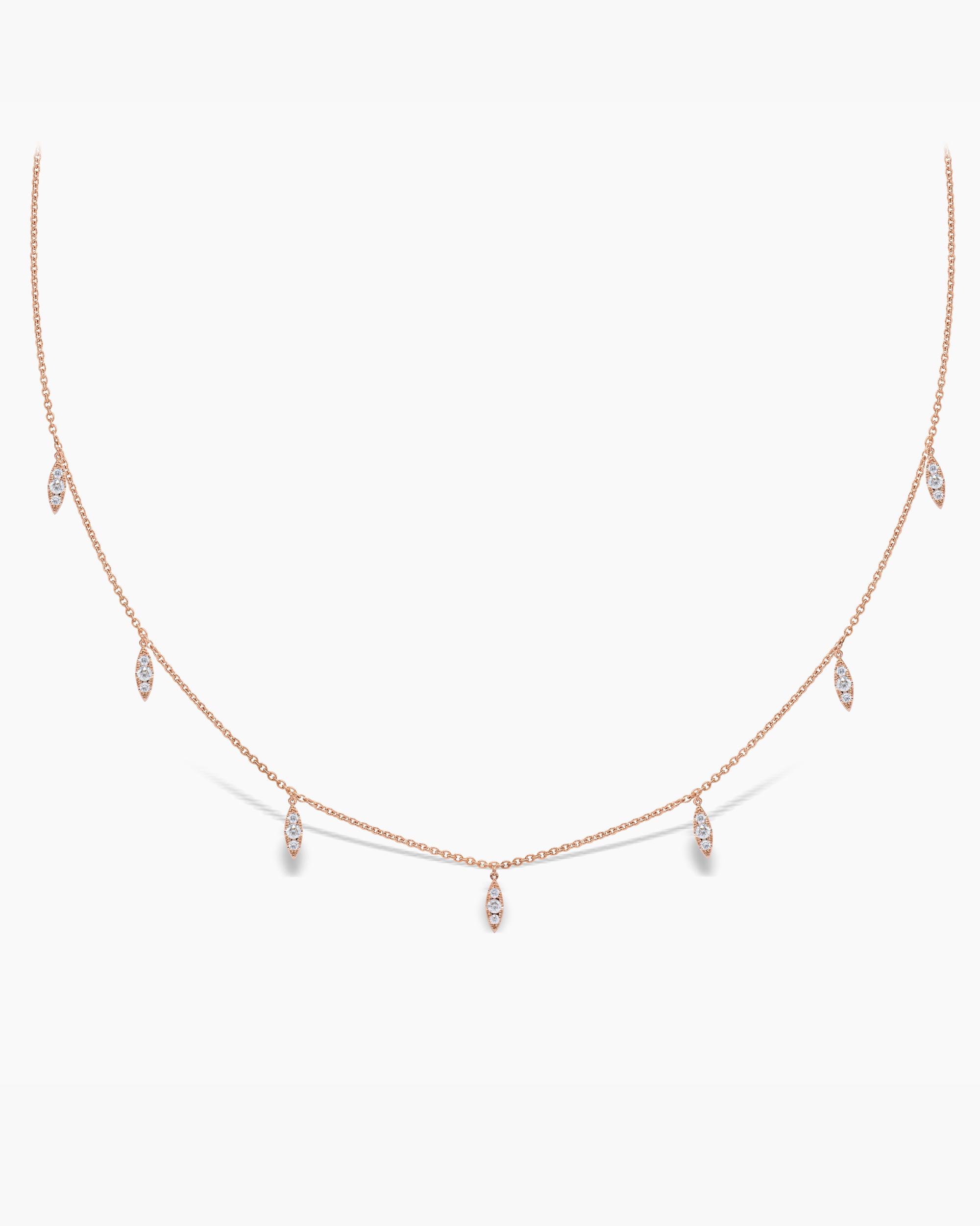 Delicate yet slightly edgy. This delicate Dangling Diamond Leaf Drop Necklace features 7 shimmering leaf shaped stations set in sparkling micro pave diamonds, which dangle from the chain elegantly. The necklace is secured by a spring ring which allows you to adjust the length by 1” + or – the ordered size.