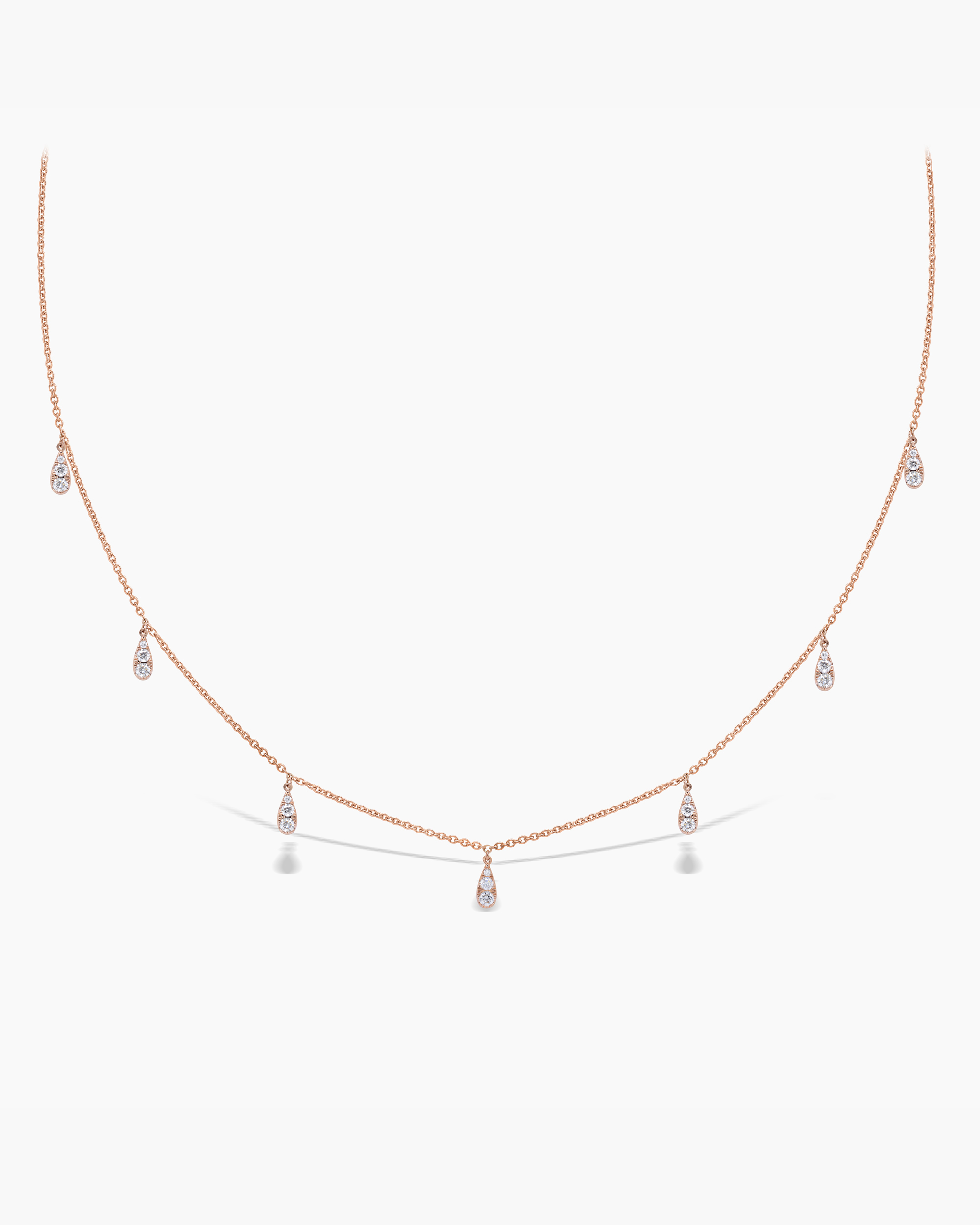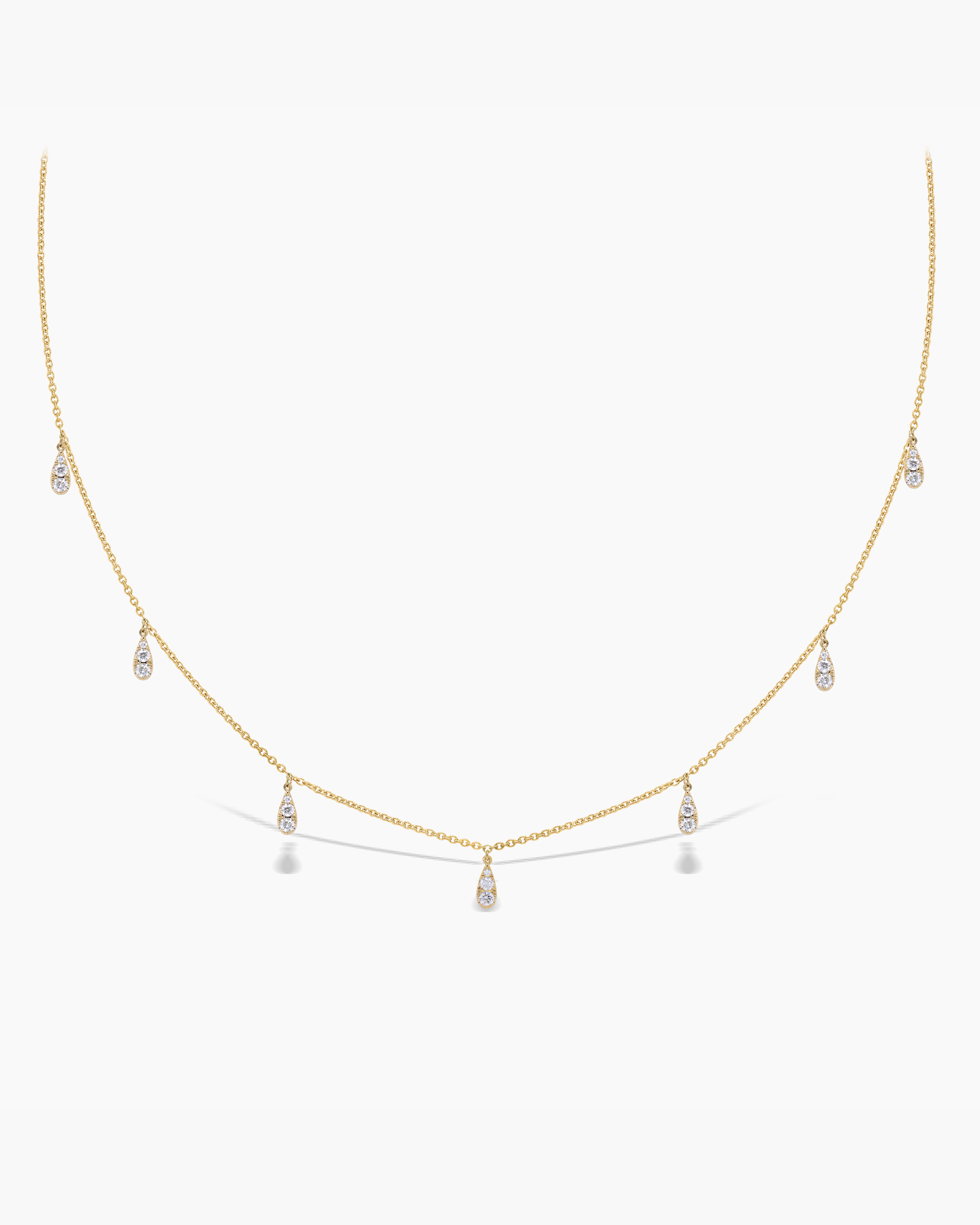 Great solo or as a dainty layering necklace, this Dangling Diamond Rain Drop Necklace adds an elegant touch to your ensemble. This necklace features 7 dangling micro pavé set diamond which are stationed at regular intervals and they dangle from the chain elegantly.