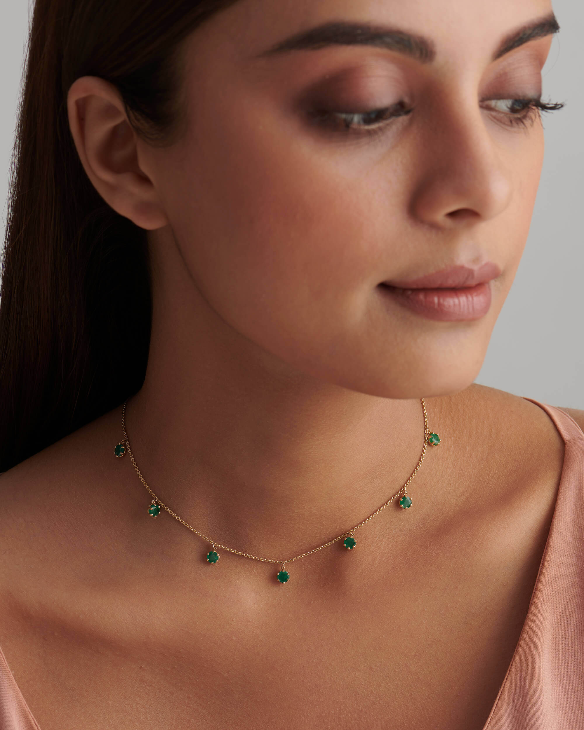 Great solo or as a dainty layering necklace, this Dangling Emerald Drop Necklace adds an elegant touch to your ensemble. This necklace features 7 dangling prong set emeralds which are stationed at regular intervals and they dangle from the chain elegantly.