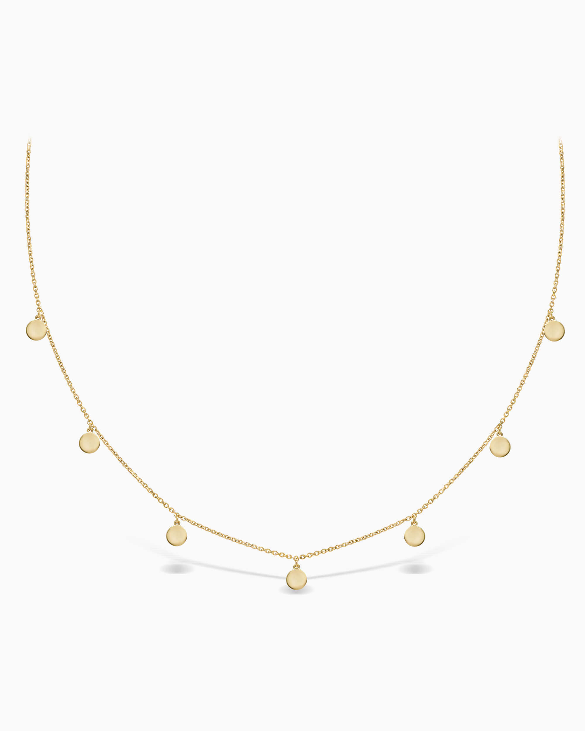 Enhance with our Dangling Gold Discs Necklace. Great to be worn solo or as a layered necklace. Buffed to a brilliant lustre, layer it up with different chain length of your choice. The necklace is secured by a spring ring which allows you to adjust the length by 1” + or – the ordered size.