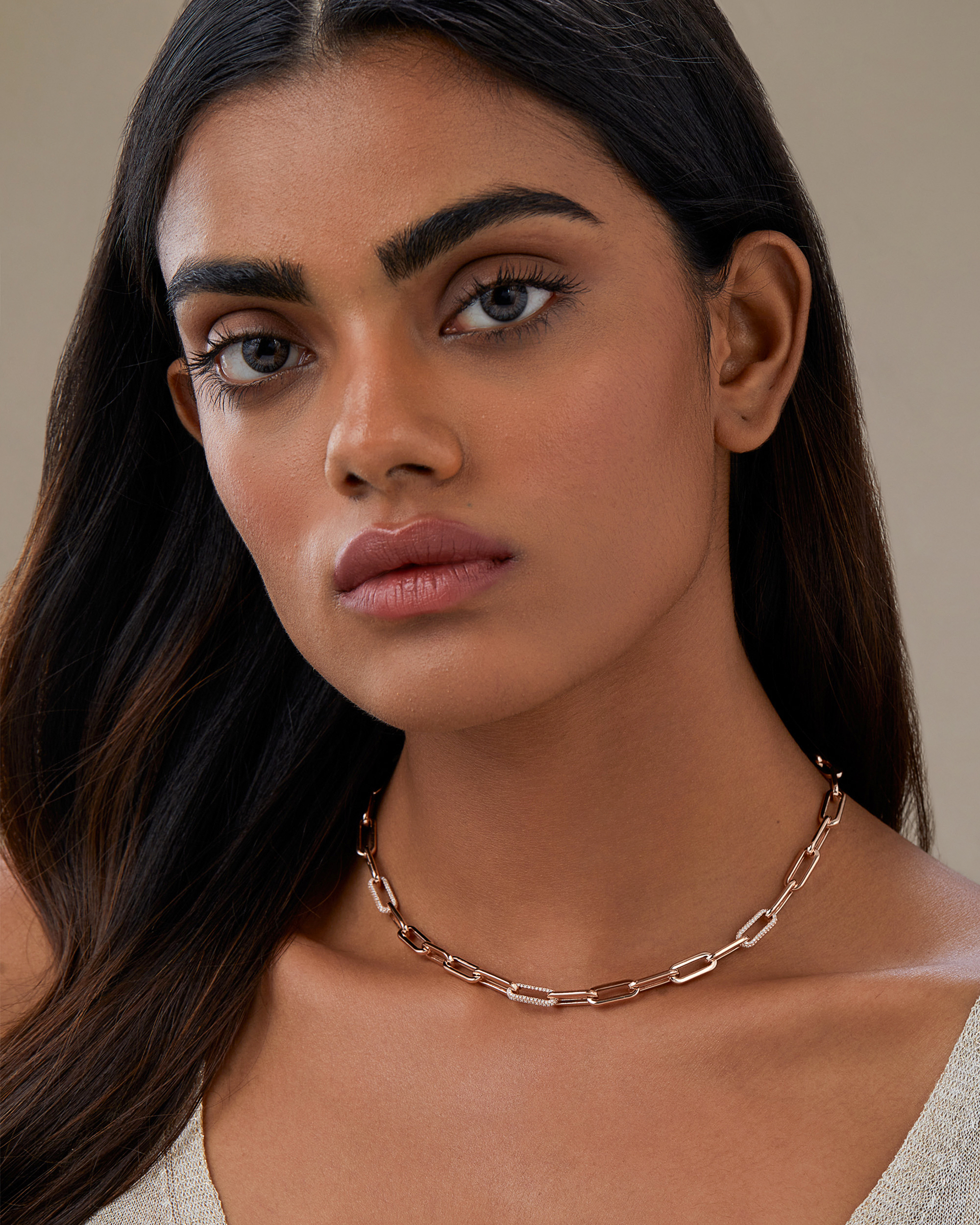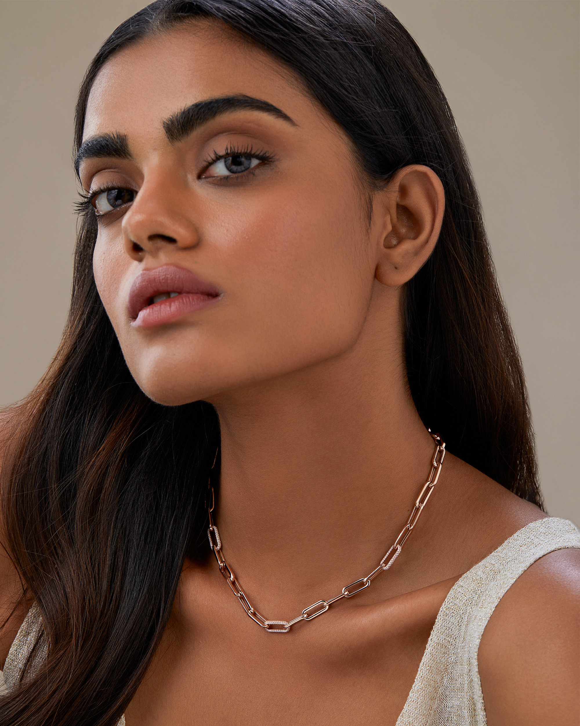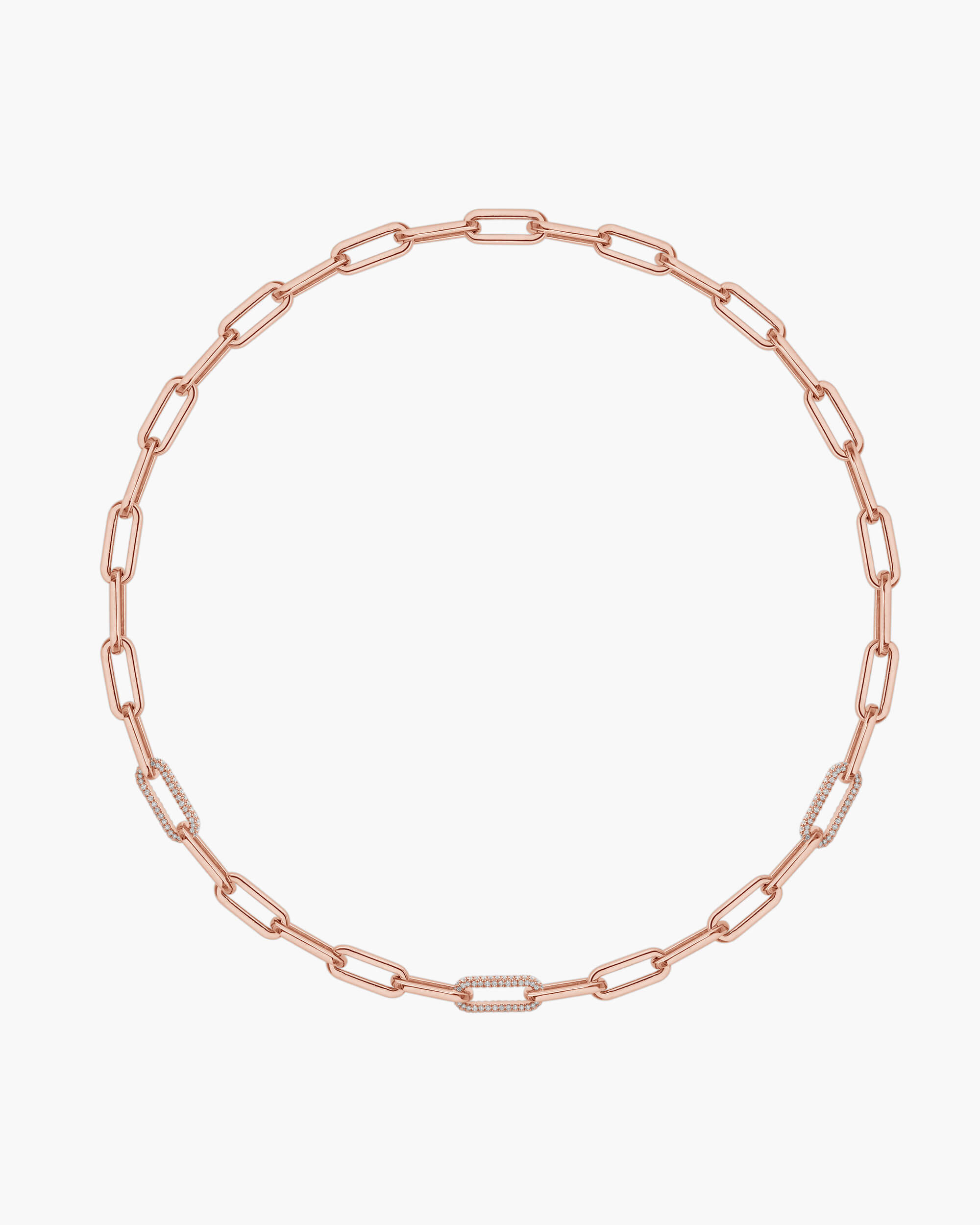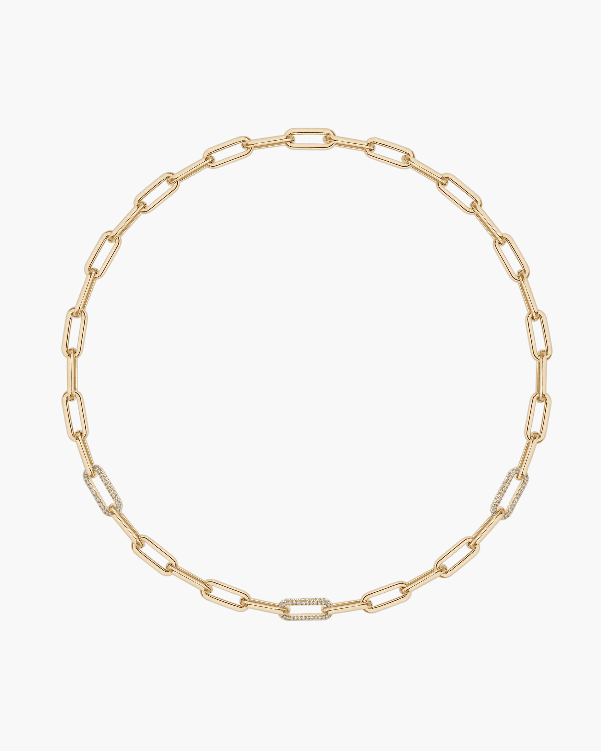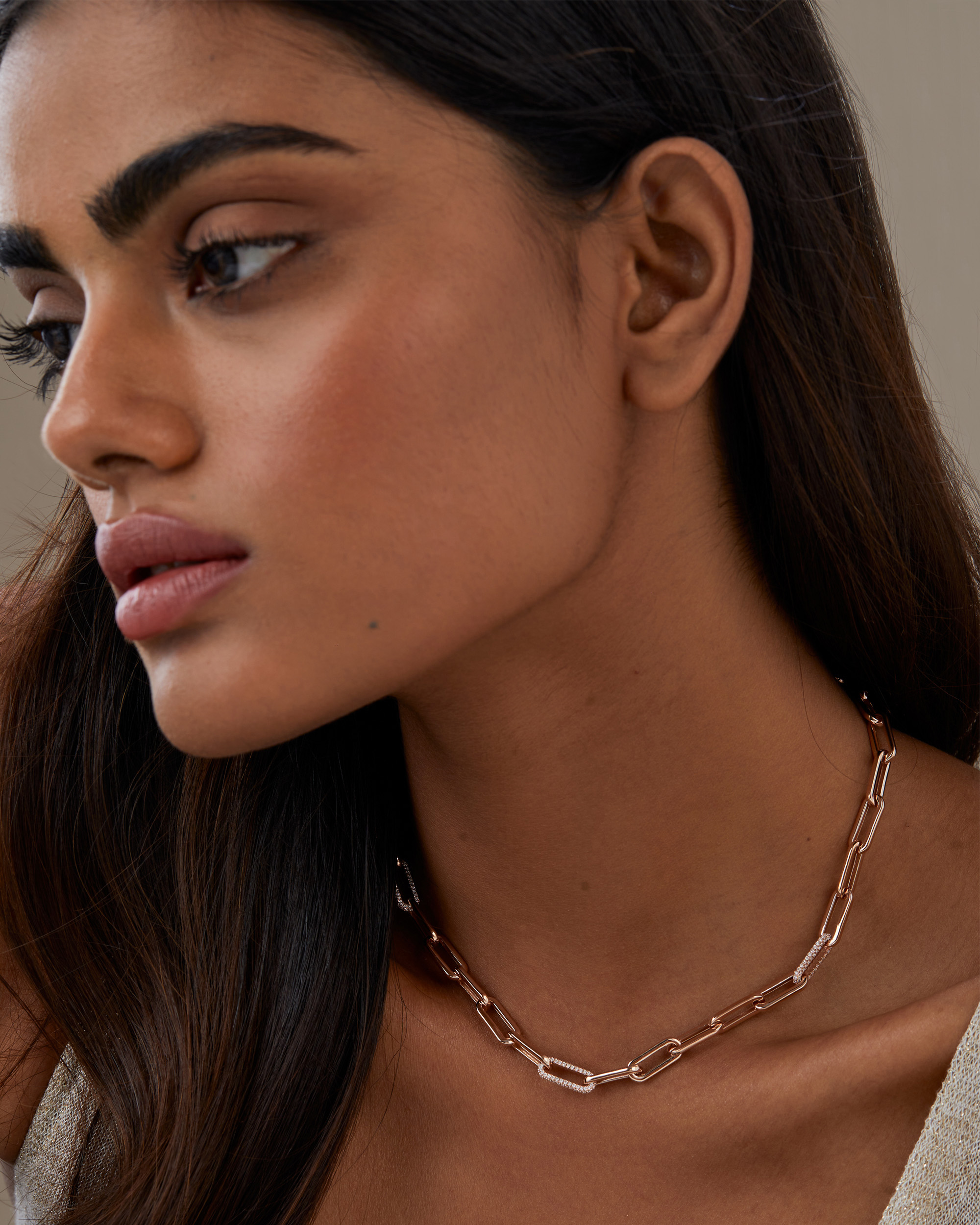 Bold meet chic. This stunning bold PaperClip Link Necklace has long rectangular gold links and 3 pave diamond links. Each link is of 15x6mm in size, which wraps all the way around. The necklace can be adjusted by simply attaching the lock to the links at preferred length