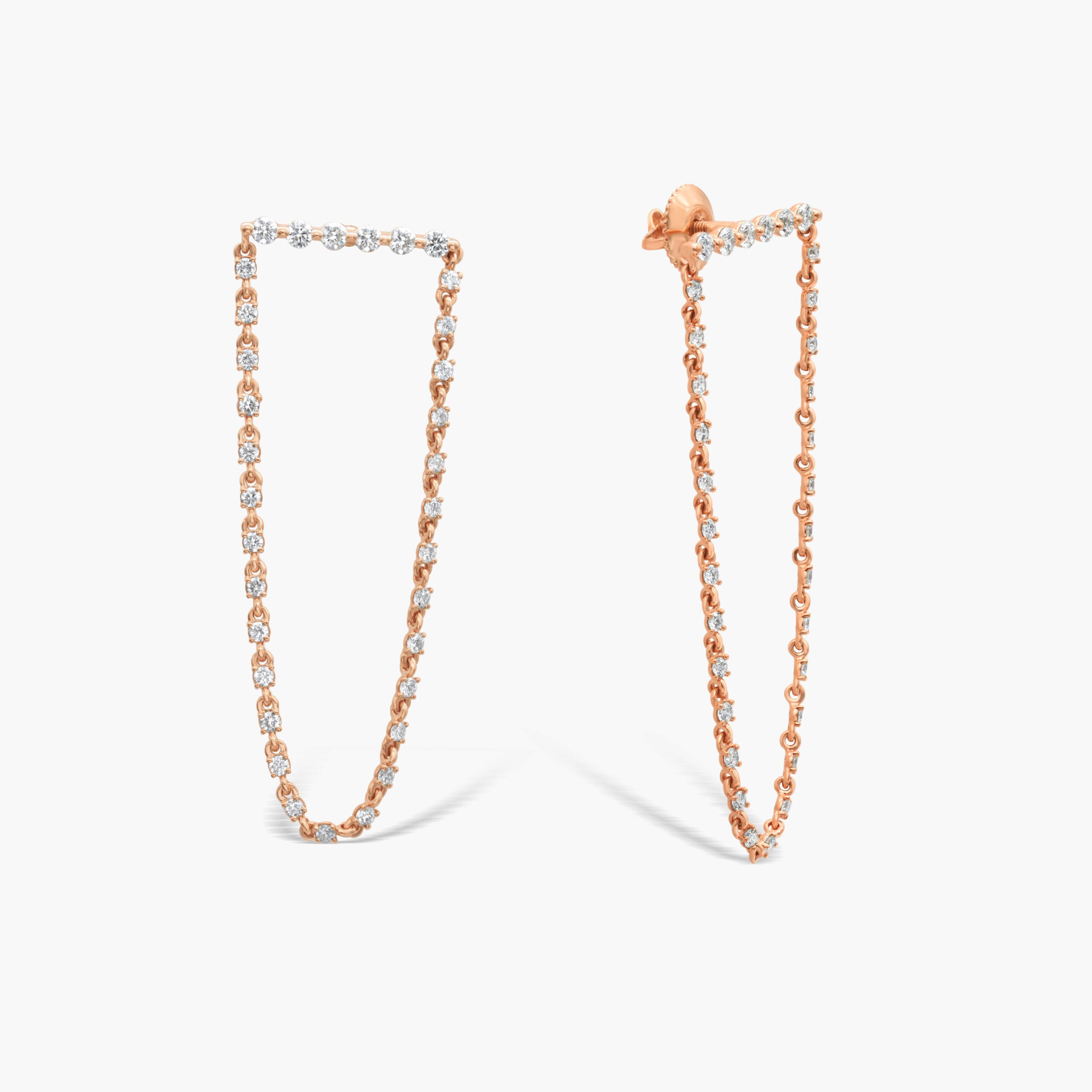 Elegant and refined, these Diamond Bar & Chain Earrings (Long) are designed as a single row of round brilliant diamonds in sleek horizontal bar that spans across the earlobe, with a loop of shimmering diamond chain that hangs beneath 50mm when secured on. These earrings are secured with threaded post and nut and they add sparkle to your attire. Style it on for your cocktail night out!!
