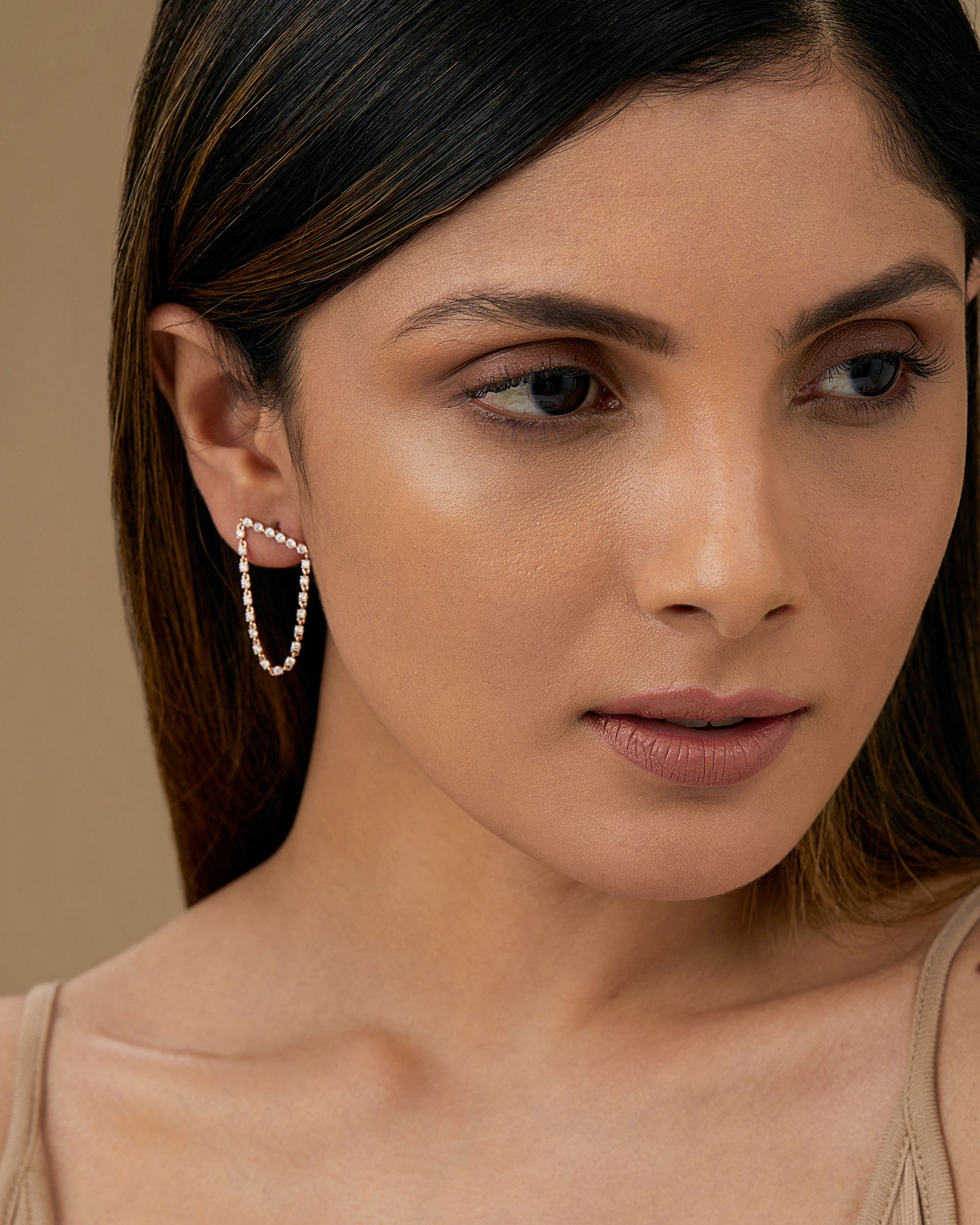 Elegant and refined, these Diamond Bar & Chain Earrings (Small) are designed as a single row of round brilliant diamonds in sleek horizontal bar that spans across the earlobe, with a loop of shimmering diamond chain that hangs beneath 32mm when secured on. These earrings are secured with threaded post and nut and they add sparkle to your attire. Style it on for your cocktail night out!!