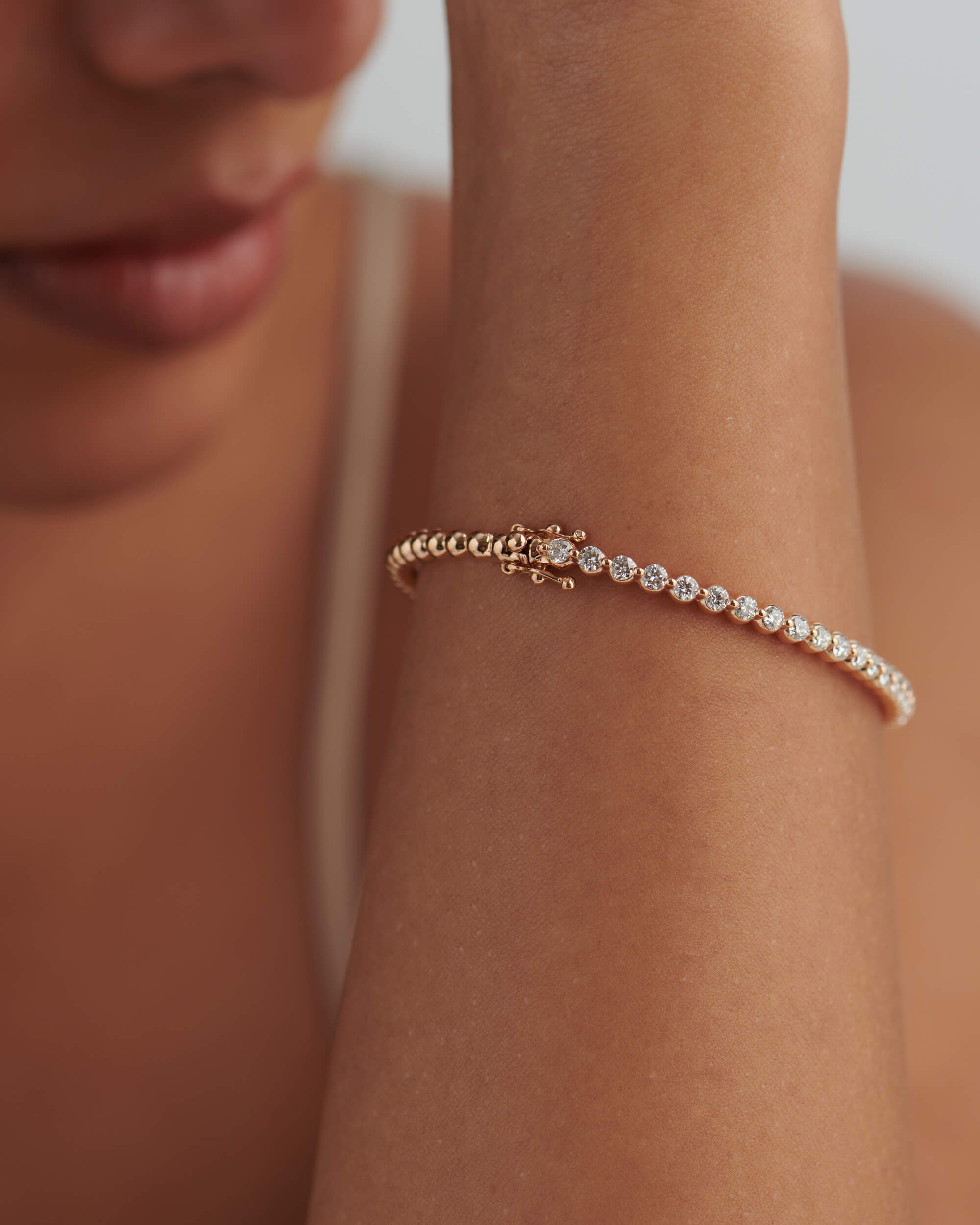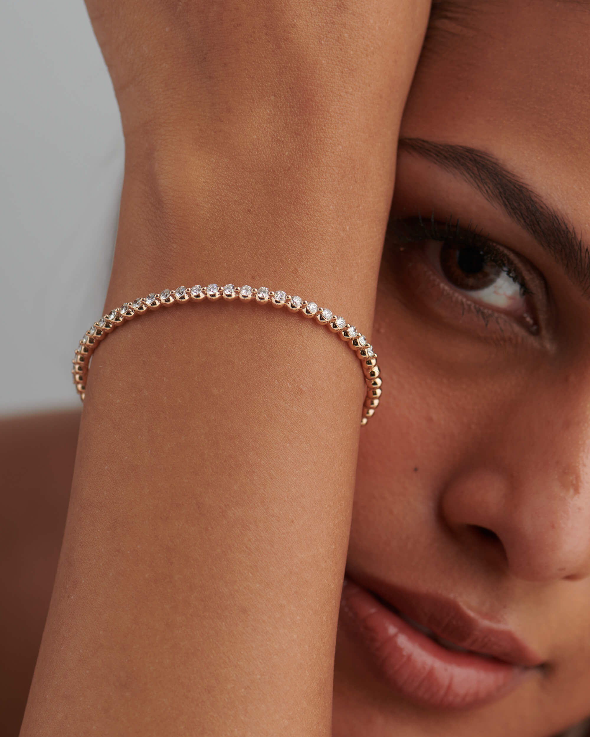 Truly a classic everyday piece to keep for a lifetime. This Diamond Beaded Oval Bangle exhibits shimmering diamonds (5 cents each) in bezel set which adorns the bangle on the top and beaded high gloss polish on the bottom side. The bangle hinges open with a securely designed clasp.
