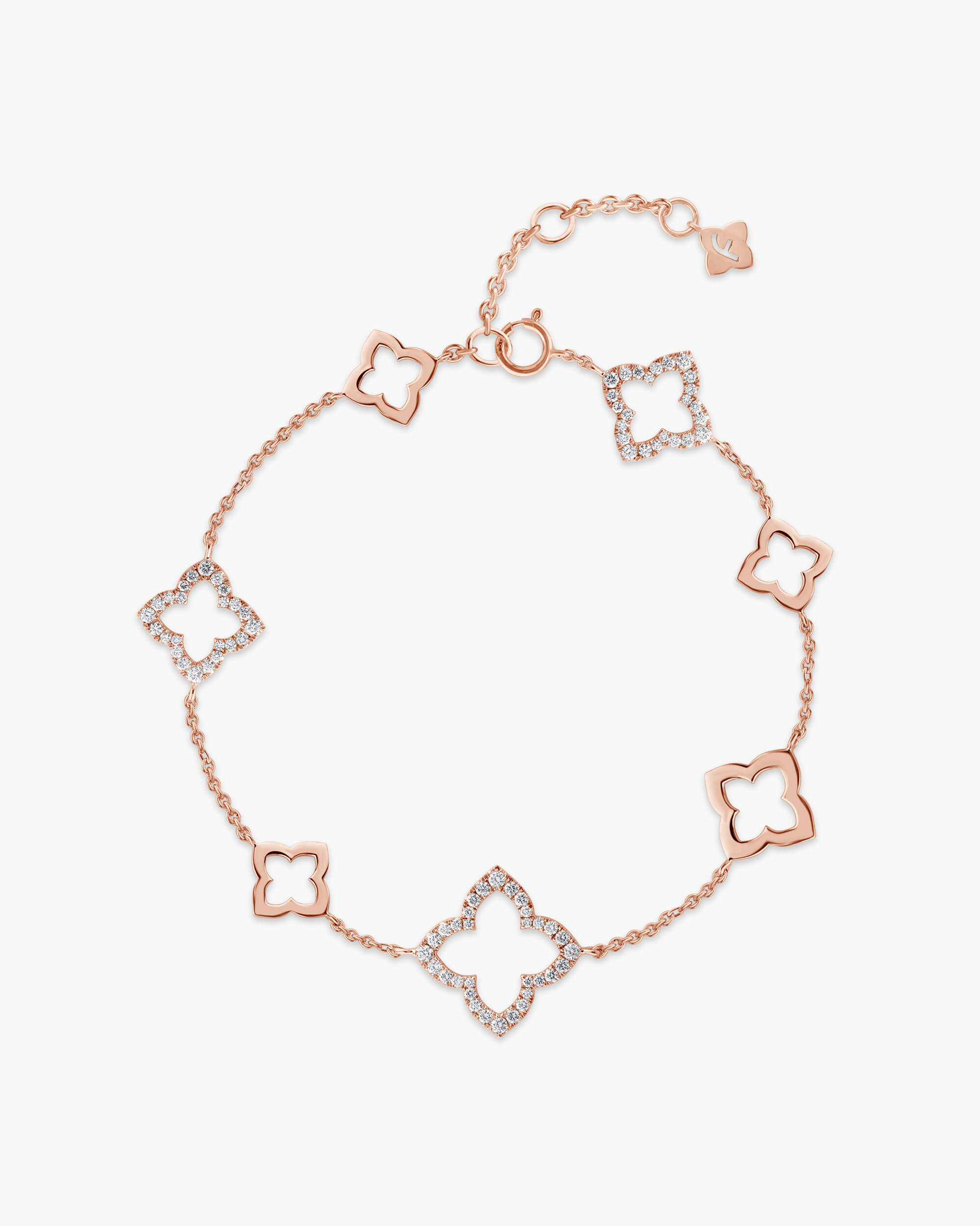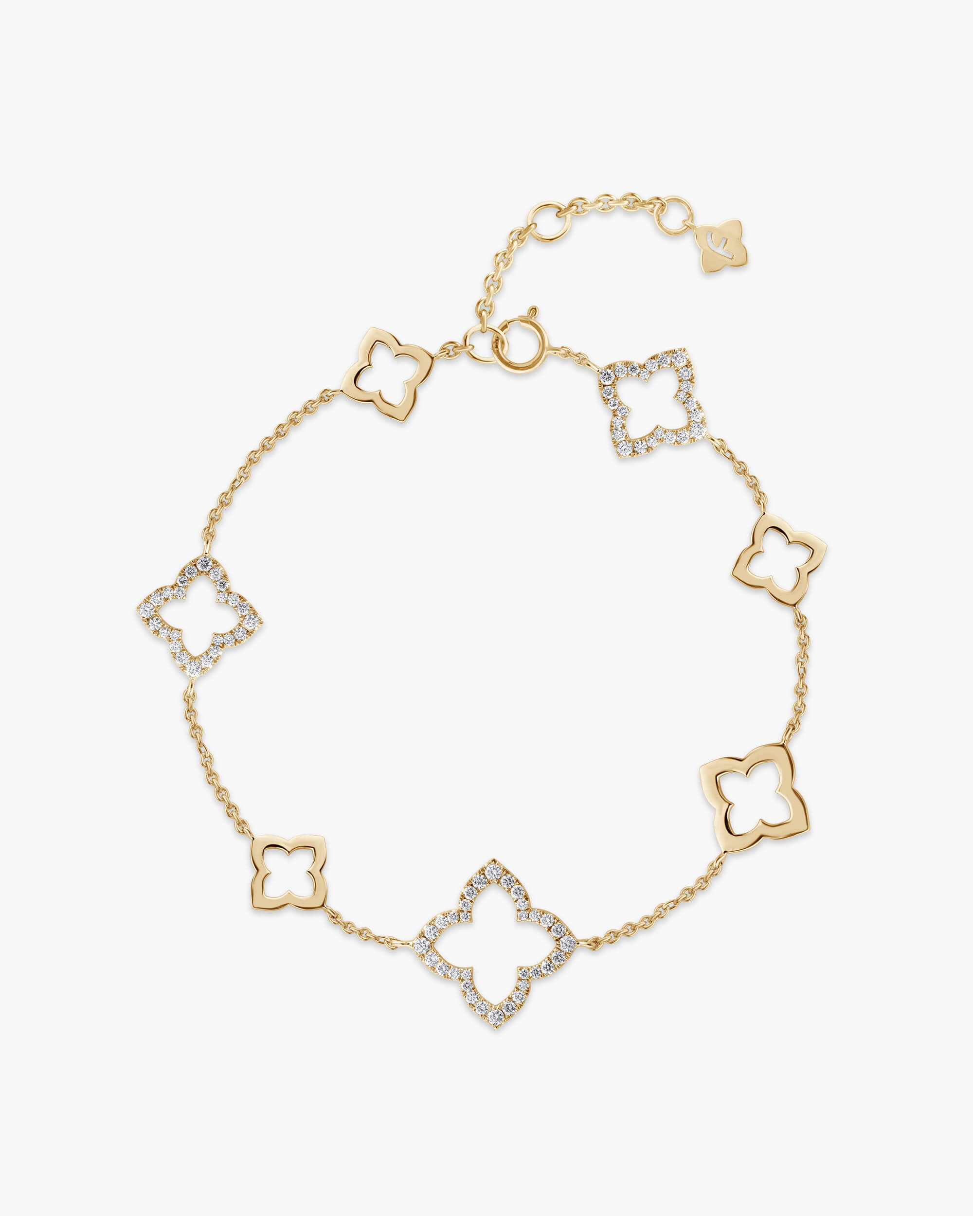 Must-have ensemble for modern classic glamour is this Diamond Bunchberry Silhouette Bracelet. Each motif is handcrafted in solid gold, embedded with open diamond motifs varying in sizes 11-14.5 mm and high polished gold motifs varying from 8.5 -11 mm which add to the edgy and modern look.