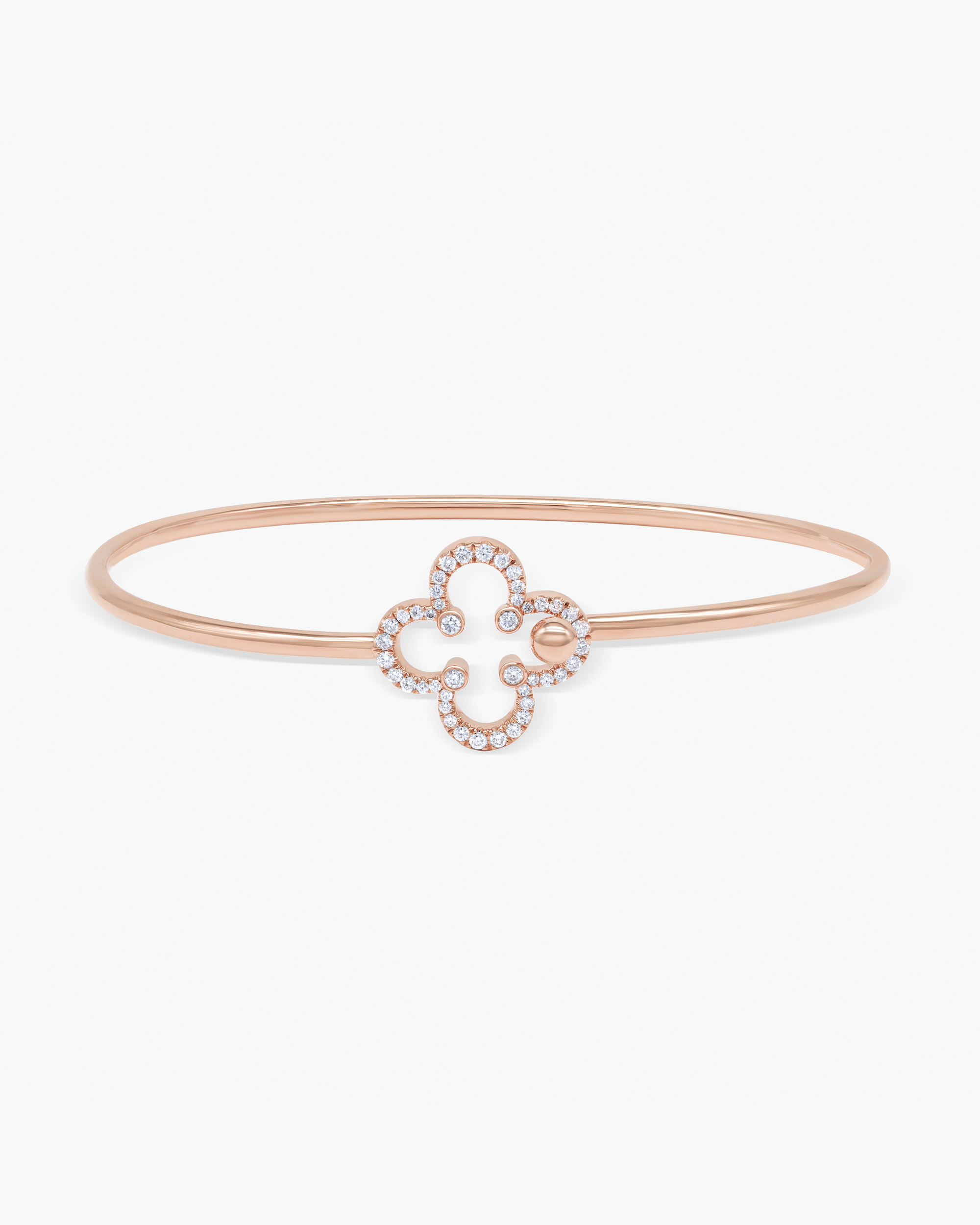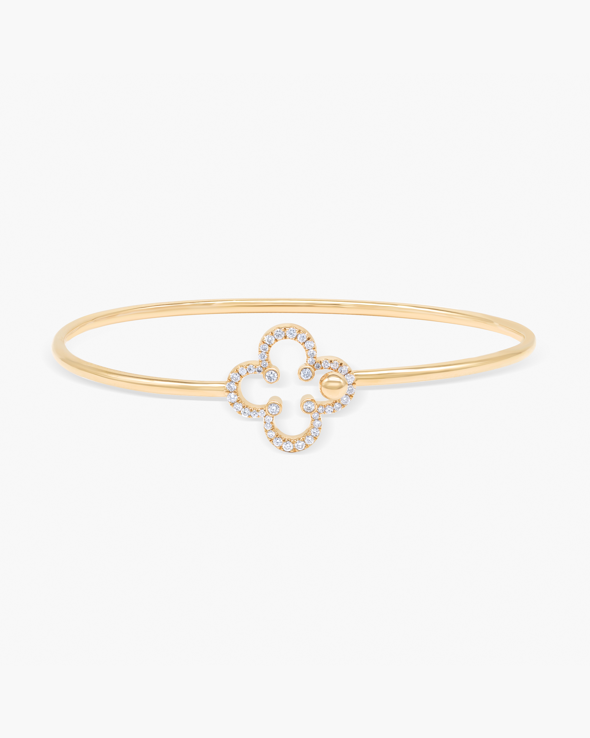 Sophistication made easy with this twist and wear Diamond Clover Flexible Bangle Bracelet, which gracefully slips onto the wrist. This sleek flexible bangle is defined by clover motif which is adorned by pavé diamonds and gold sphere which fits perfectly into the clover petal and allows the bracelet to lock in position.