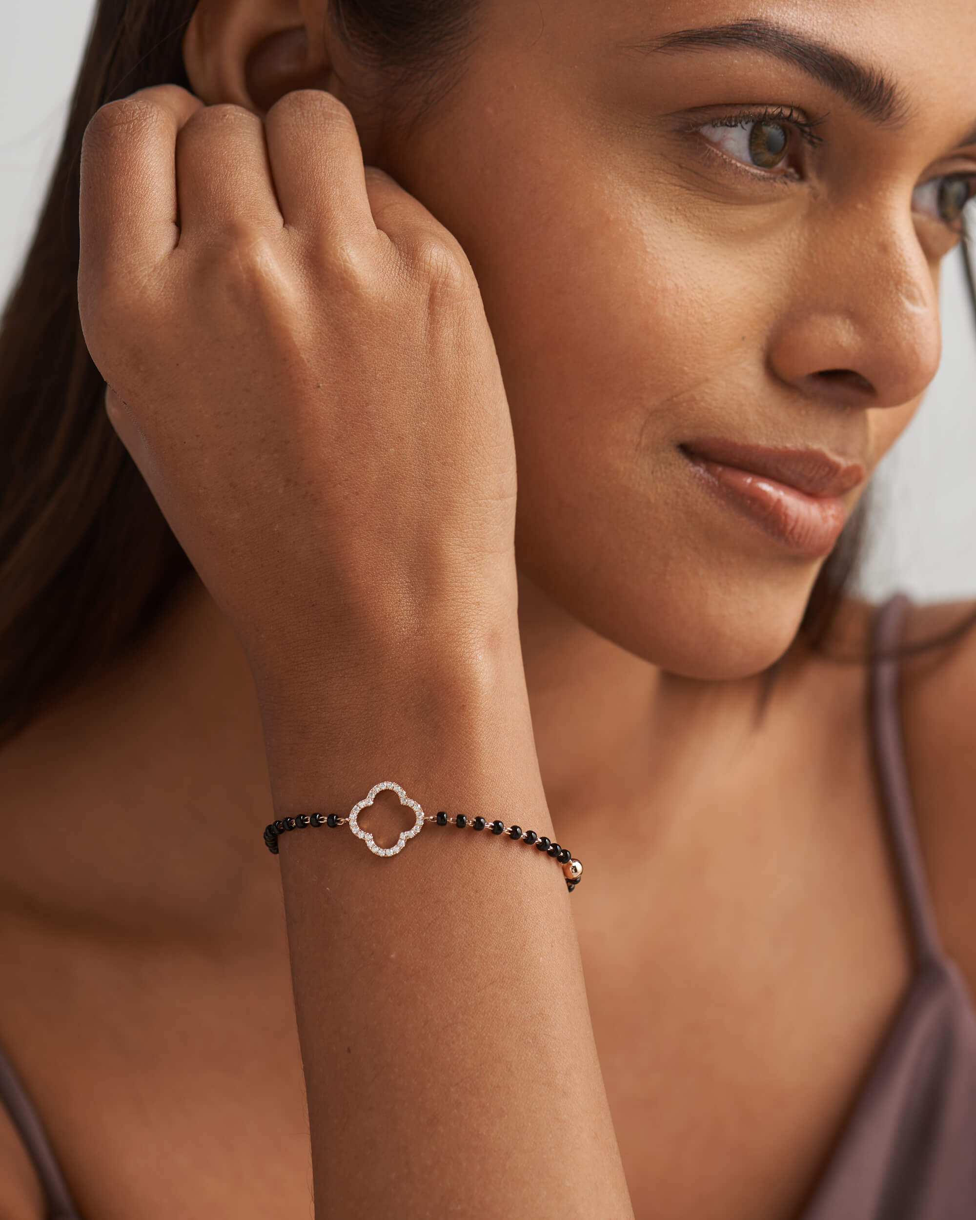 The clover leaf has always been a sign of good fortune. This Diamond Clover Mangalsutra Bracelet is handcrafted in solid gold, with round brilliant cut pavé set diamonds and with black glass beads and gold spheres.