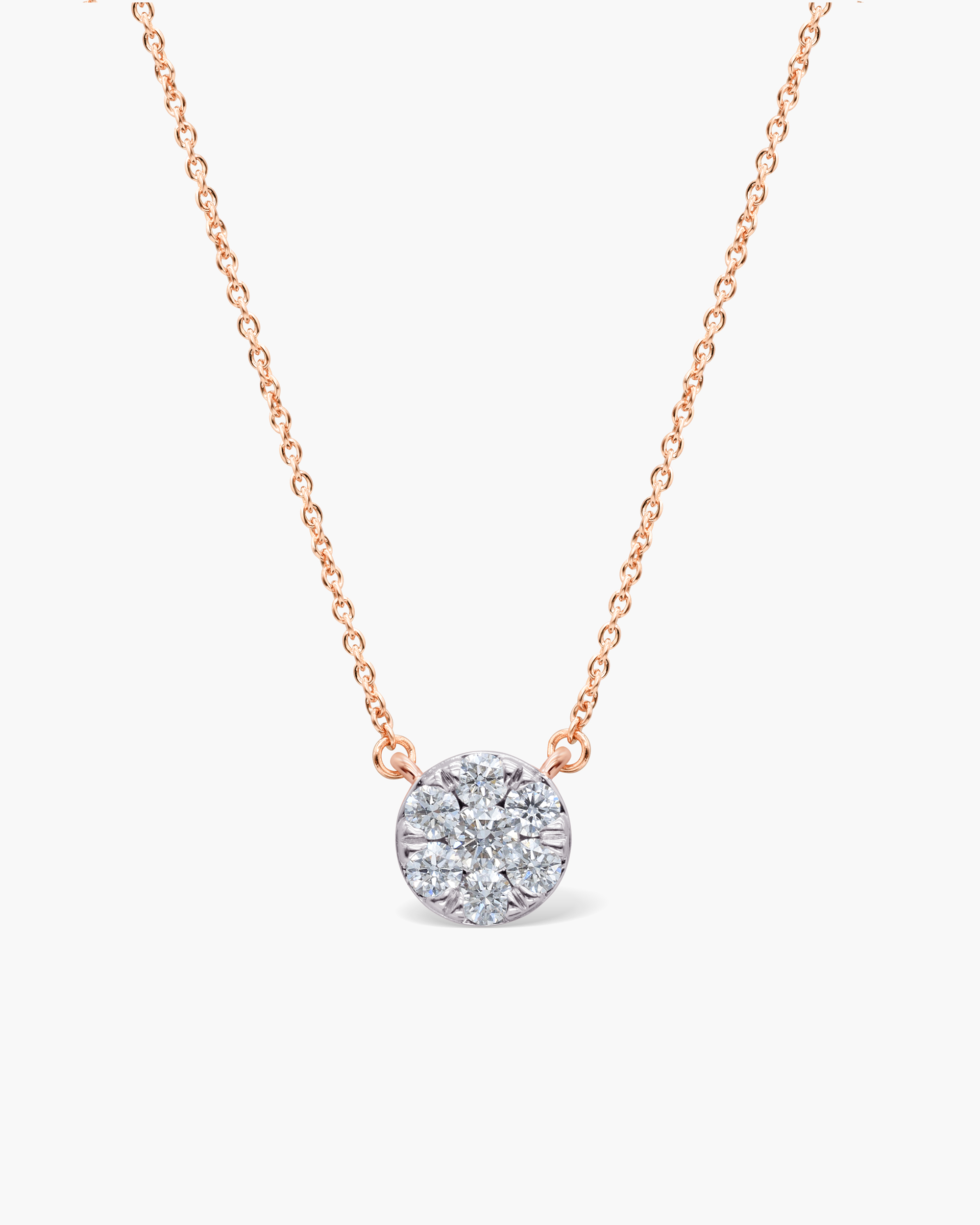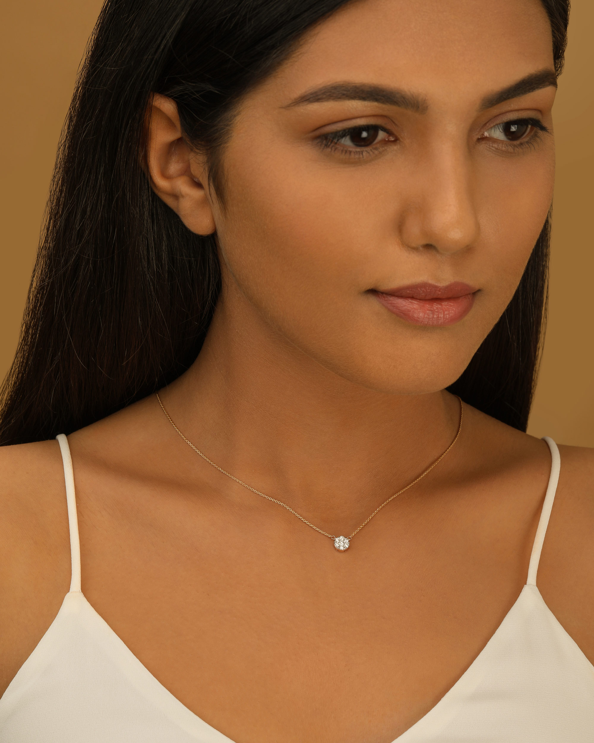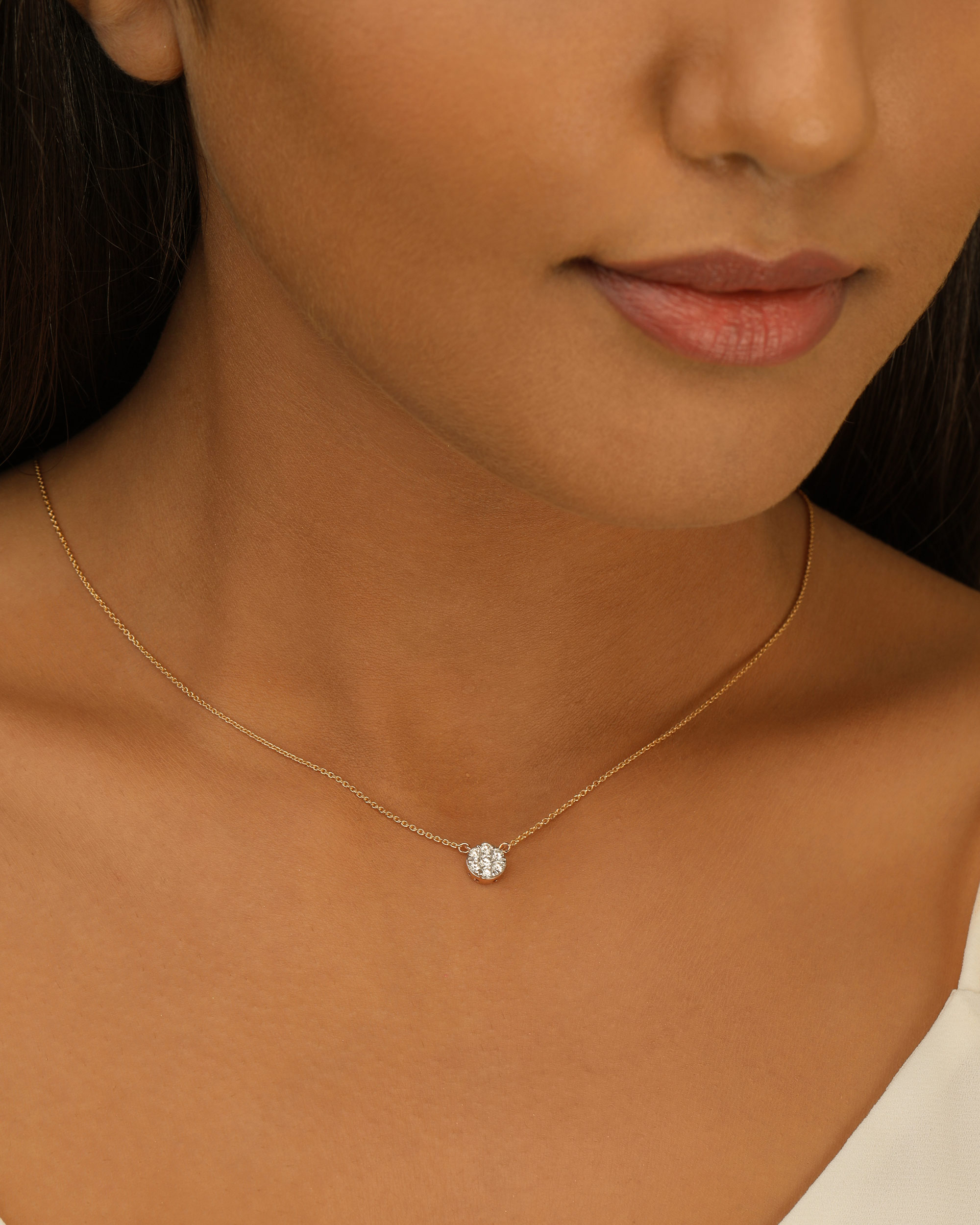 Dress it up or down, this necklace is totally versatile. Handcrafted in 18k gold and composite set round diamonds for a Solitaire look. Perfect for everyday occasion. The necklace is secured by a spring ring which allows you to adjust the length by 1” + or – the ordered size.