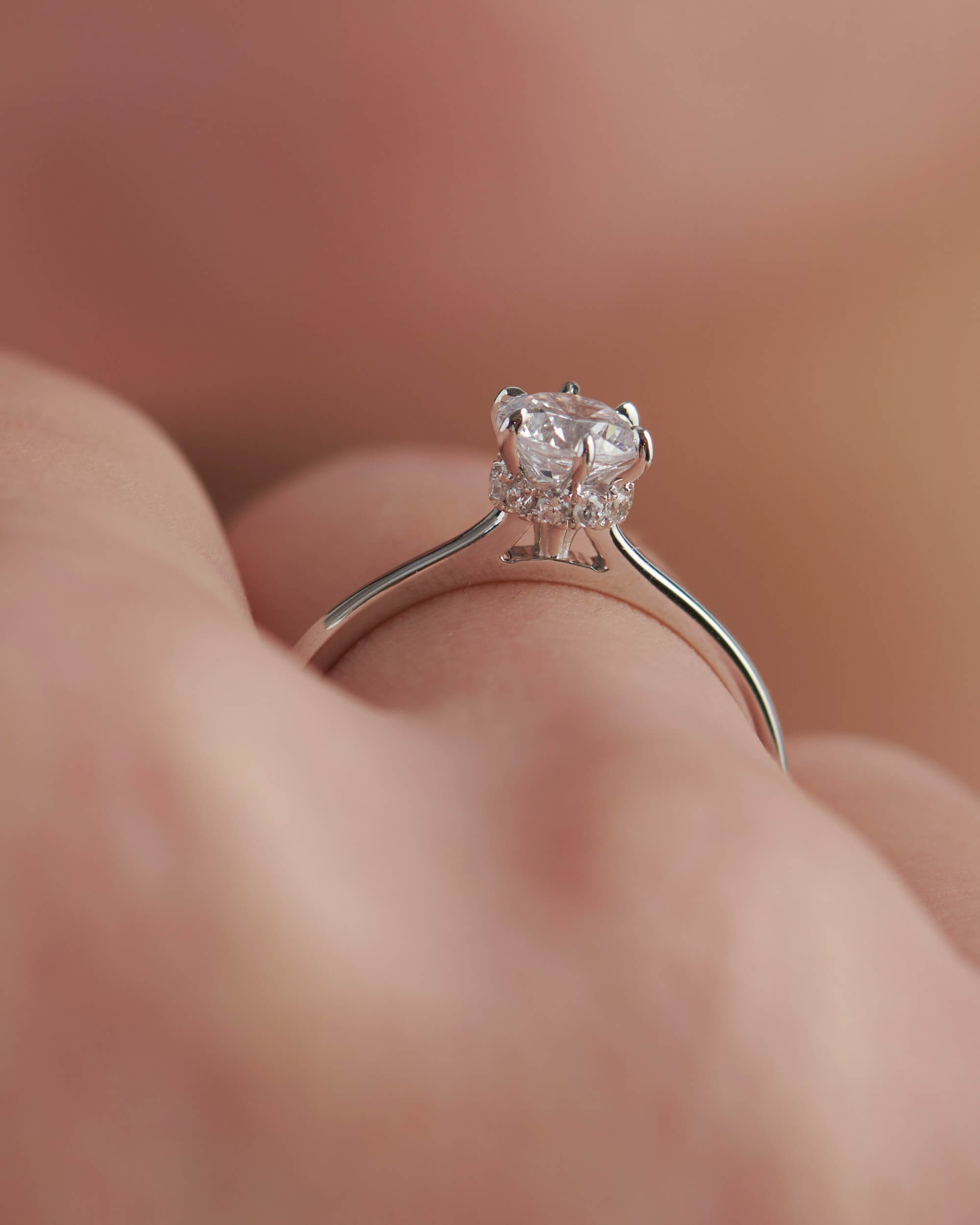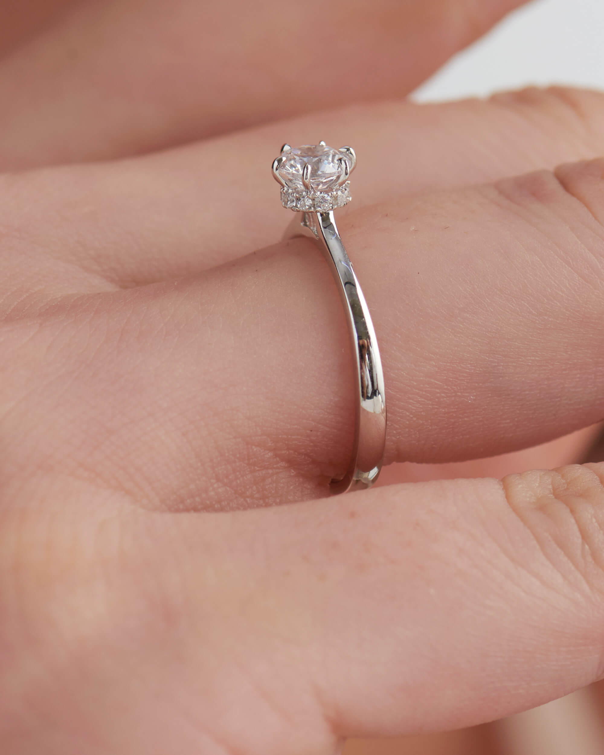 An elegant creation and perfect to be worn alone or paired with an engagement band. This Diamond Collar Round Solitaire Ring showcases a precious diamond centre stone (1ct) on display while a diamond collar of pavé diamonds add sparkle from every angle.