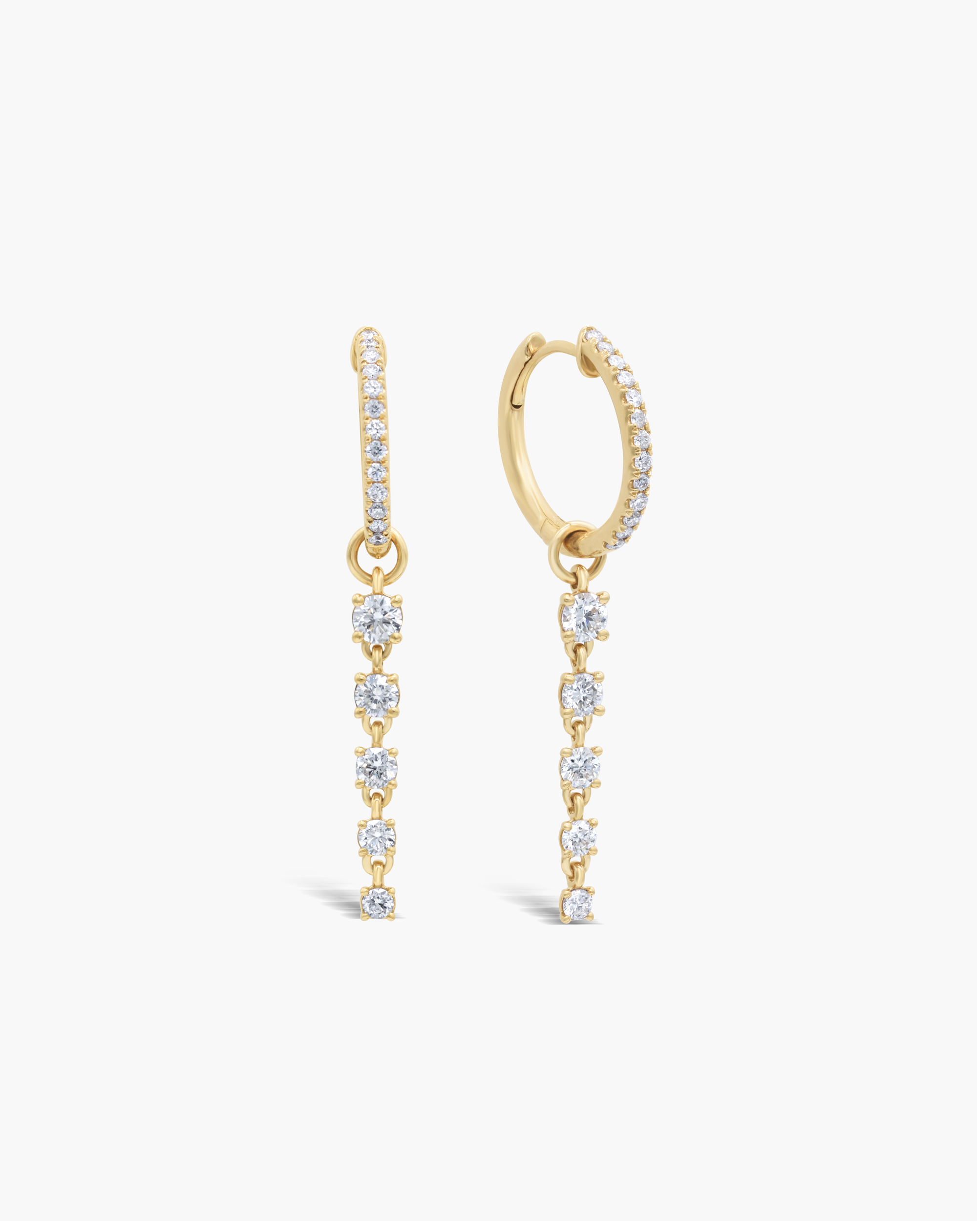 You can totally glam up your going-out attire with these Diamond Drop Chain Hoops, it can be worn as a elegant hoops or added to linear fashion. This earring features a gorgeous cascade of shimmering diamonds and they dangle gracefully from a chic pavé set diamond huggie.