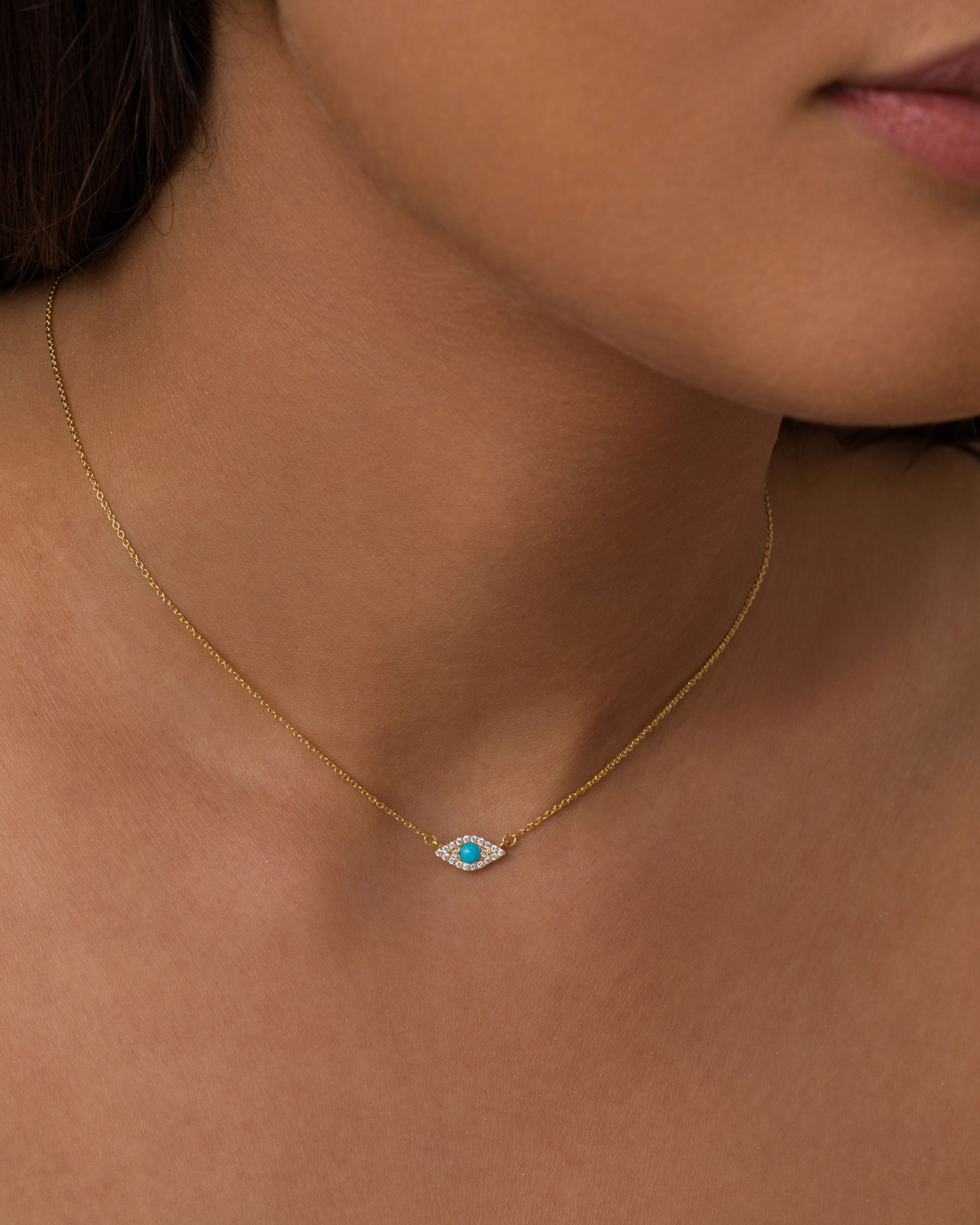 Good vibes only. This will stand out amongst the rest. Cool and elegant, these LUXE Pavé Evil Eye Pendant is handcrafted in 18 k gold with a statement turquoise evil eye pupil detail. This necklace is meant to protect you from negative vibes and make you look elegant while doing so! The necklace is secured by a spring ring which allows you to adjust the length by 1” + or – the ordered size.