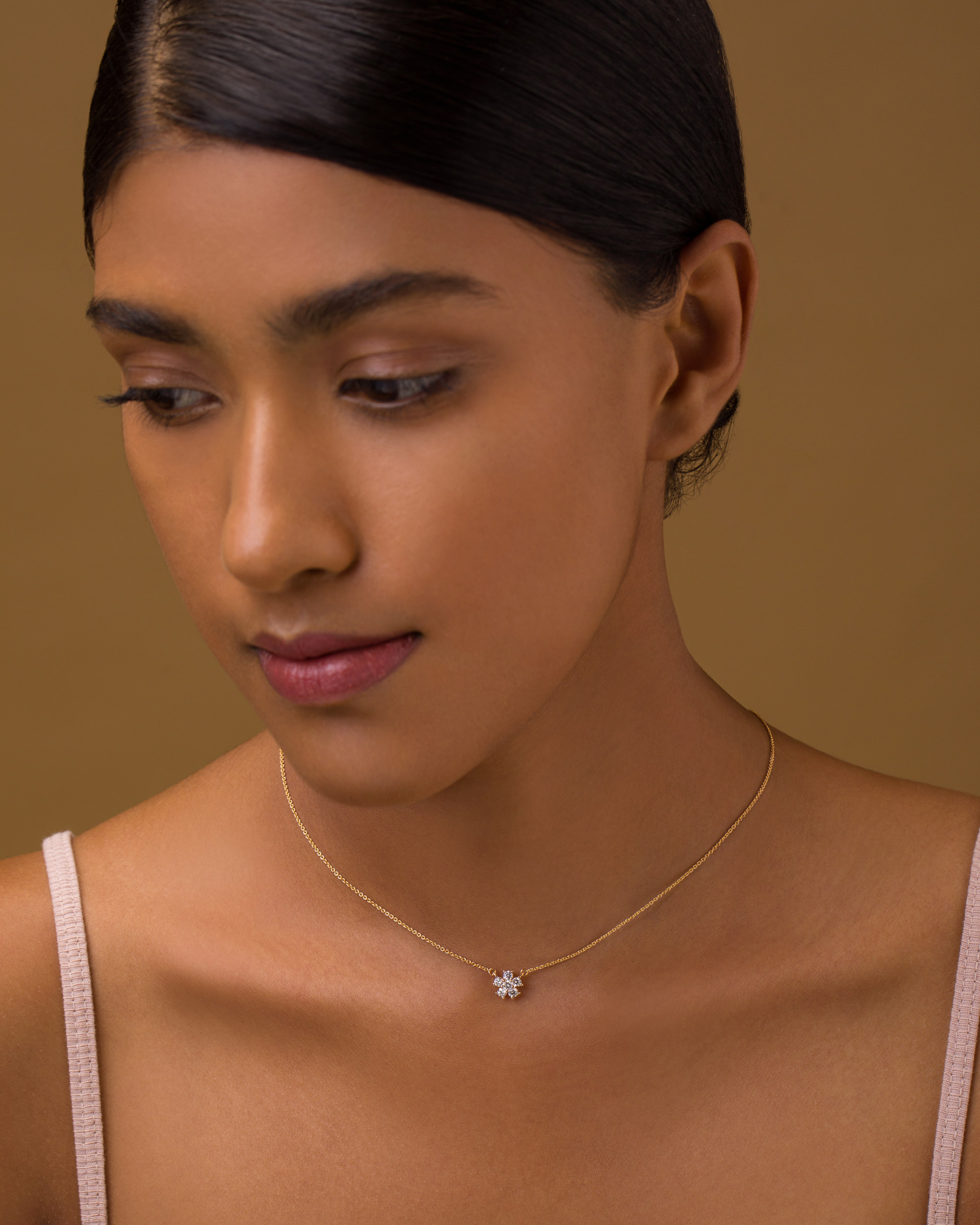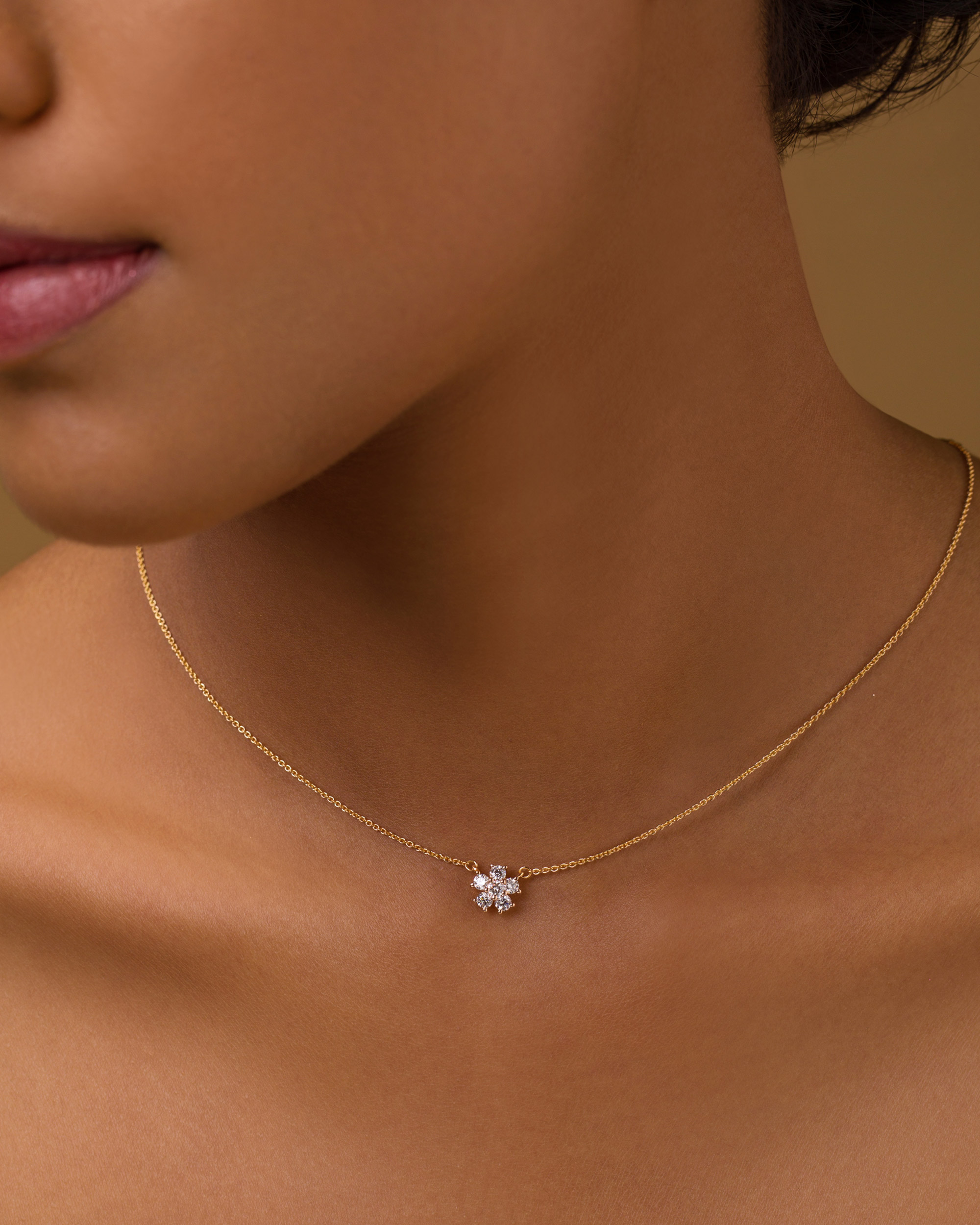 Make it simple but significant.” Designed to satisfy even the most minimal of minimalists.A true jewelry staple piece to be cherished for years to come. The flower pendant is delicately detailed out in 18K gold and round brilliant diamonds in micro-prong setting. A flower that actually lasts forever. The necklace is secured by a spring ring which allows you to adjust the length by 1” + or – the ordered size.