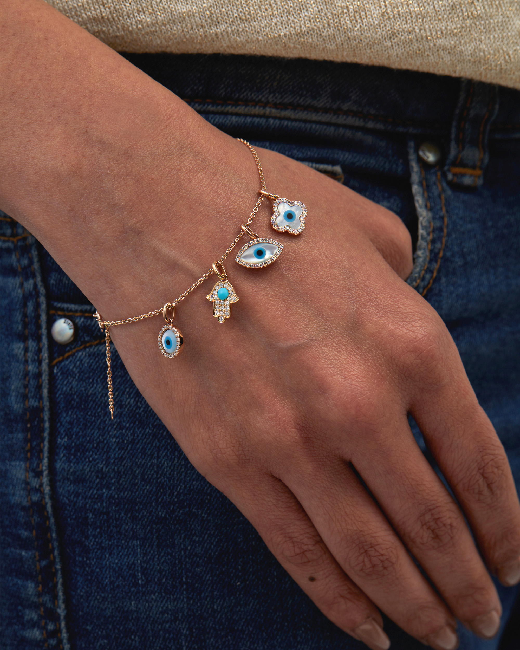 Our solid gold Diamond Frame Clover Evil Eye Charm / Pendant is outlined with shimmering diamonds and has an inlay of mother of pearl and turquoise evil eye pupil detail all set in solid gold. It features one of the most ancient and powerful symbols of protection against evil. Use it as a watch charm or hang it in your bracelet or use it as a pendant, they fit perfectly for any style.