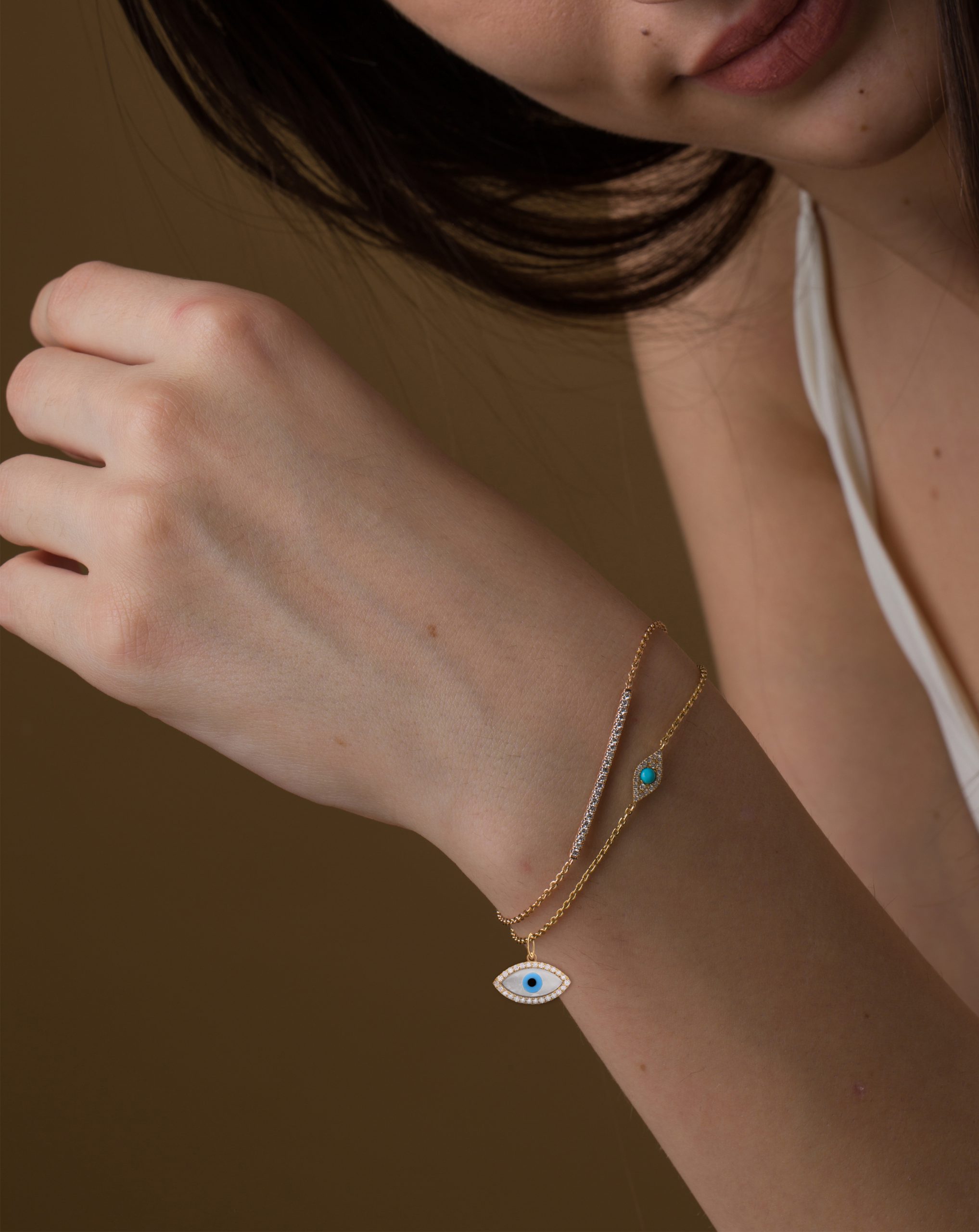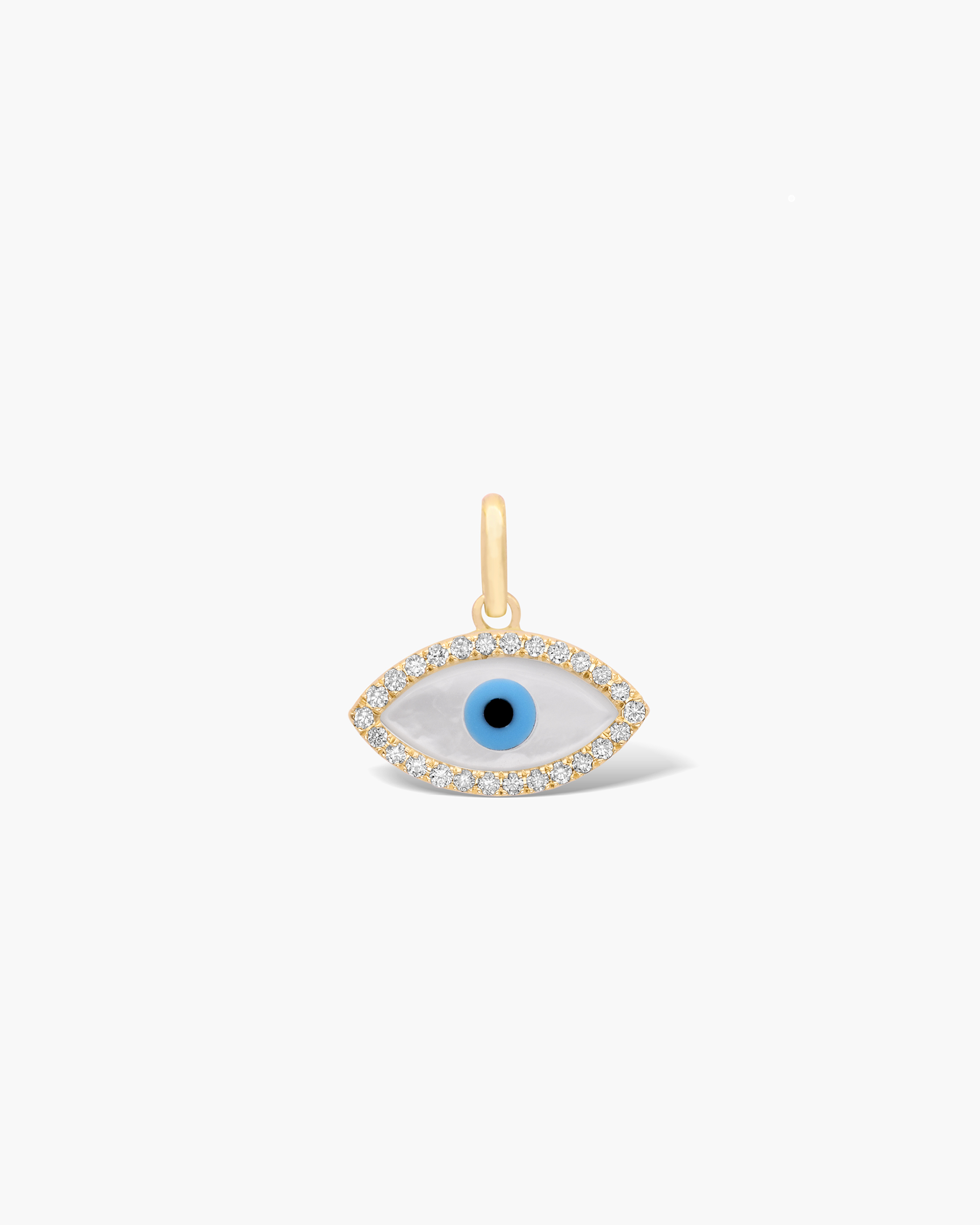 Our solid gold Diamond Frame Evil Eye Charm / Pendant is outlined with shimmering diamonds and has an inlay of mother of pearl and turquoise evil eye pupil detail all set in solid gold. It features one of the most ancient and powerful symbols of protection against evil.