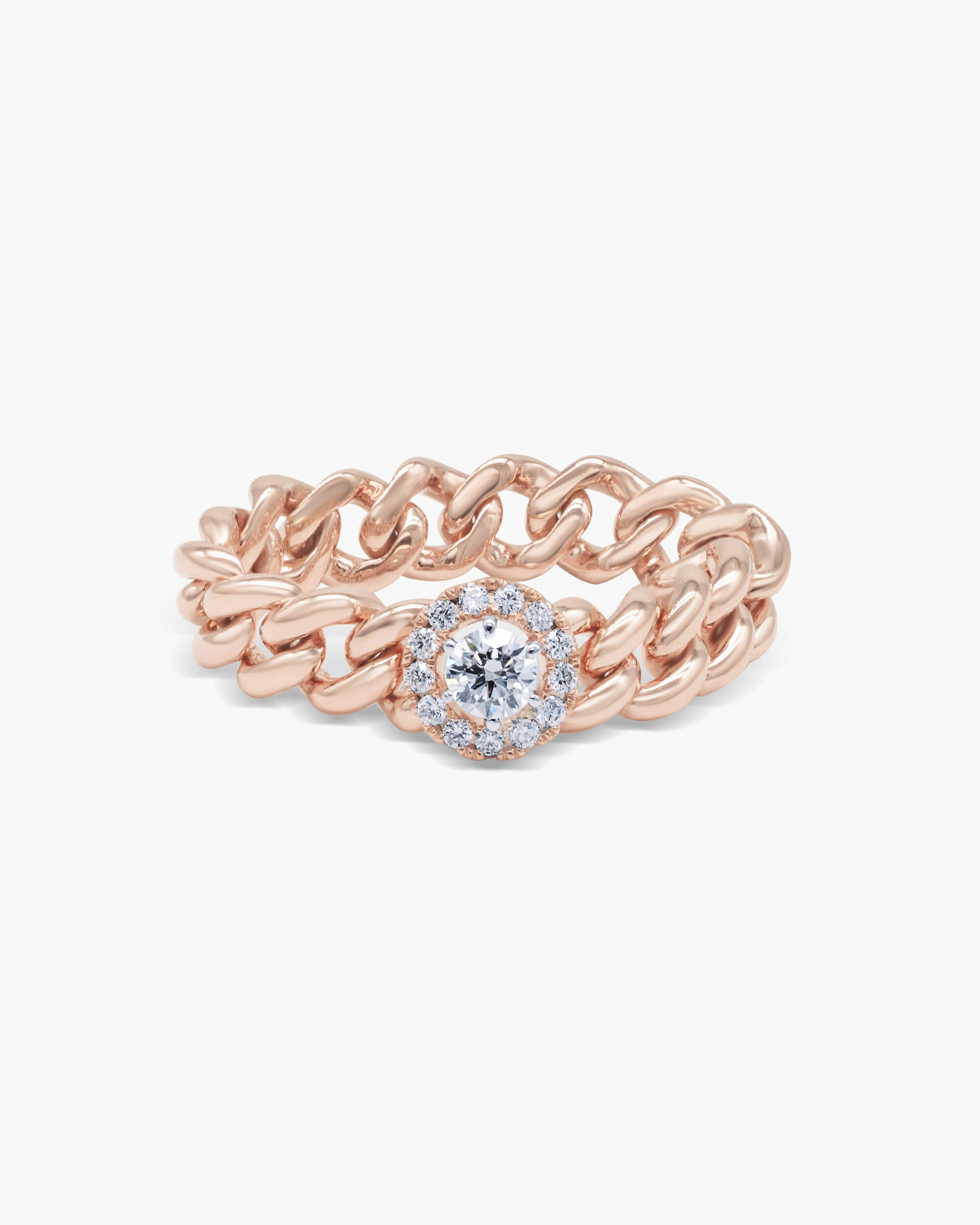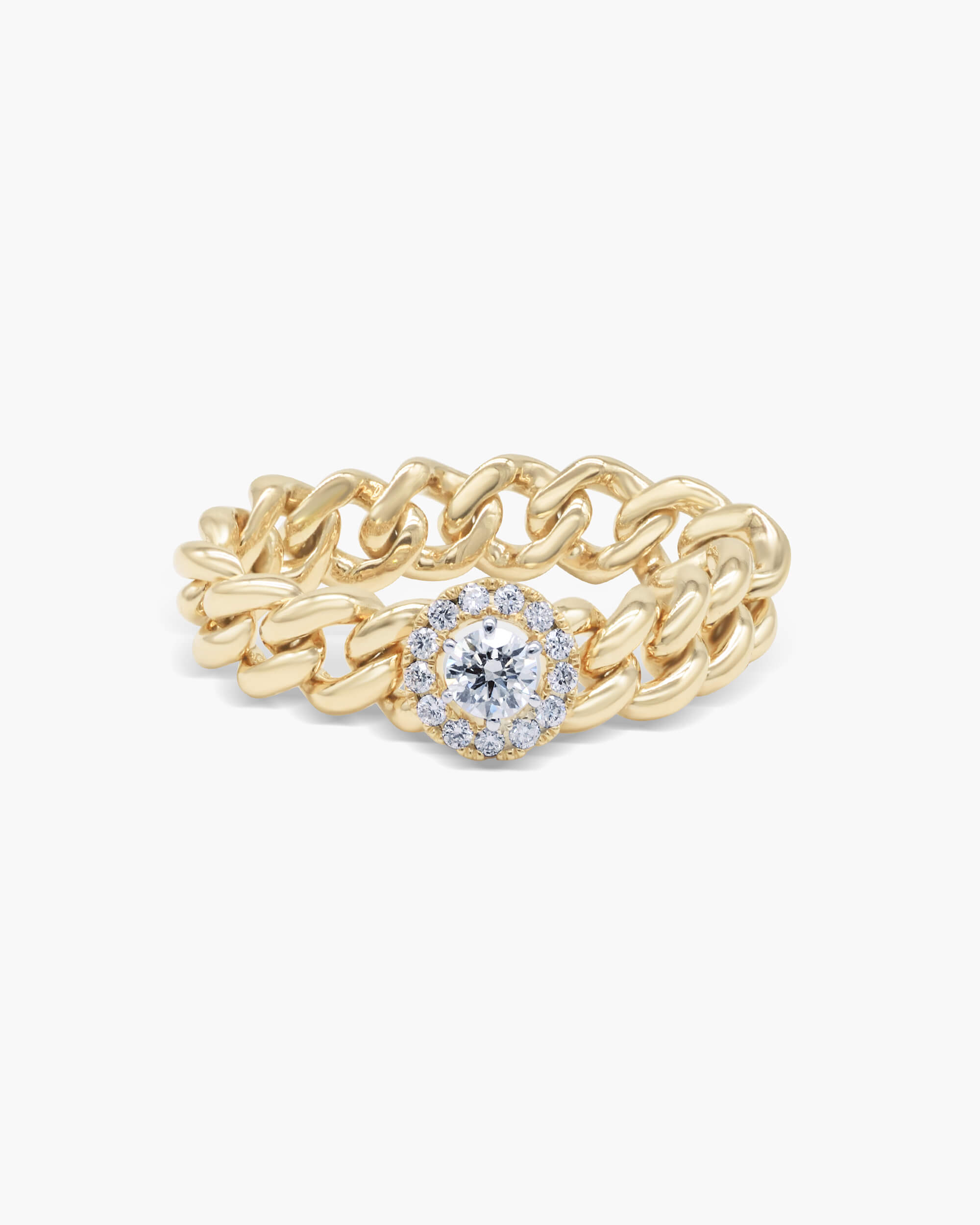 Elevate your style with this Diamond Halo Cuban Chain Ring. This ring features a solitaire (13 cents) with shimmering pave diamond halo, set into a chic Cuban chain design made from flexible links.