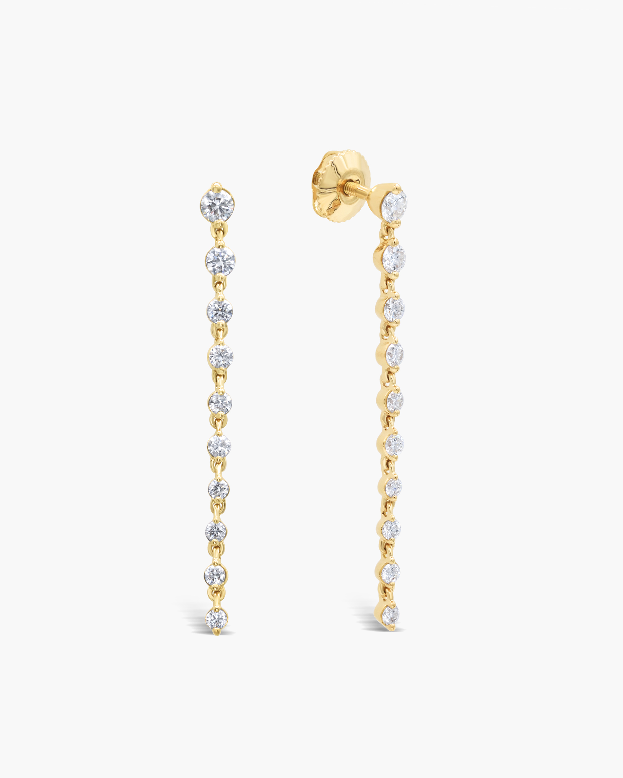 Edgy yet timeless, these flexible Diamond Linear Drop Earrings boast sophistication that will make everyone take notice. Each dangling drop dazzles with a row of graduated-sized diamonds, from 10 cents to 2 cents. These earrings are secured with threaded post and nut.