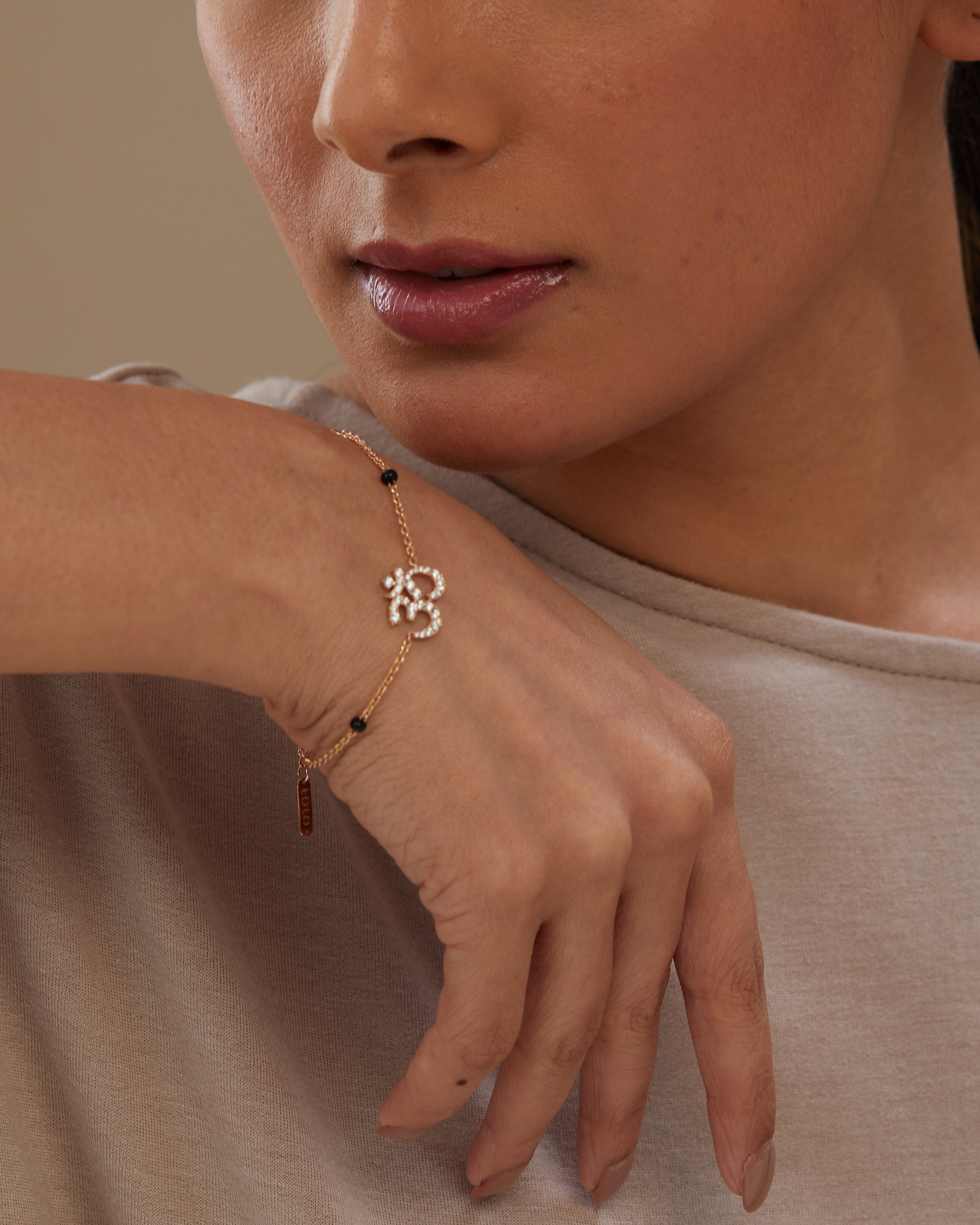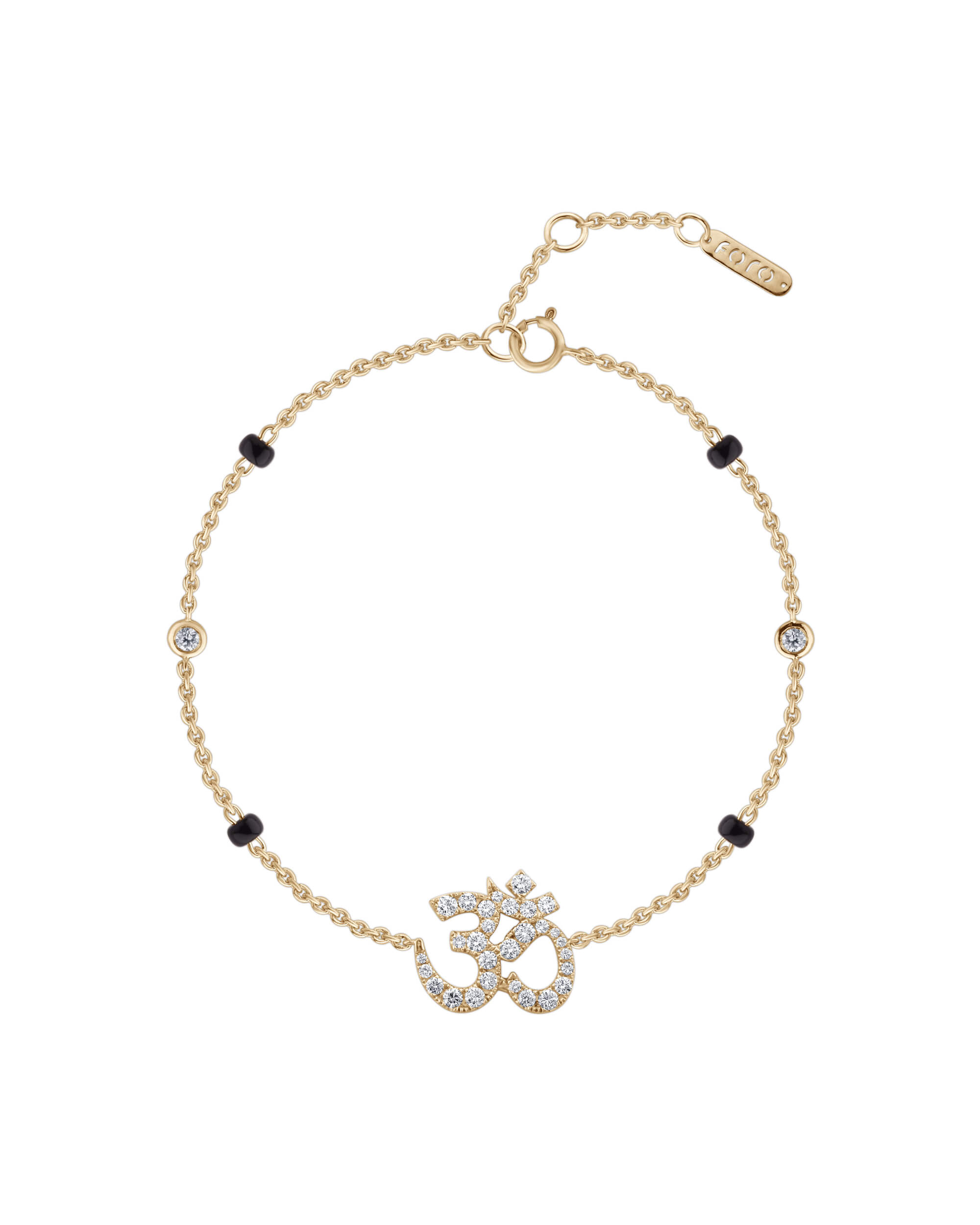 Meaningful and perfect symbol of her everlasting faith. This Diamond OM Bracelet (medium) is handcrafted in solid gold and sparkling pavé set diamonds. The chain is adorned with alternating bezel diamonds and black glass beads.
