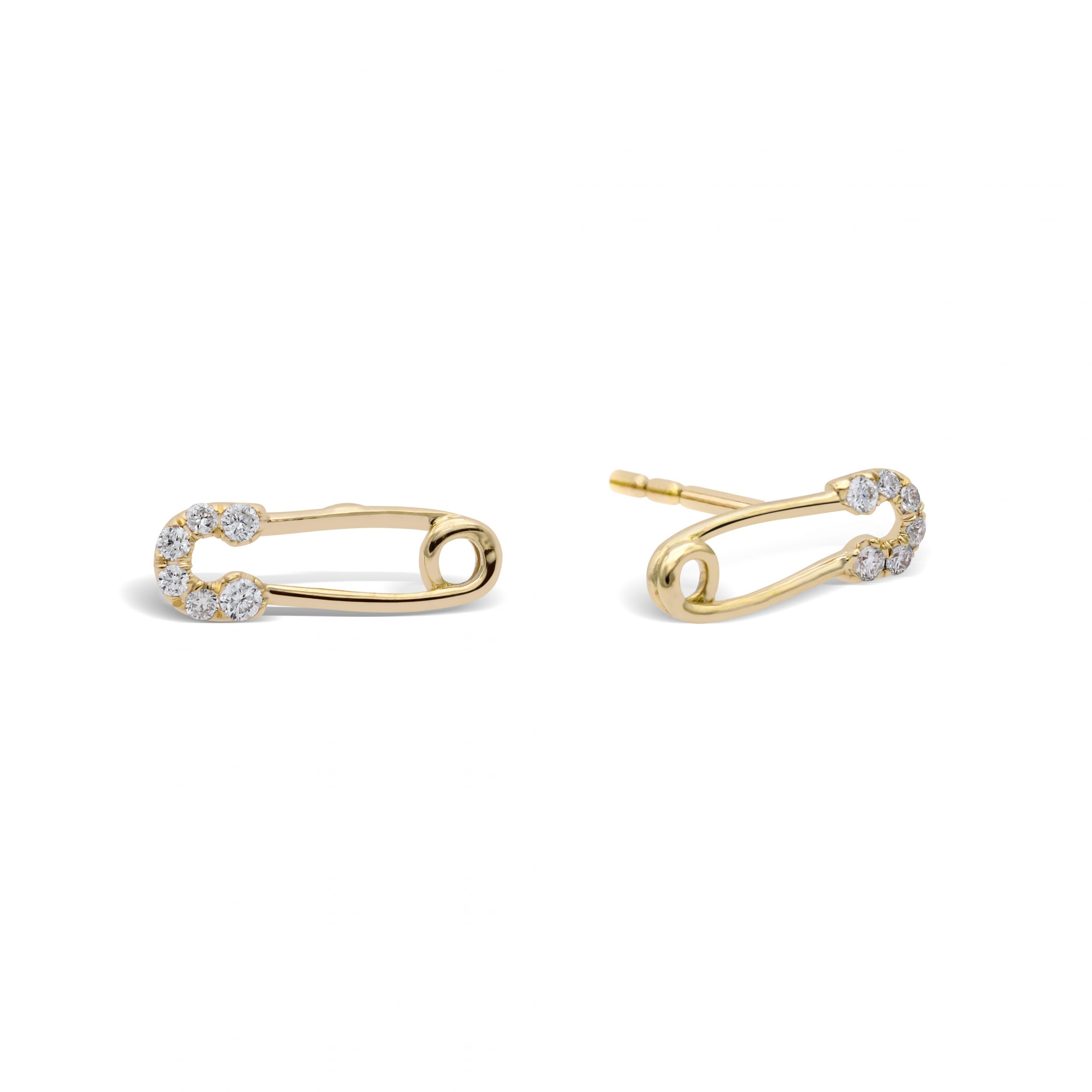 These Diamond Safety Pin Studs will add an exclusive swanky vibe to any ensemble. This is handcrafted in gold and encrusted with sparkling pavé set diamonds on the head and high polish finish on the body. These studs have a friction butterfly push ear nut for comfy and secure fit.