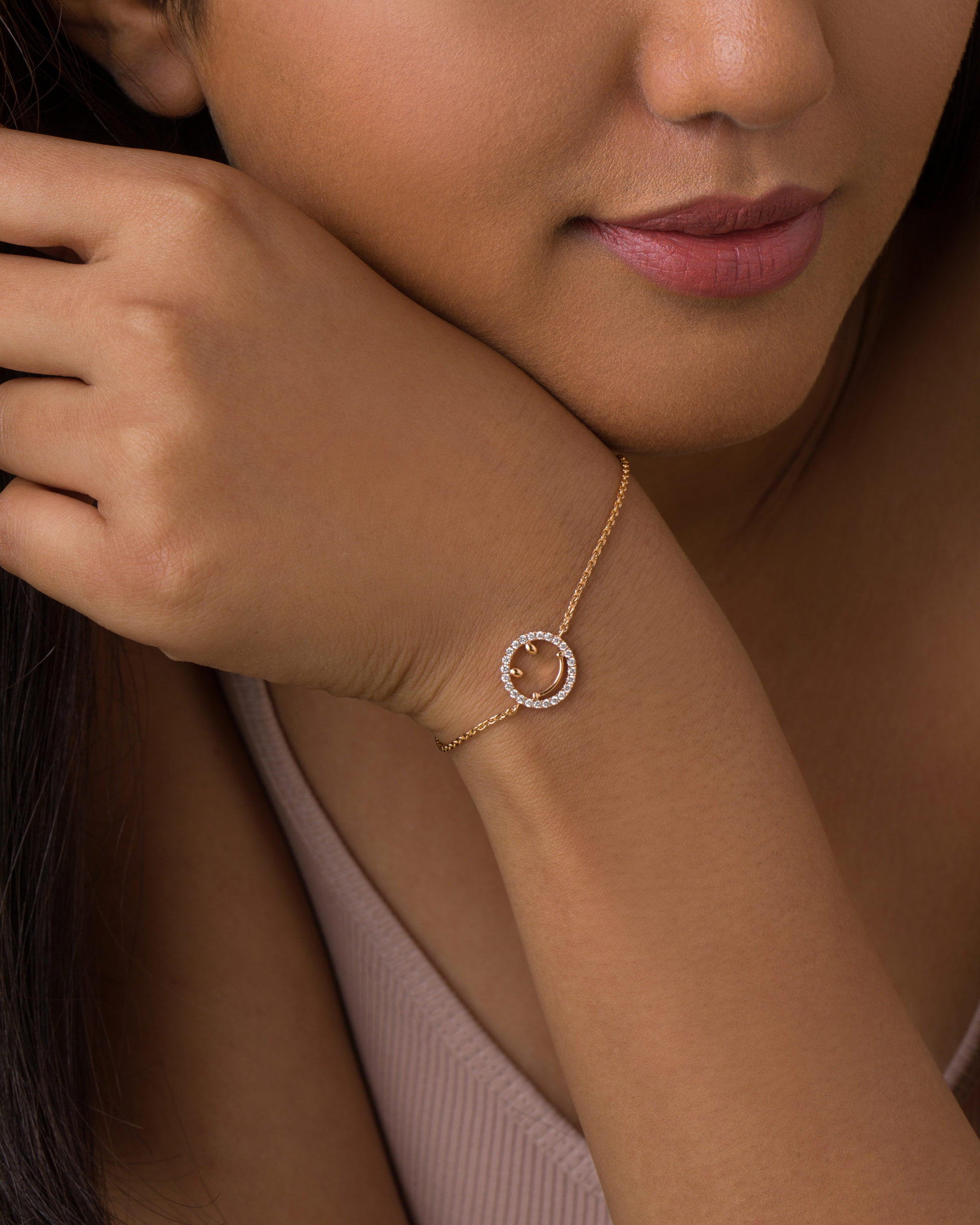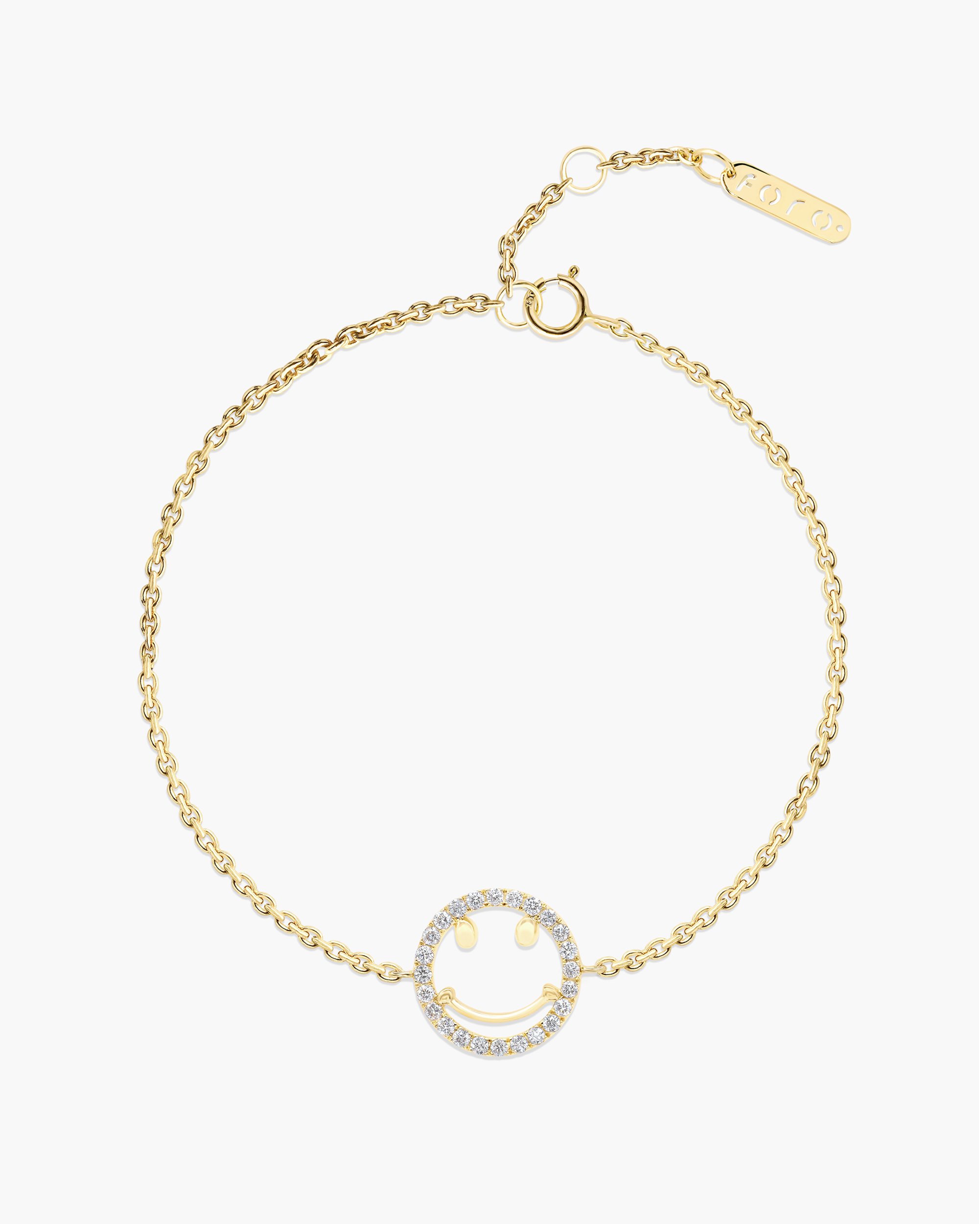 Whimsical and fun, this smiley face bracelet brings a statement to your stack! This piece is handcrafted in solid gold with round brilliant-cut pavé set diamonds. An unique charm Bracelet, comfortable to wear for everyday or for party time.The bracelet is secured by a spring ring which allows you to adjust the length by 1/2″ + or – the ordered size.