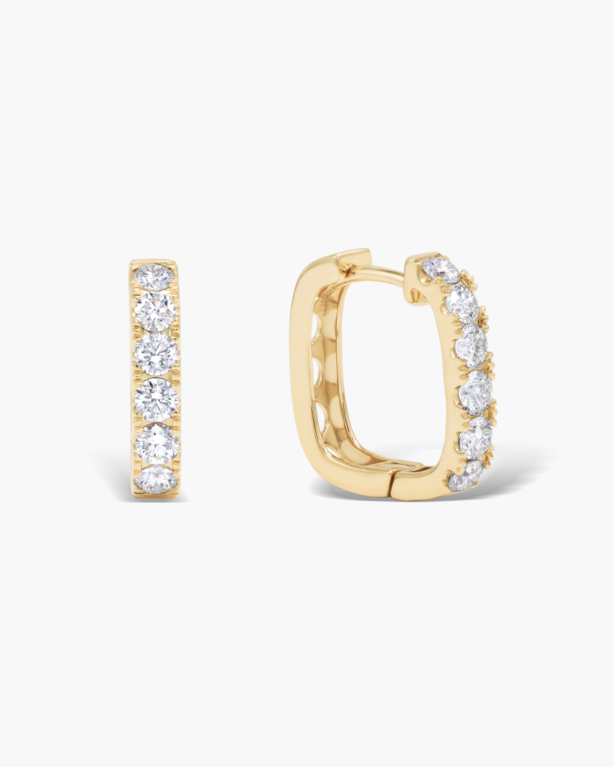 Inspired by geometric form is our Diamond Square Hoops (Wide), which is designed to be worn as a staple wear or saved for a special occasion. Featuring a single row of pavé set diamonds in the front and plain gold in the rear side.