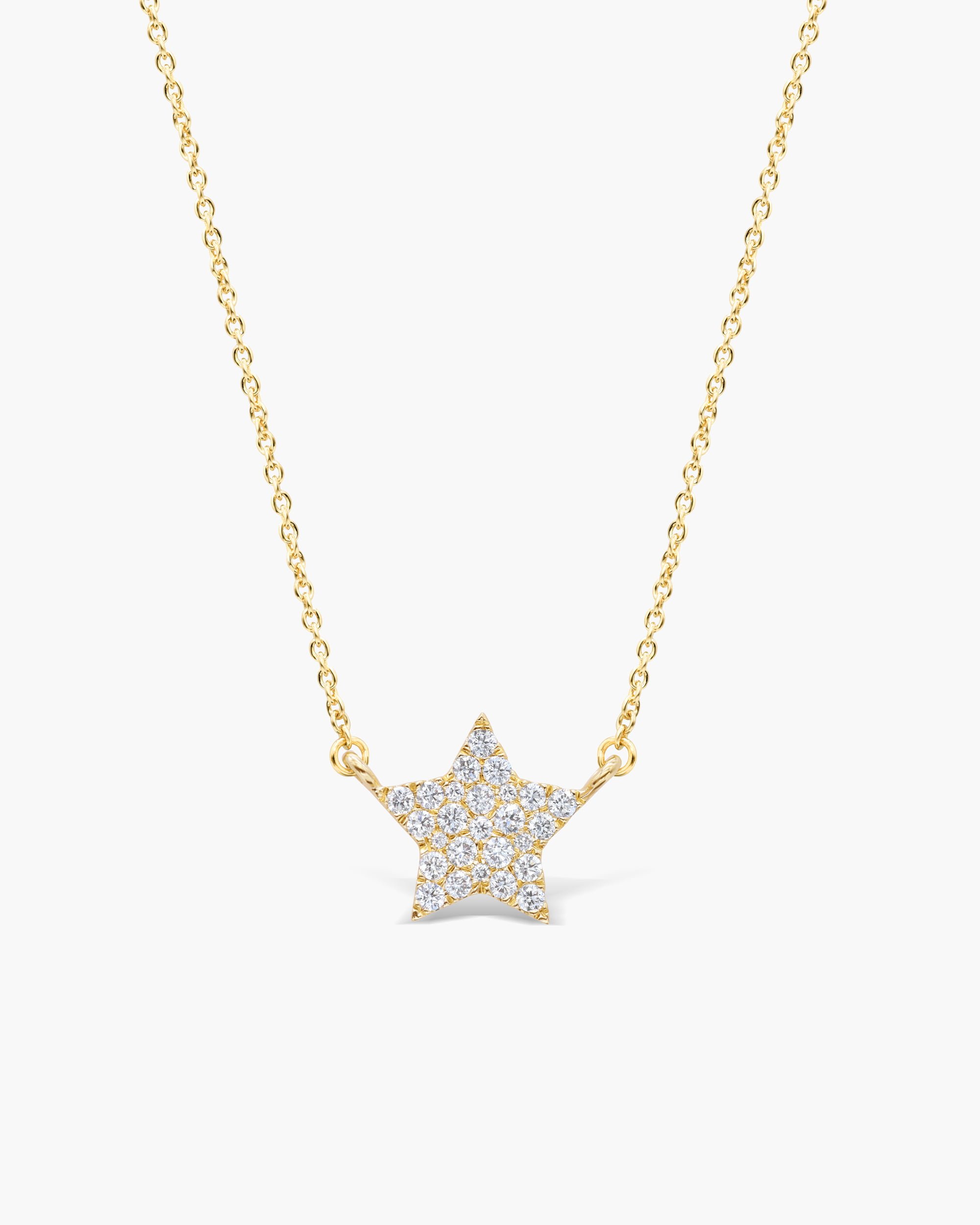 Shine bright like the star you are. This stylish and understated piece is handcrafted in 18K solid gold and pavé set diamonds.This dainty pendant looks great when layered with your other favorites.This surely will add a twinkle to your look The necklace is secured by a spring ring which allows you to adjust the length by 1” + or – the ordered size.