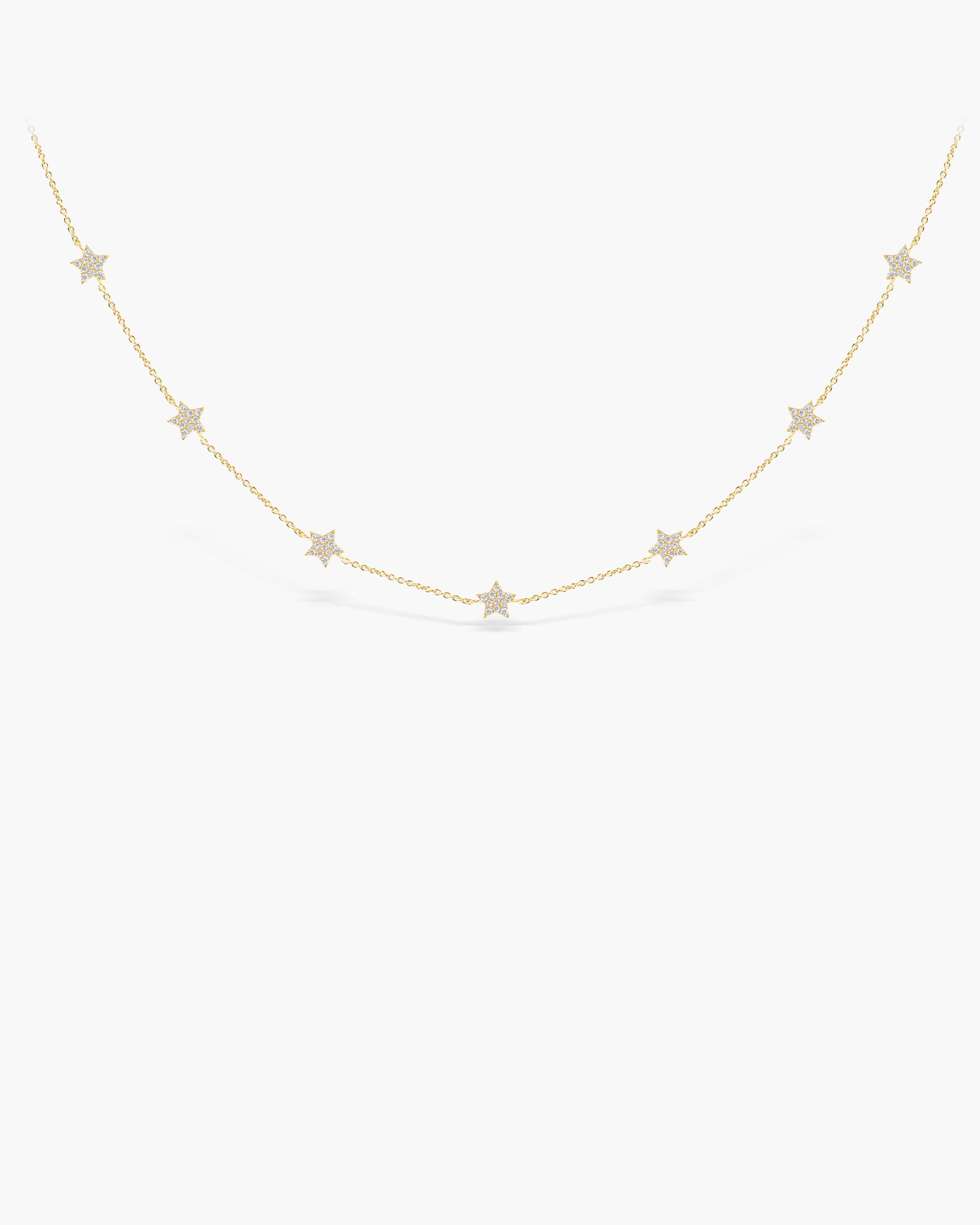 You’re a superstar, and everyone deserves to know. This necklace is handcrafted in solid gold and pavé set diamonds. The necklace features five diamond studded stars. A piece you can hold onto forever and to be paired with any outfit. The necklace is secured by a spring ring which allows you to adjust the length by 1” + or – the ordered size.
