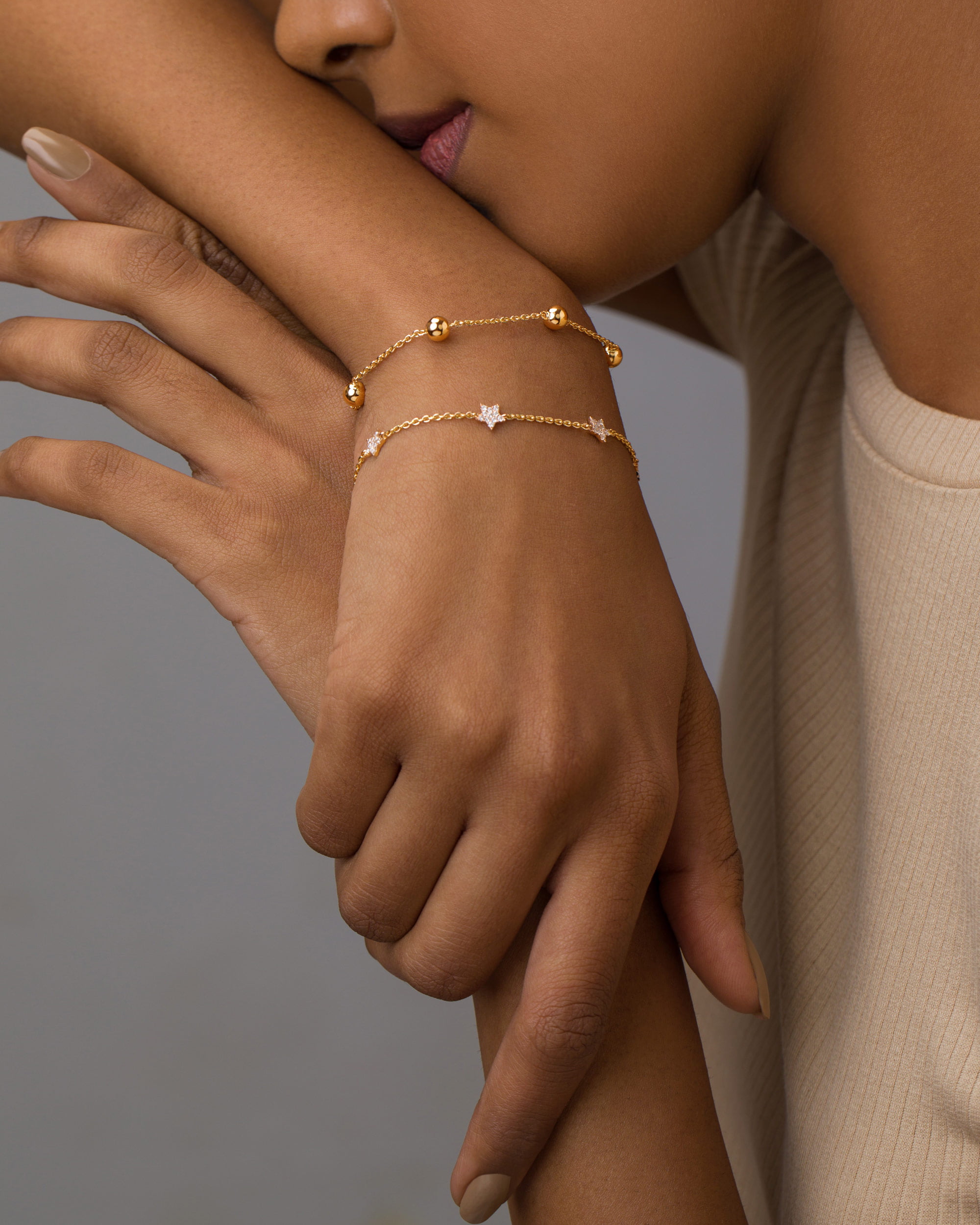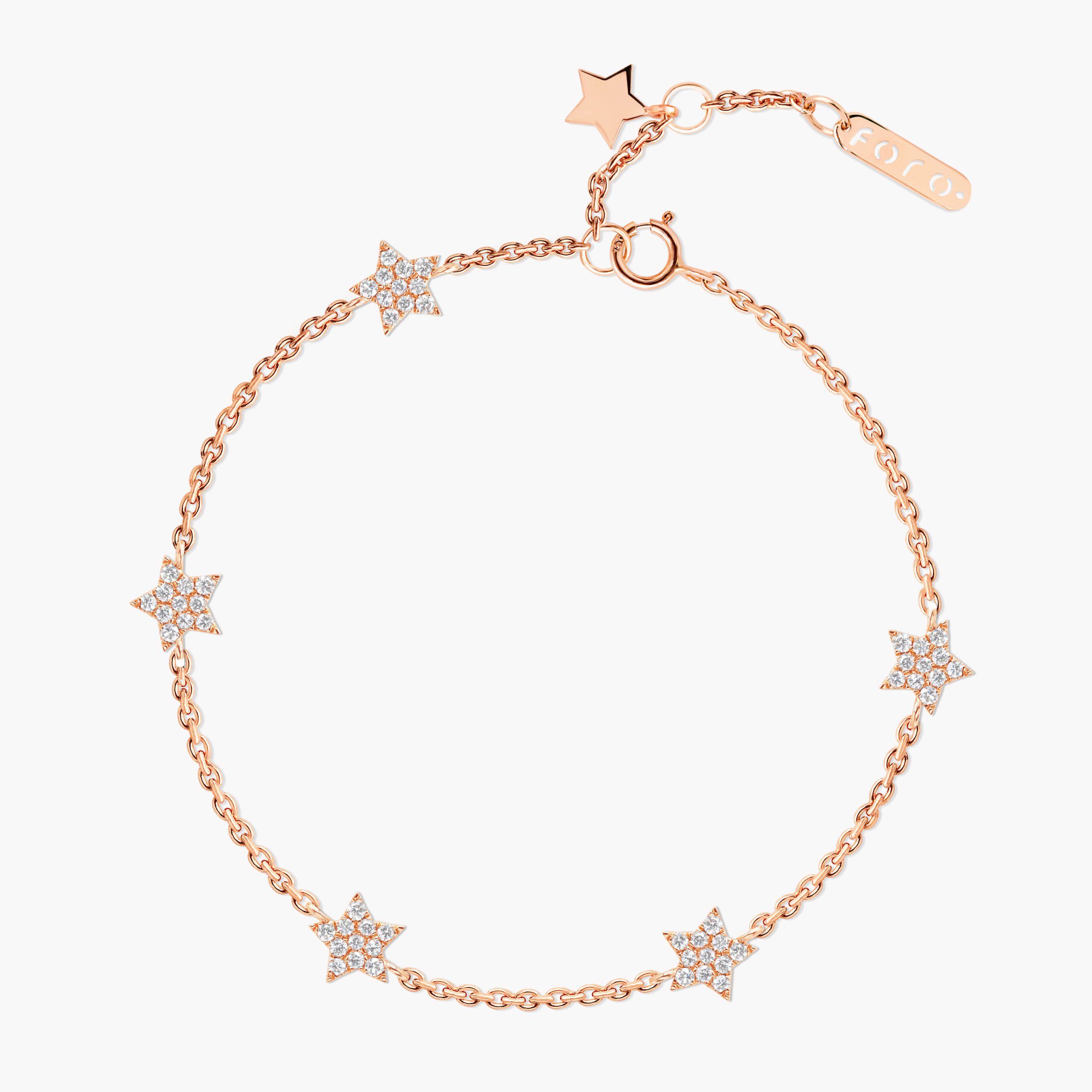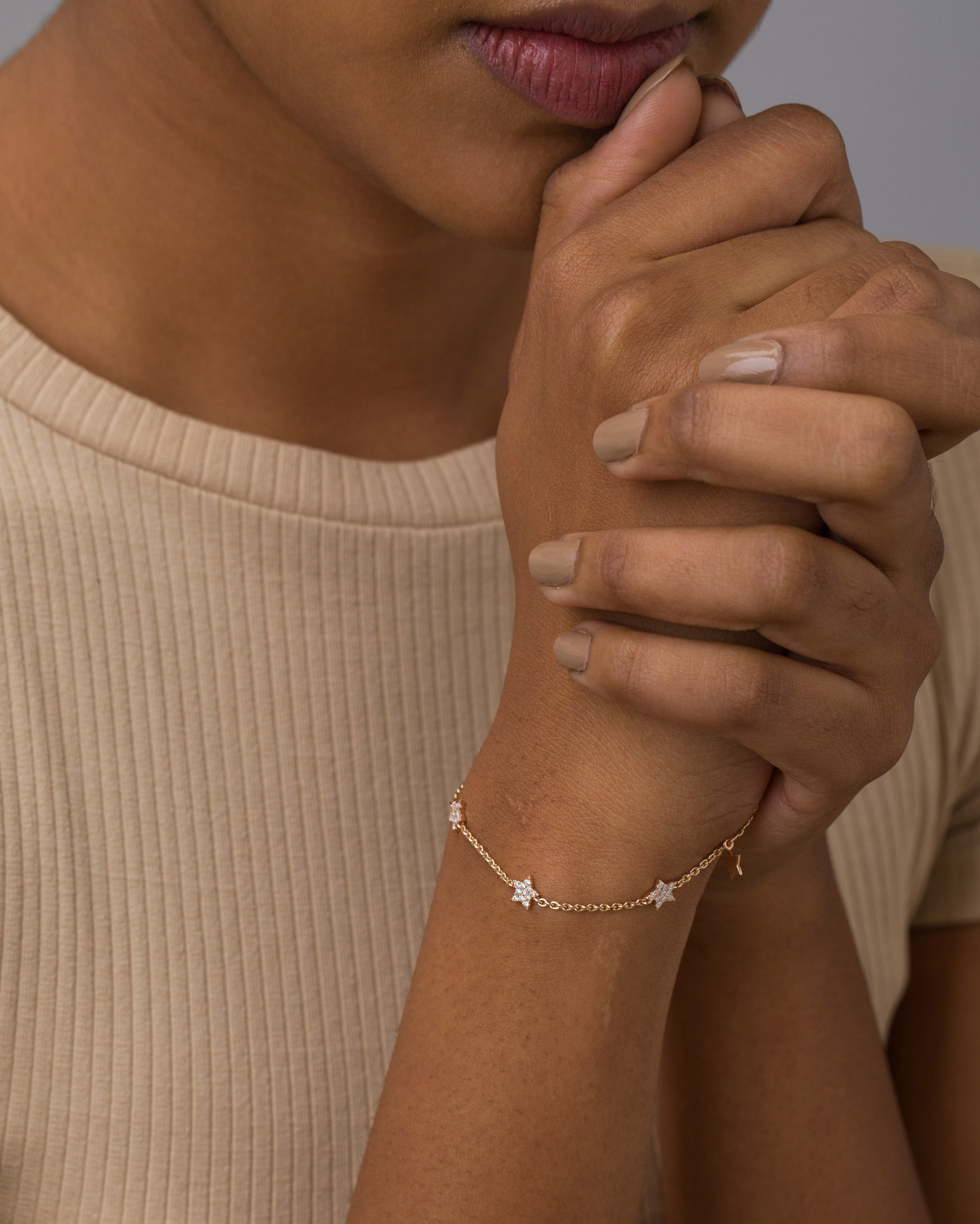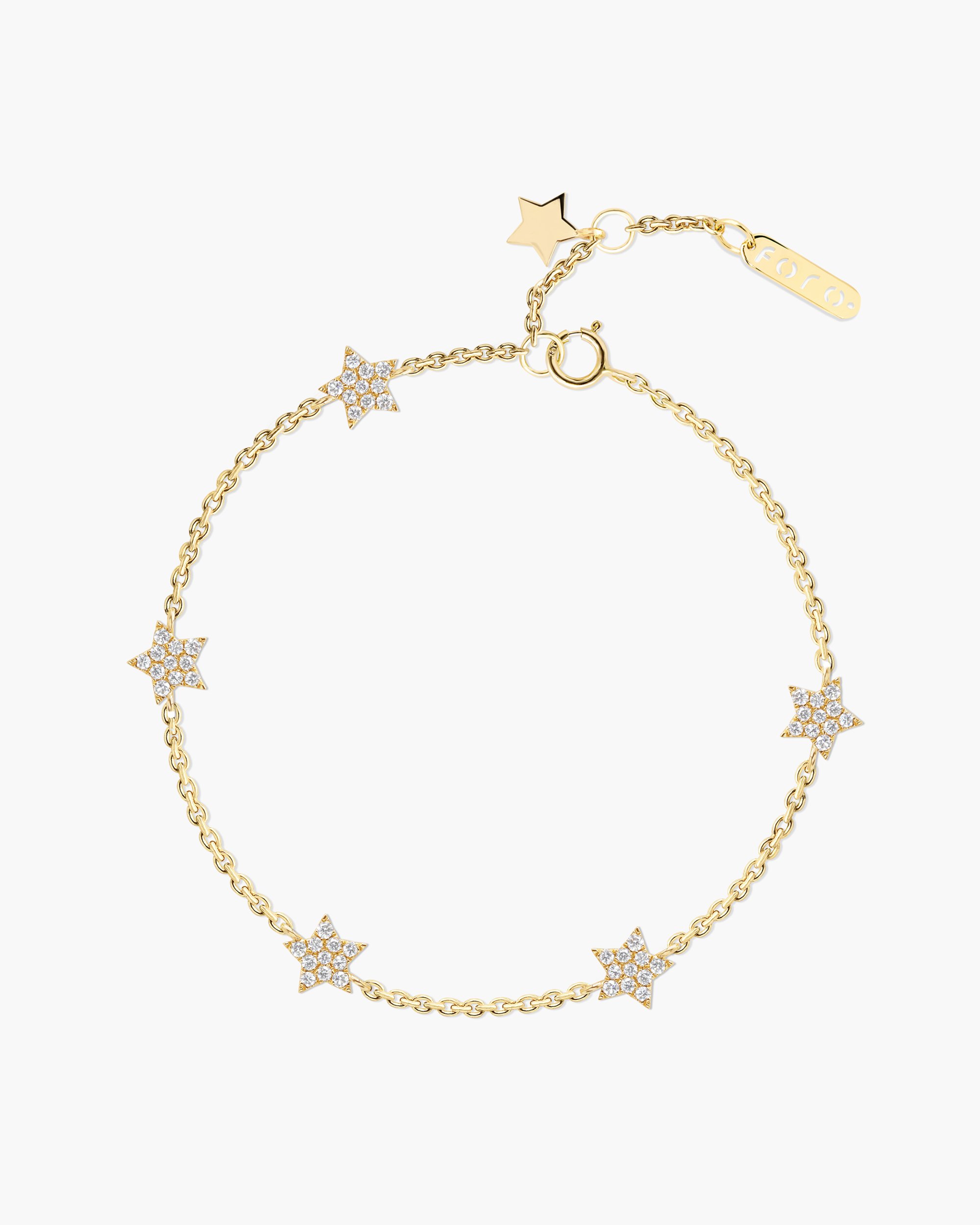 You’re a superstar, and everyone deserves to know. This bracelet is handcrafted in solid gold and pavé set diamonds, a piece you can hold onto forever.The bracelet features five diamond studded stars. The bracelet is secured by a spring ring which allows you to adjust the length by 1/2″ + or – the ordered size.