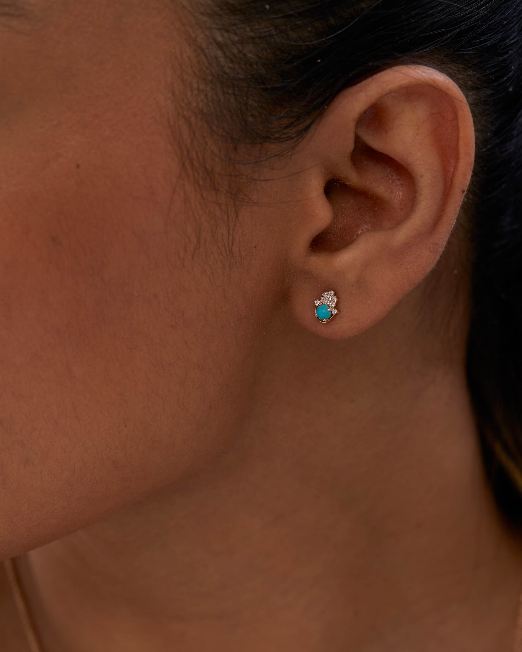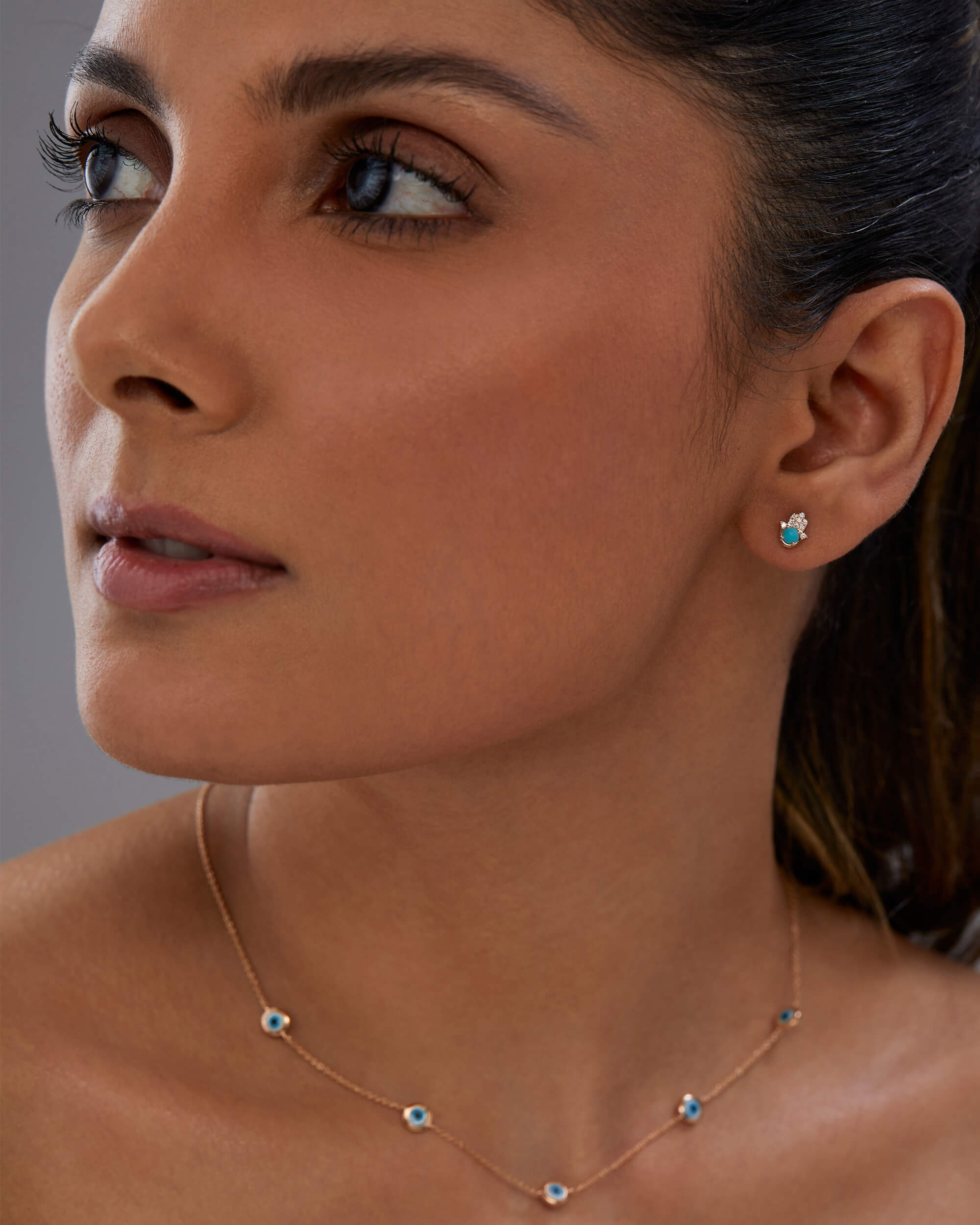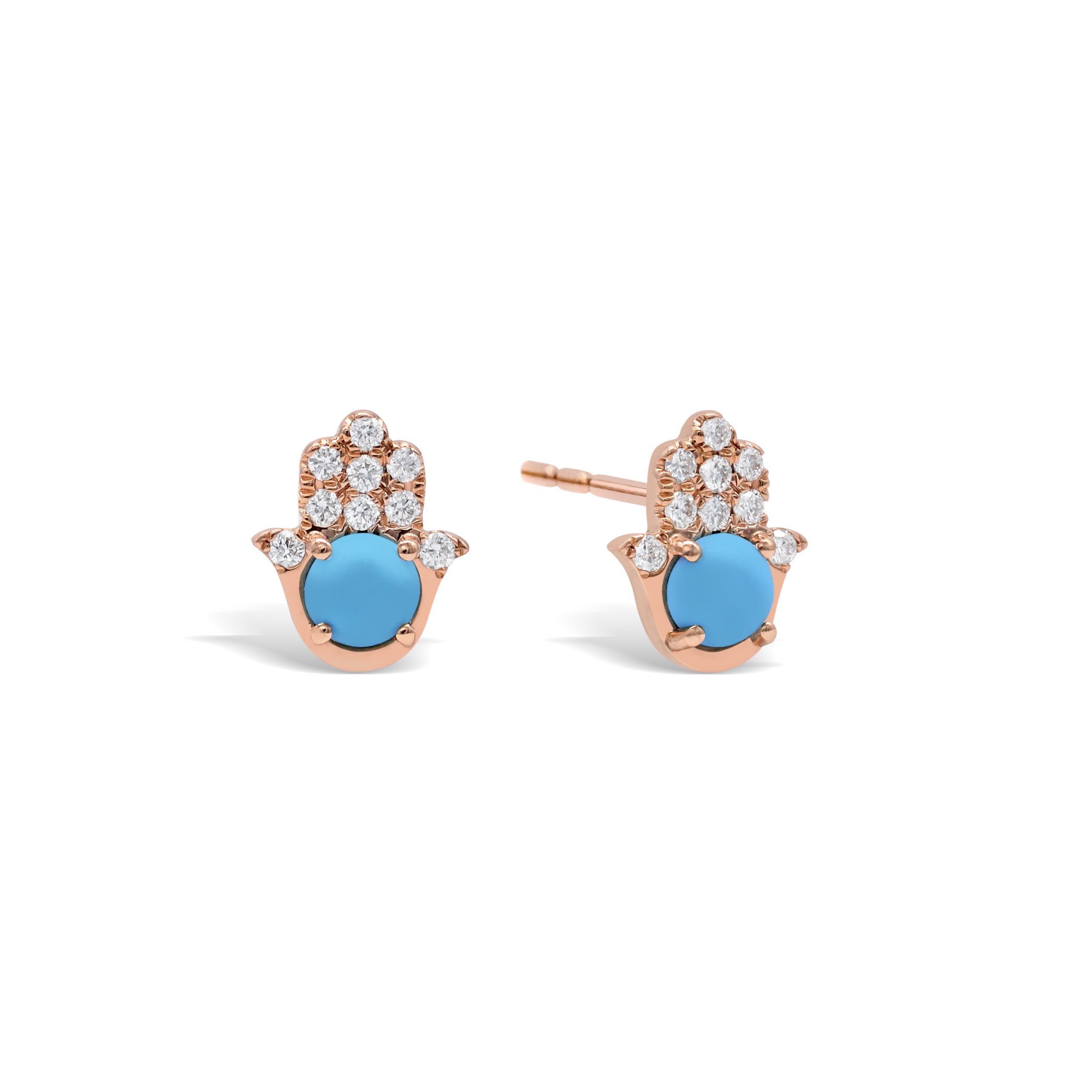 The Hamsa Hand is a talismanic symbol, symbolising the Hand of God and believed to protect from harm against evil forces. This Diamond Tiny Hamsa Evil Eye Studs is handcrafted in gold and sparkling pavé set diamonds with a turquoise bead. They have a friction butterfly ear nut for comfy and secure fit.