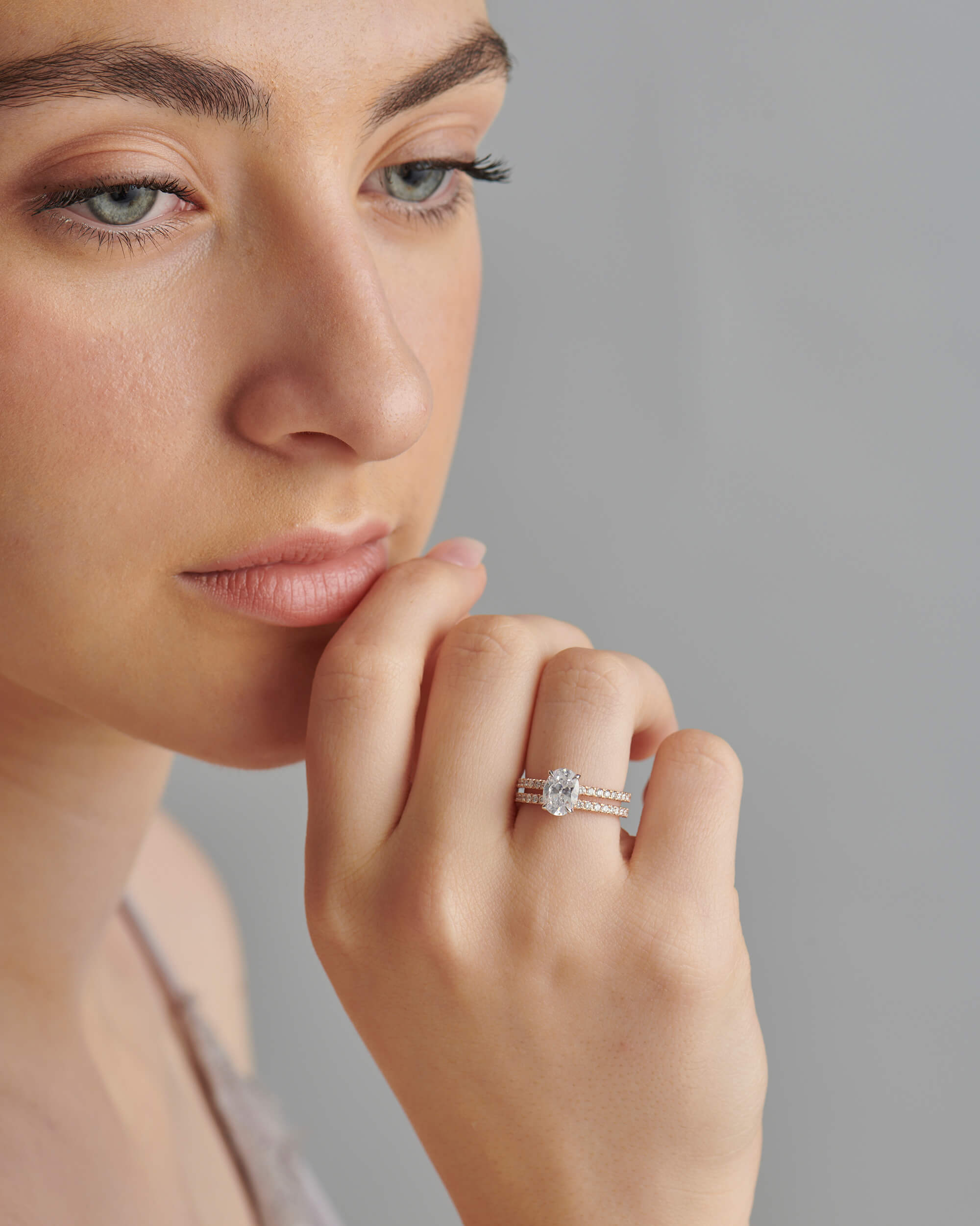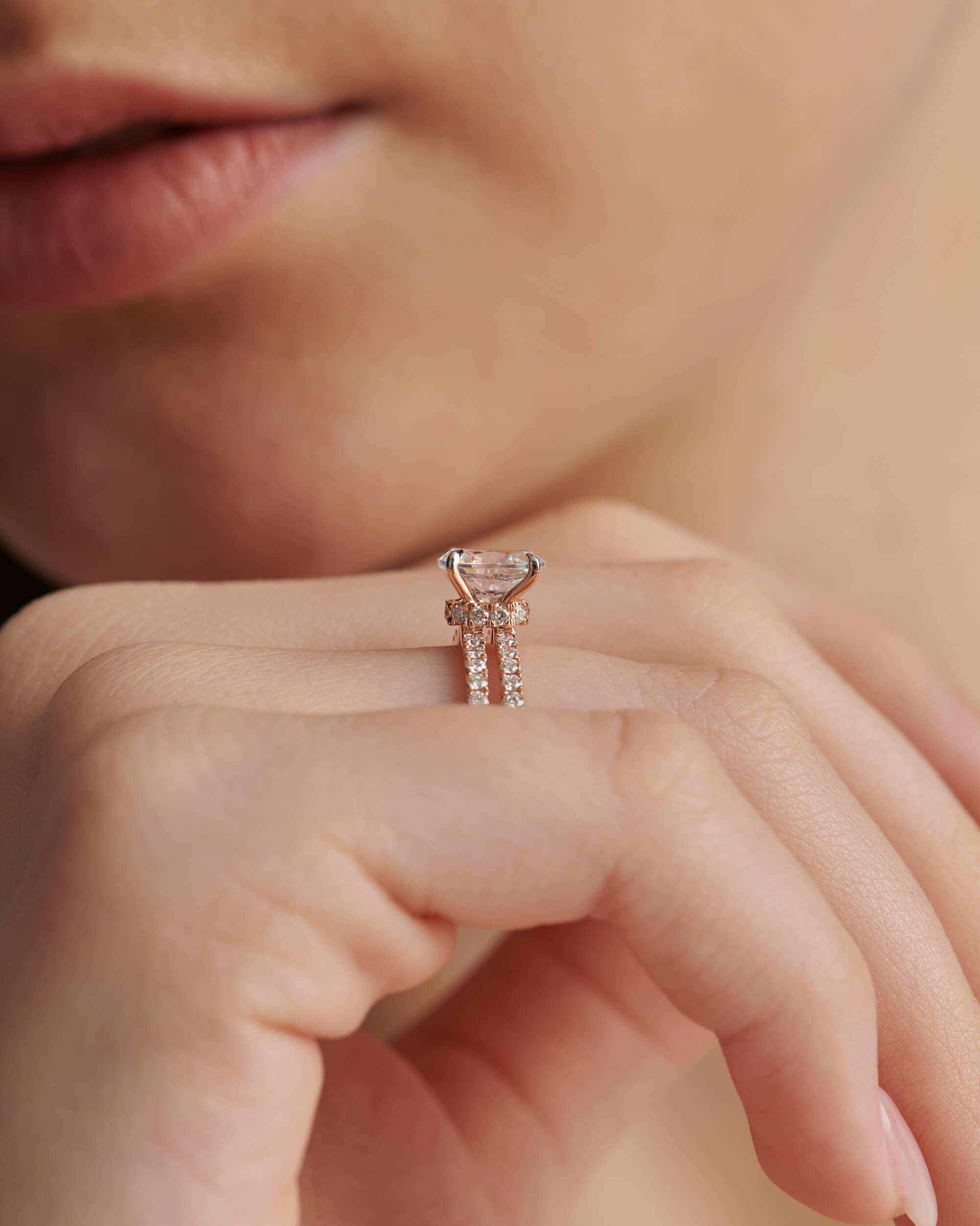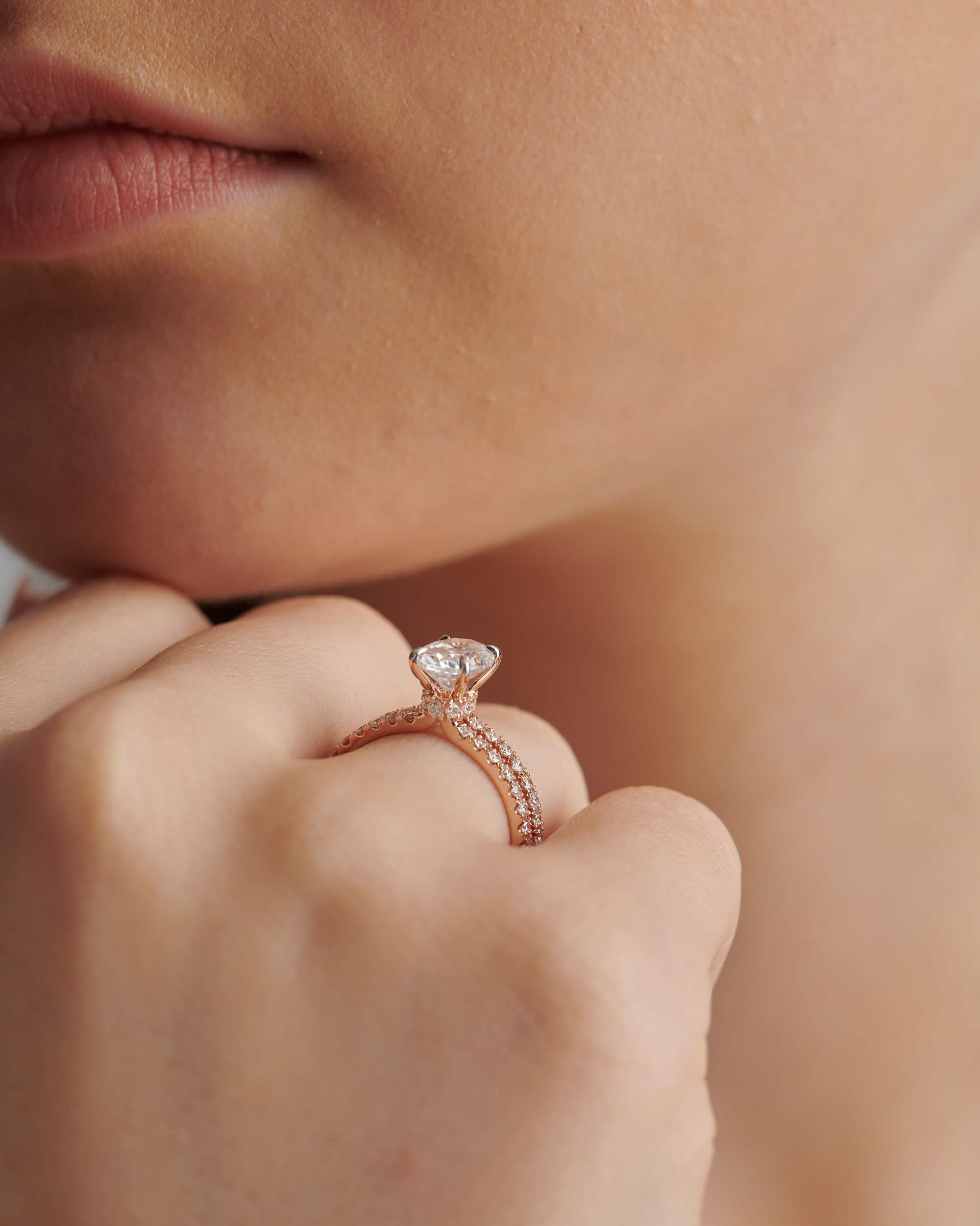 The Double Diamond Shank, Oval Solitaire Ring boasts a captivating double shank adorned with microprong set diamonds. At the center of this ring shines a brilliant round-cut solitaire in four prong with a hidden halo of diamonds meticulously tucked under the centre solitaire.