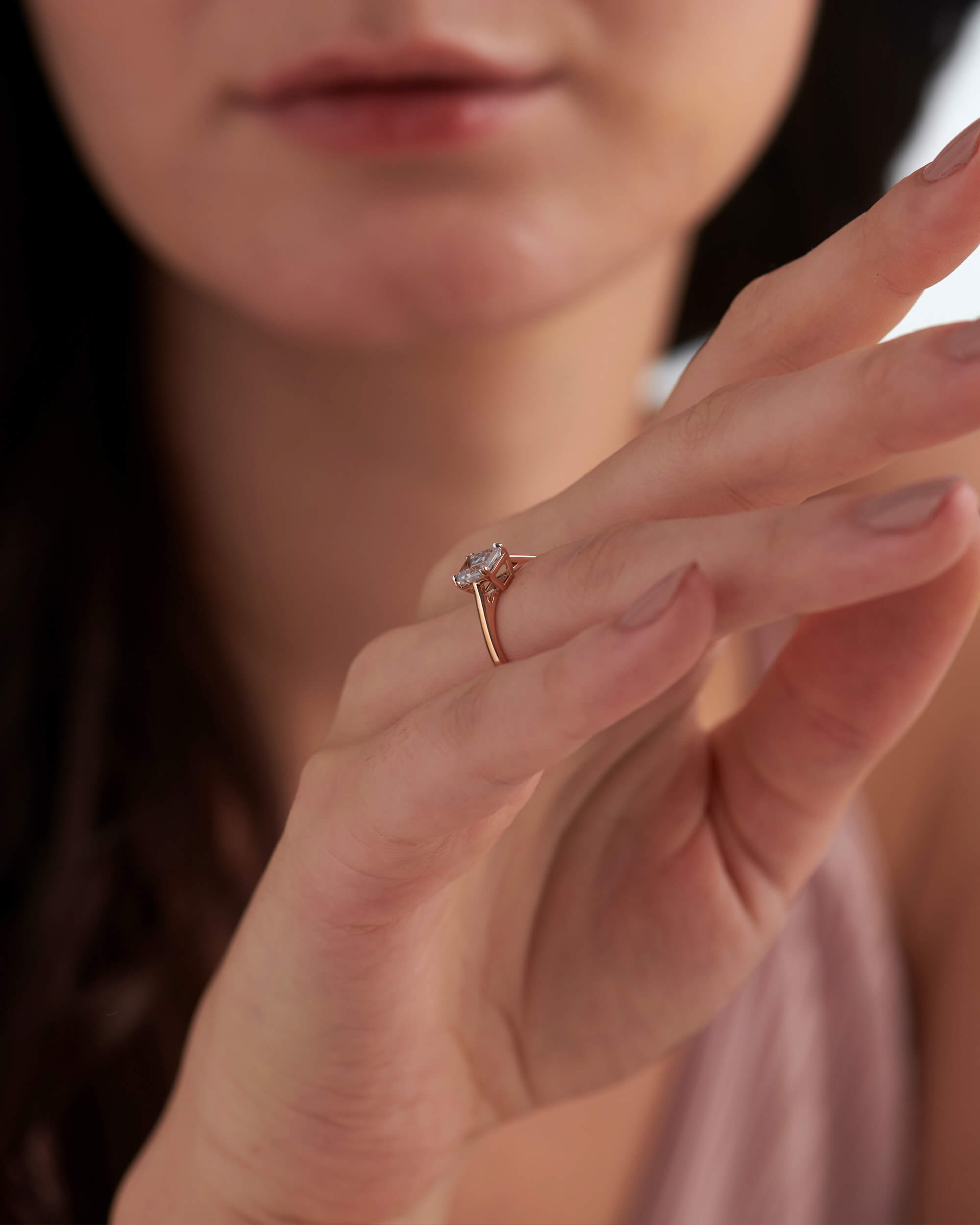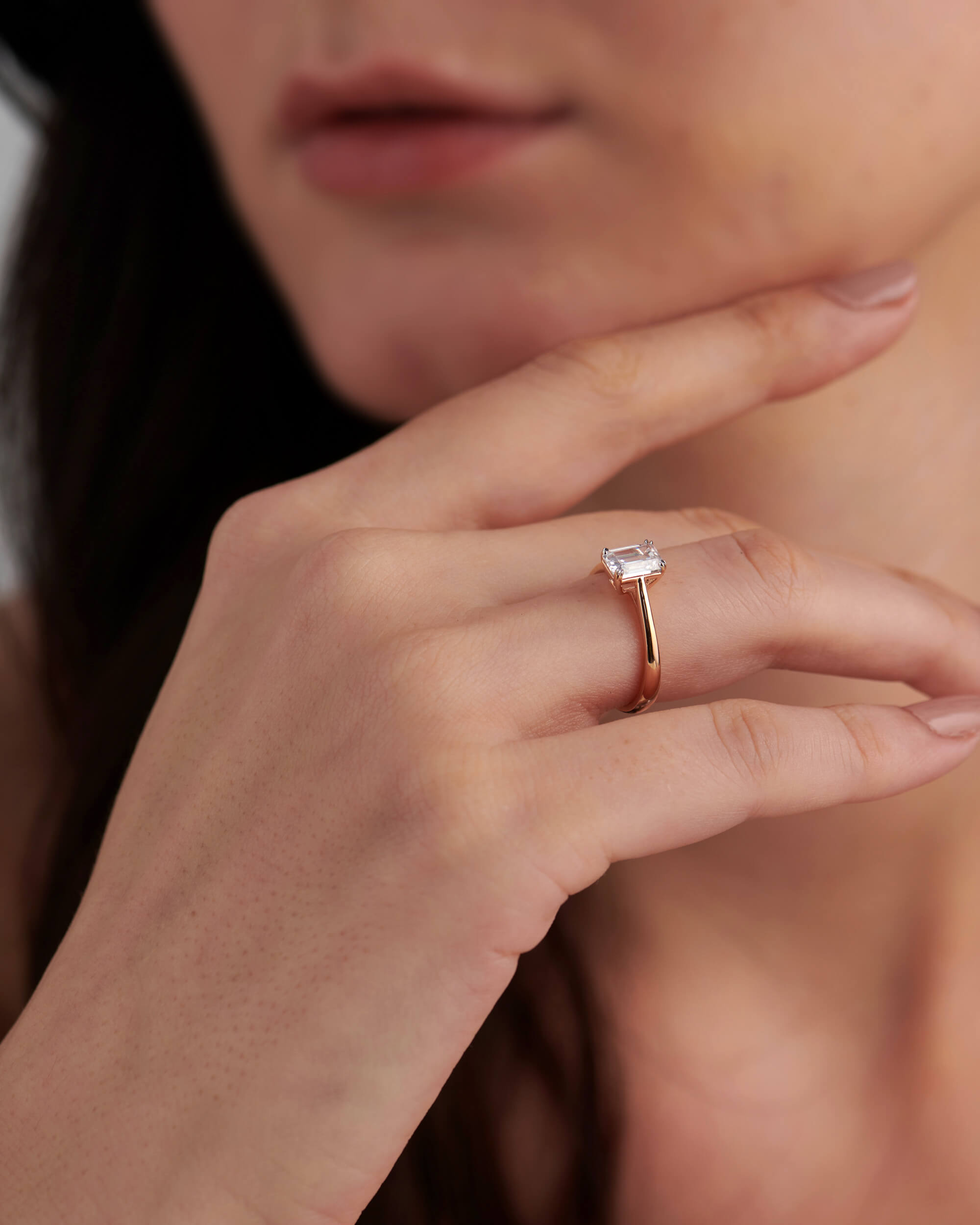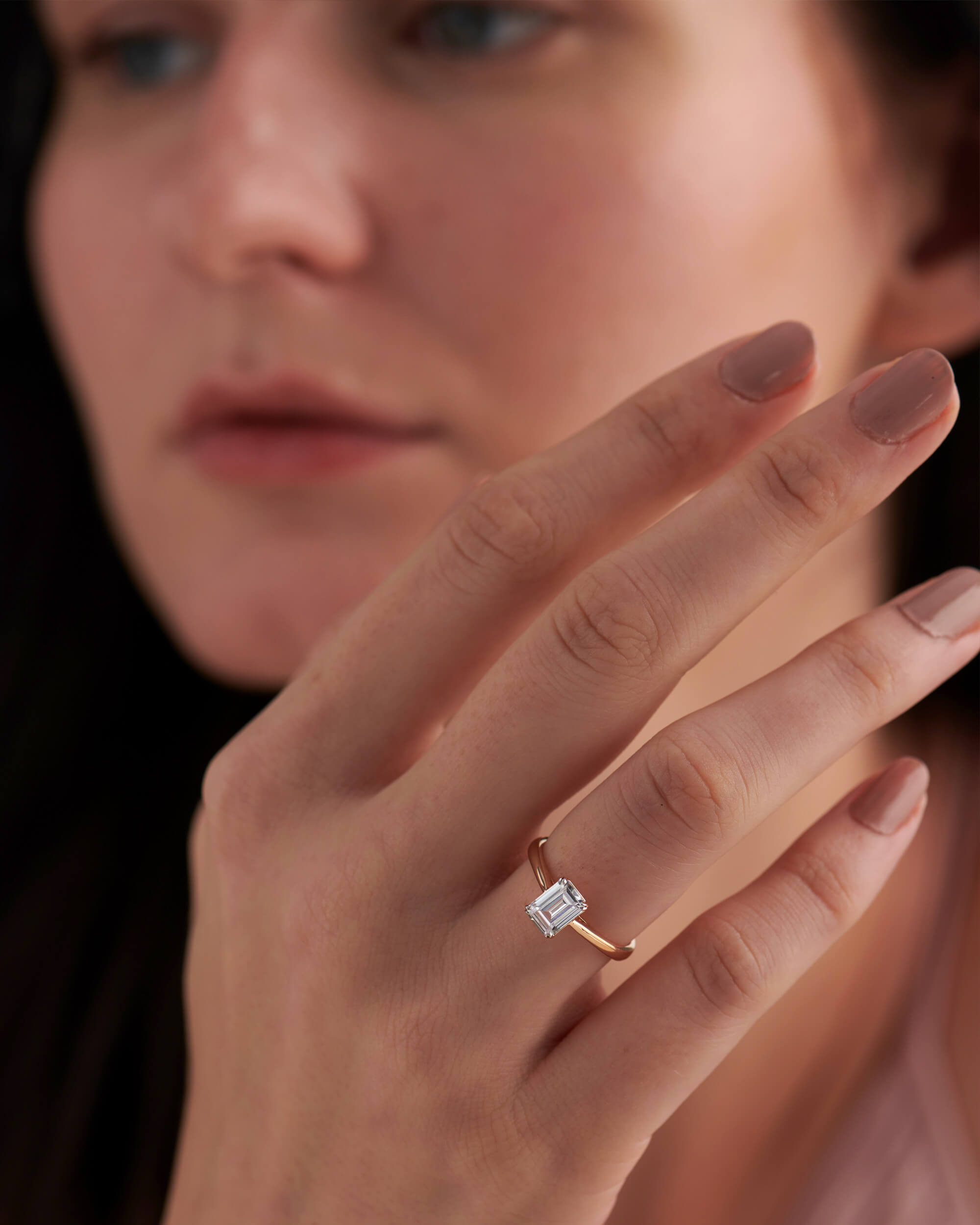 Simplicity and Elegance, this Emerald-cut Diamond Solitaire Ring is truly an exquisite piece. This ring features a 1ct emerald cut diamond set within a sleek for claw setting and fixed to our solid gold ring.