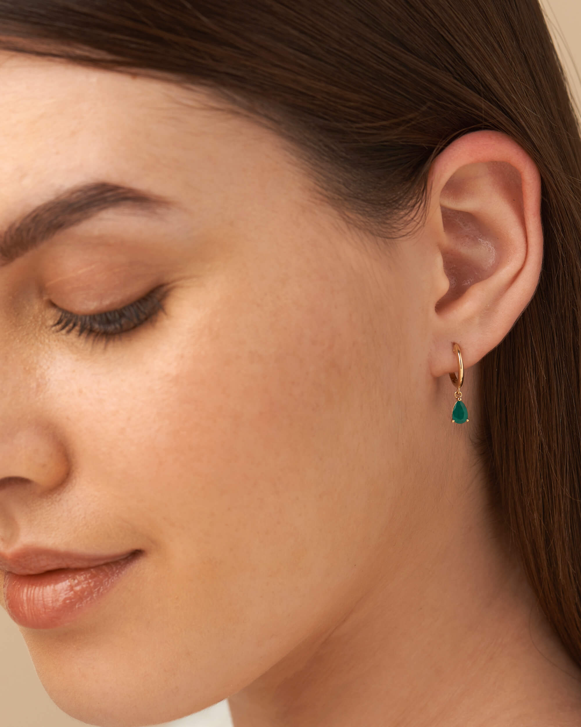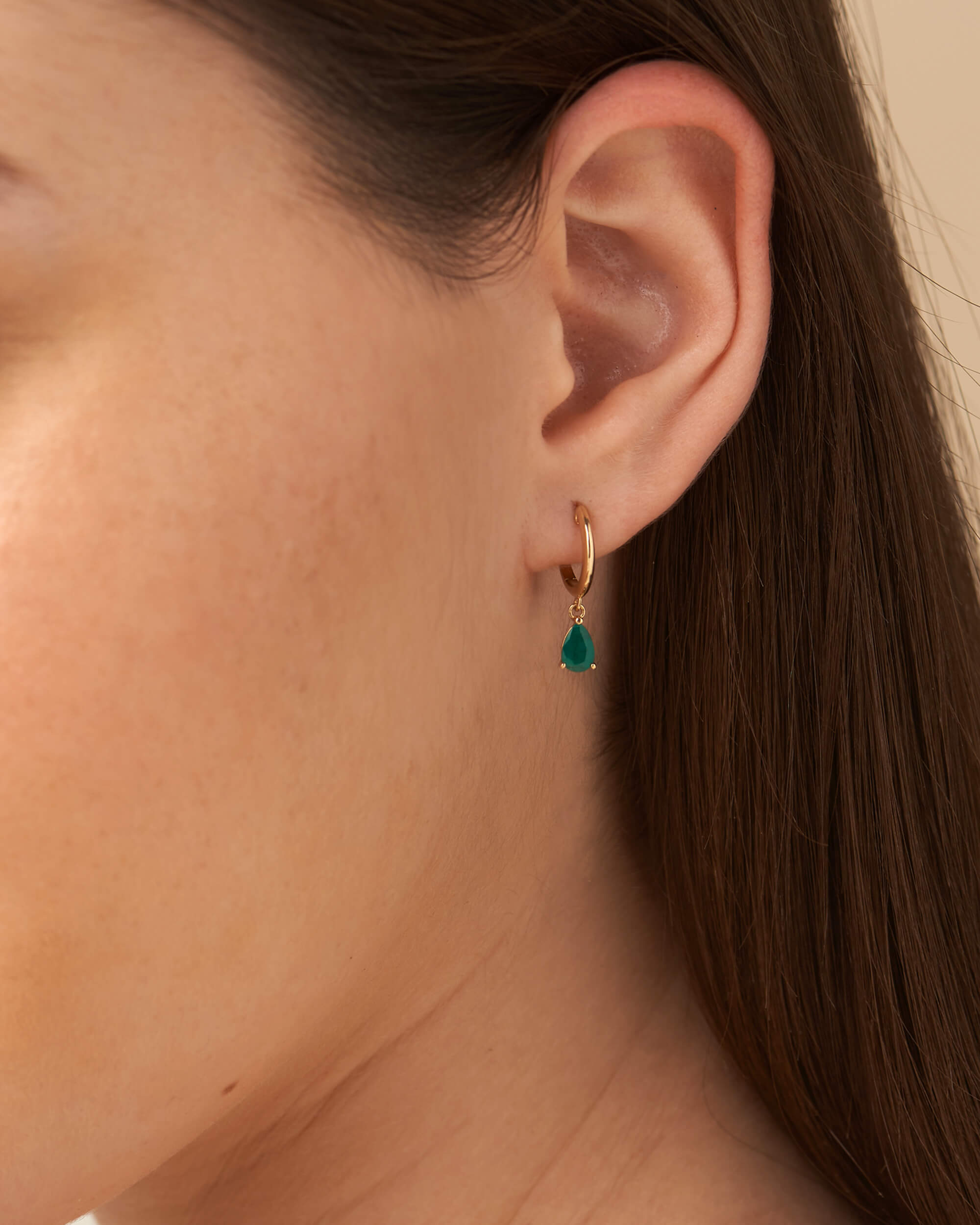 Embellish with symbol of truth, love hope and rebirth. The perfect drop and dangle earrings are elegant and will complement your dainty look. These Emerald Pear Drop Earrings features a natural emerald set in prong style and dangling from solid gold hoops.