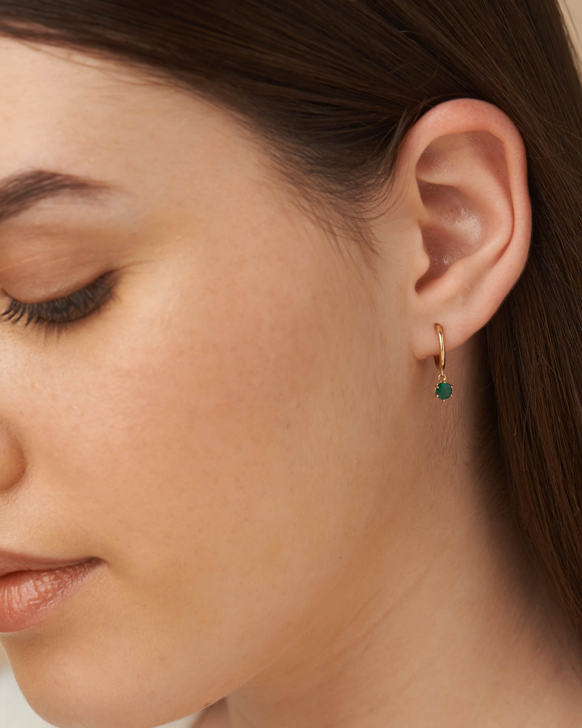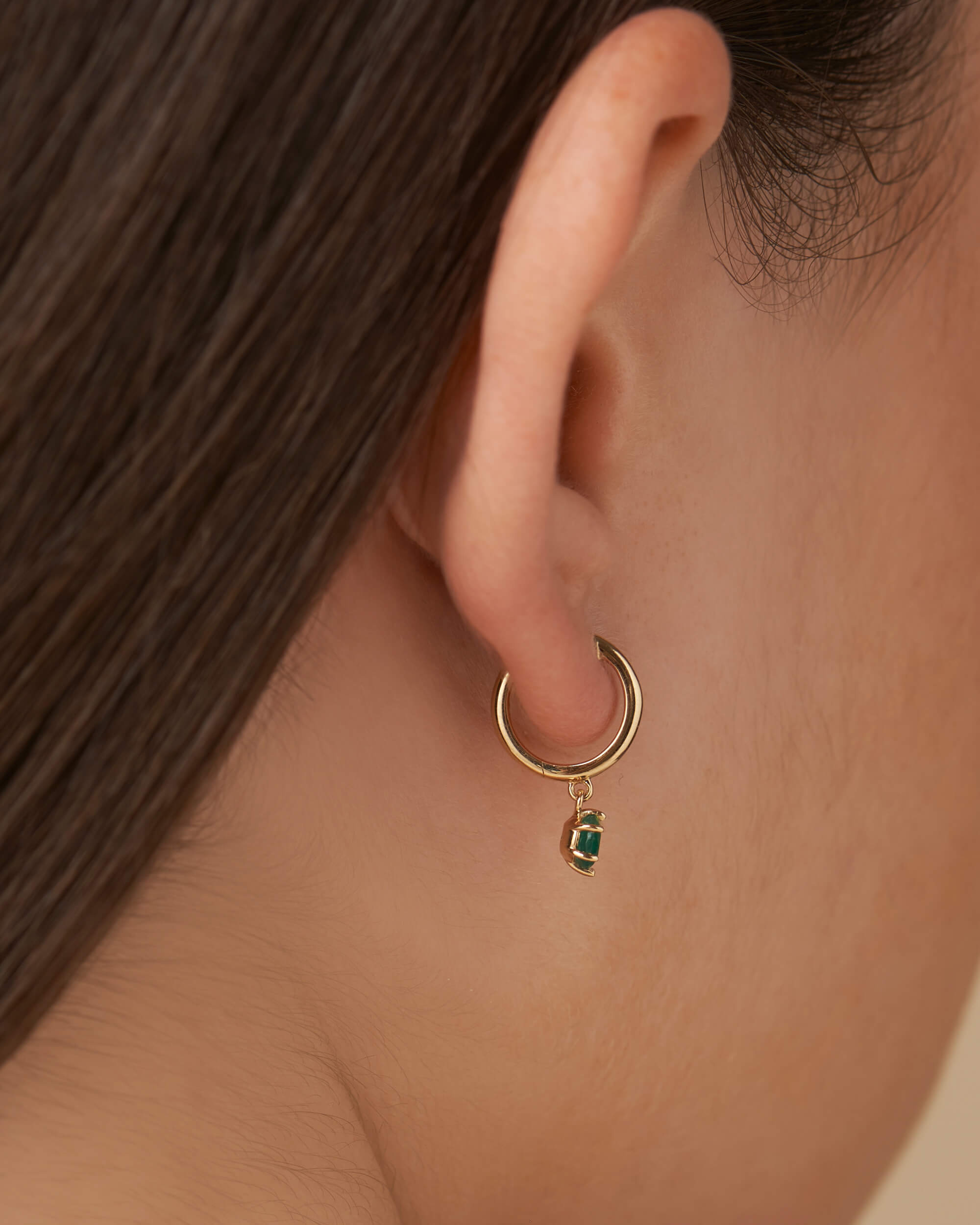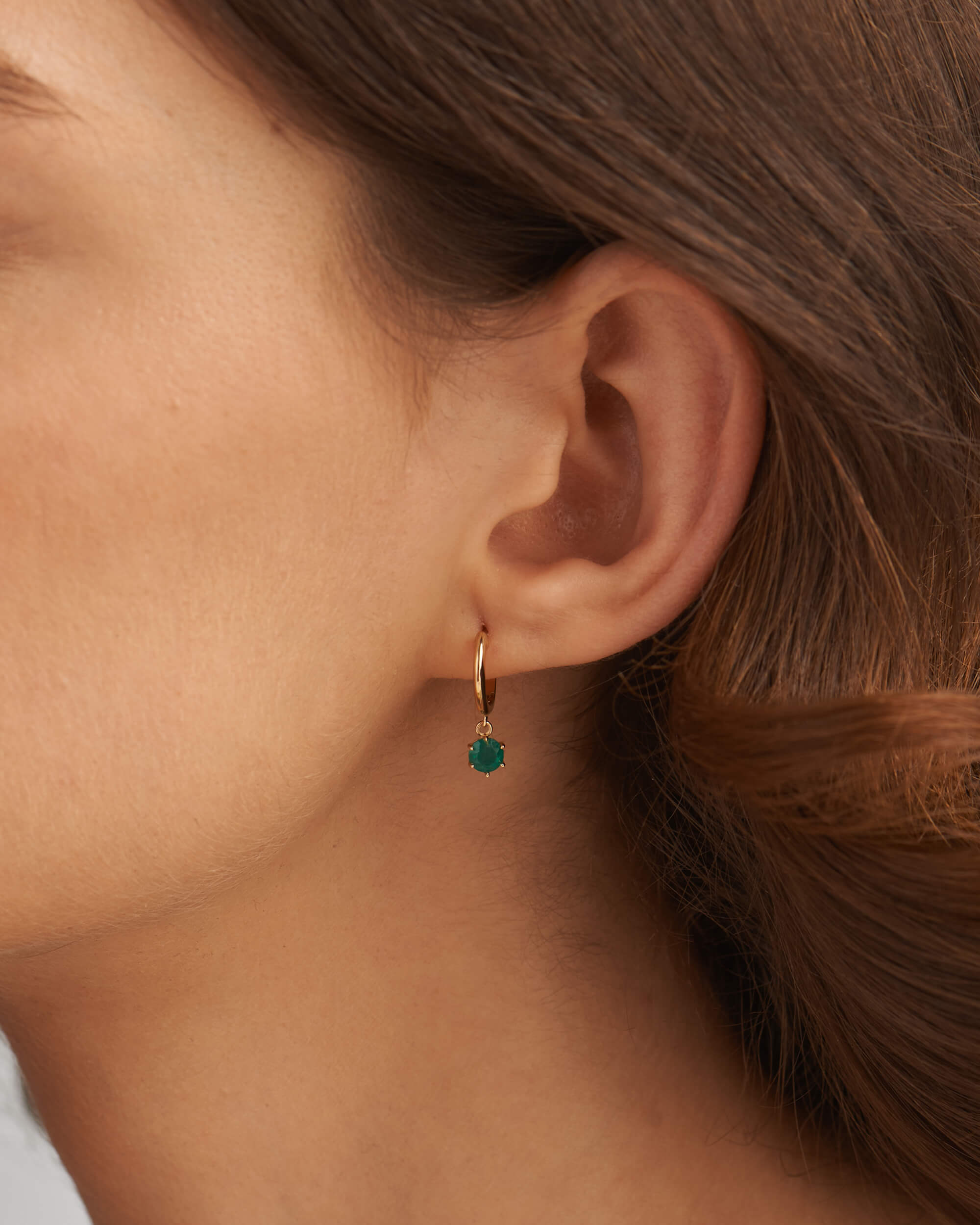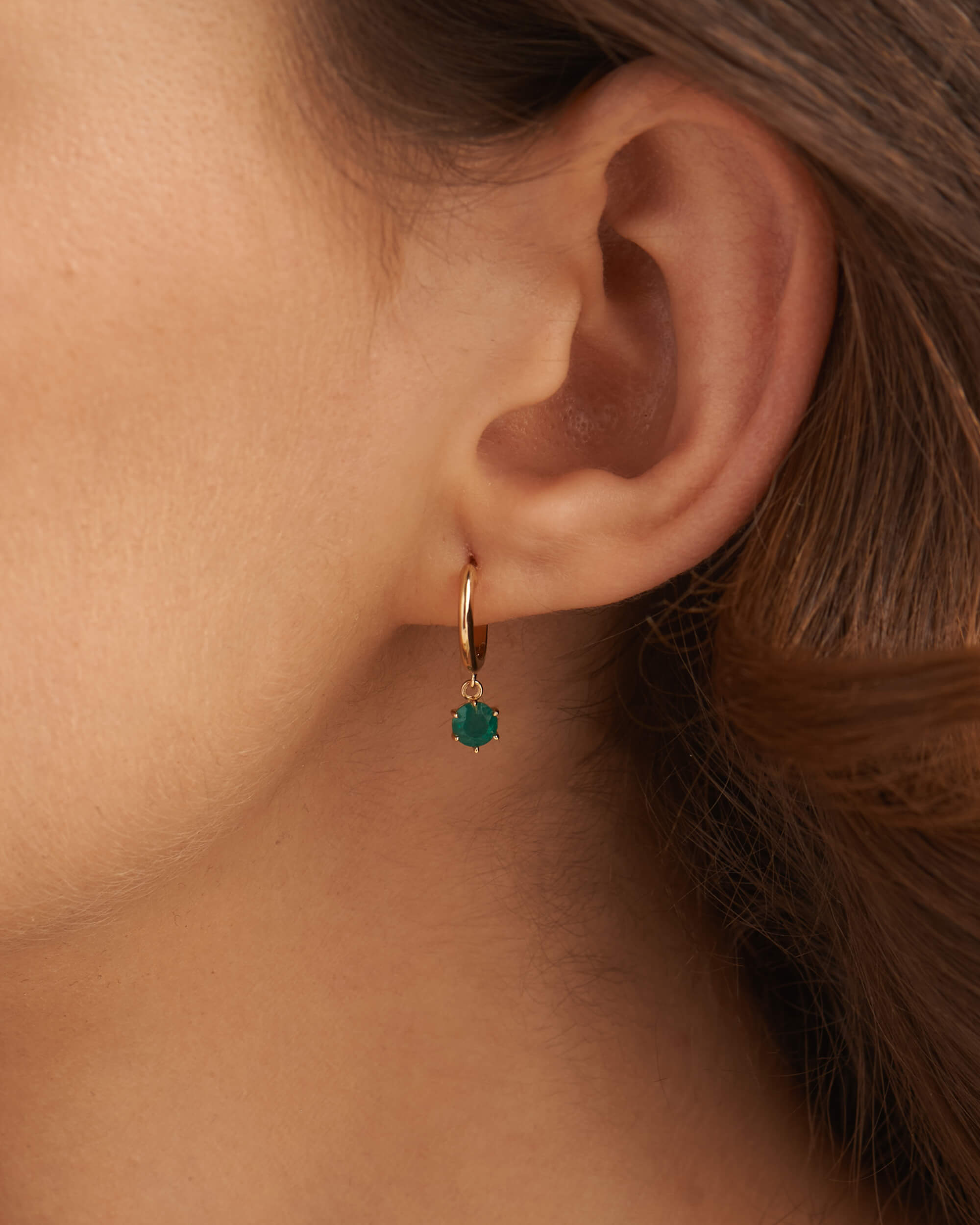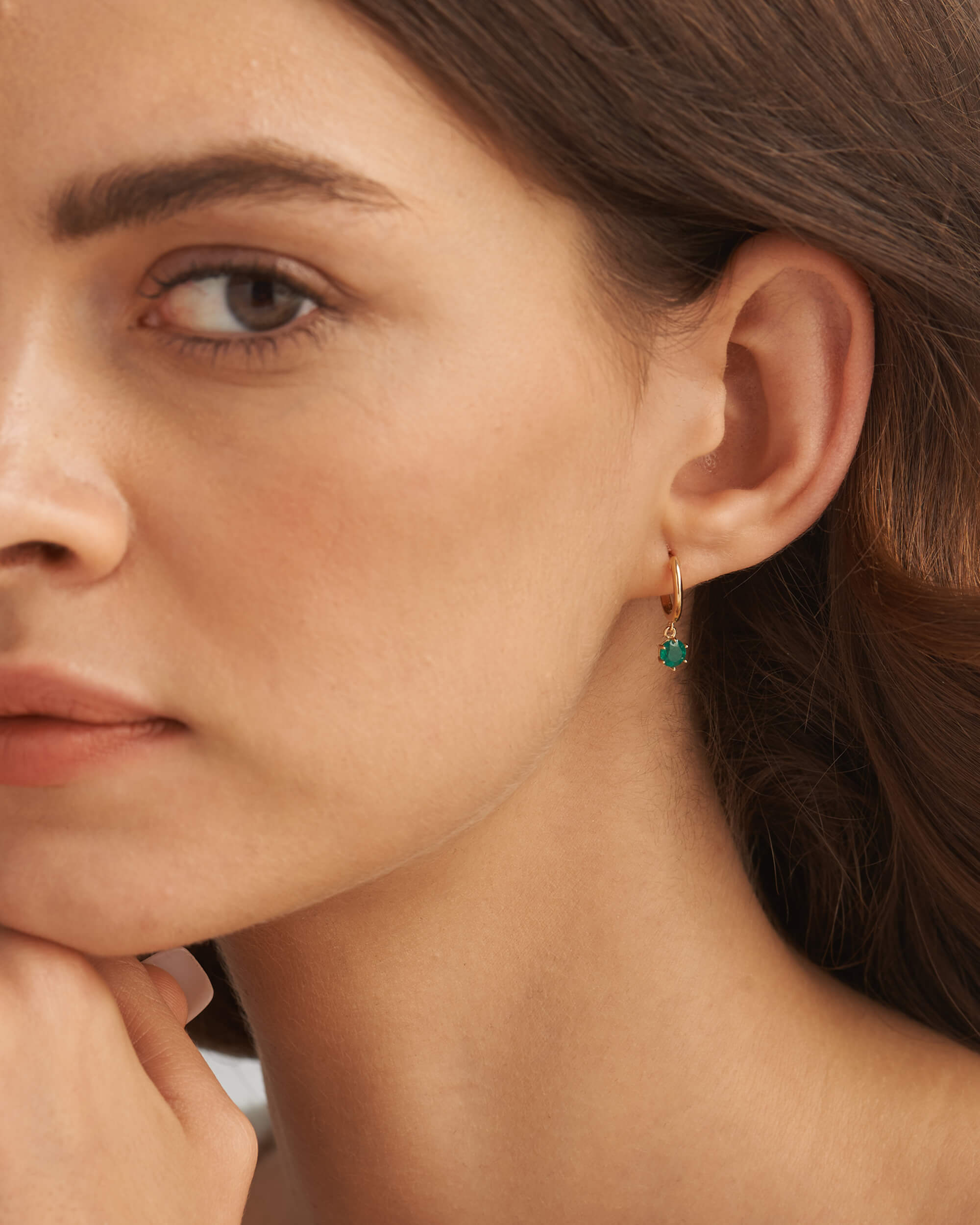 Embellish with symbol of truth, love hope and rebirth. A beautiful accessory for all green lovers and natural gemstones. These Emerald Round Drop Earrings features a natural emerald set in prong style and dangling from solid gold hoops.
