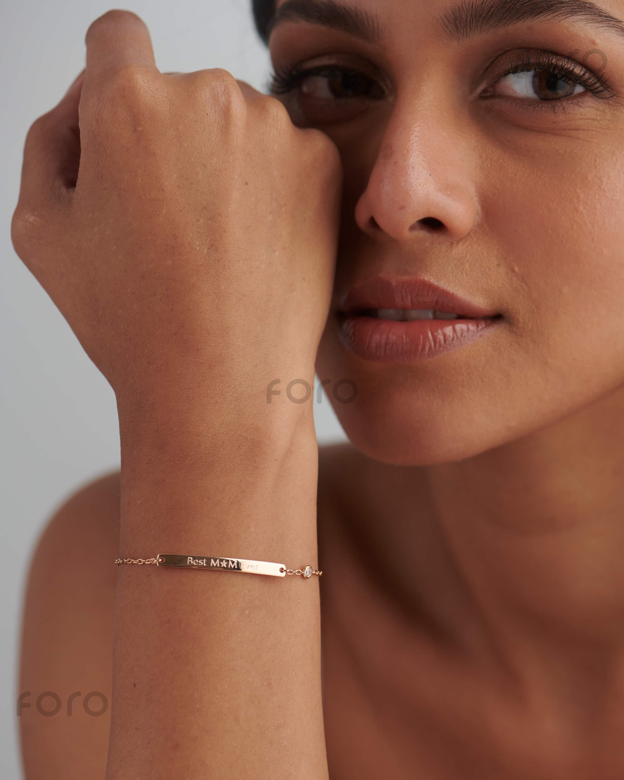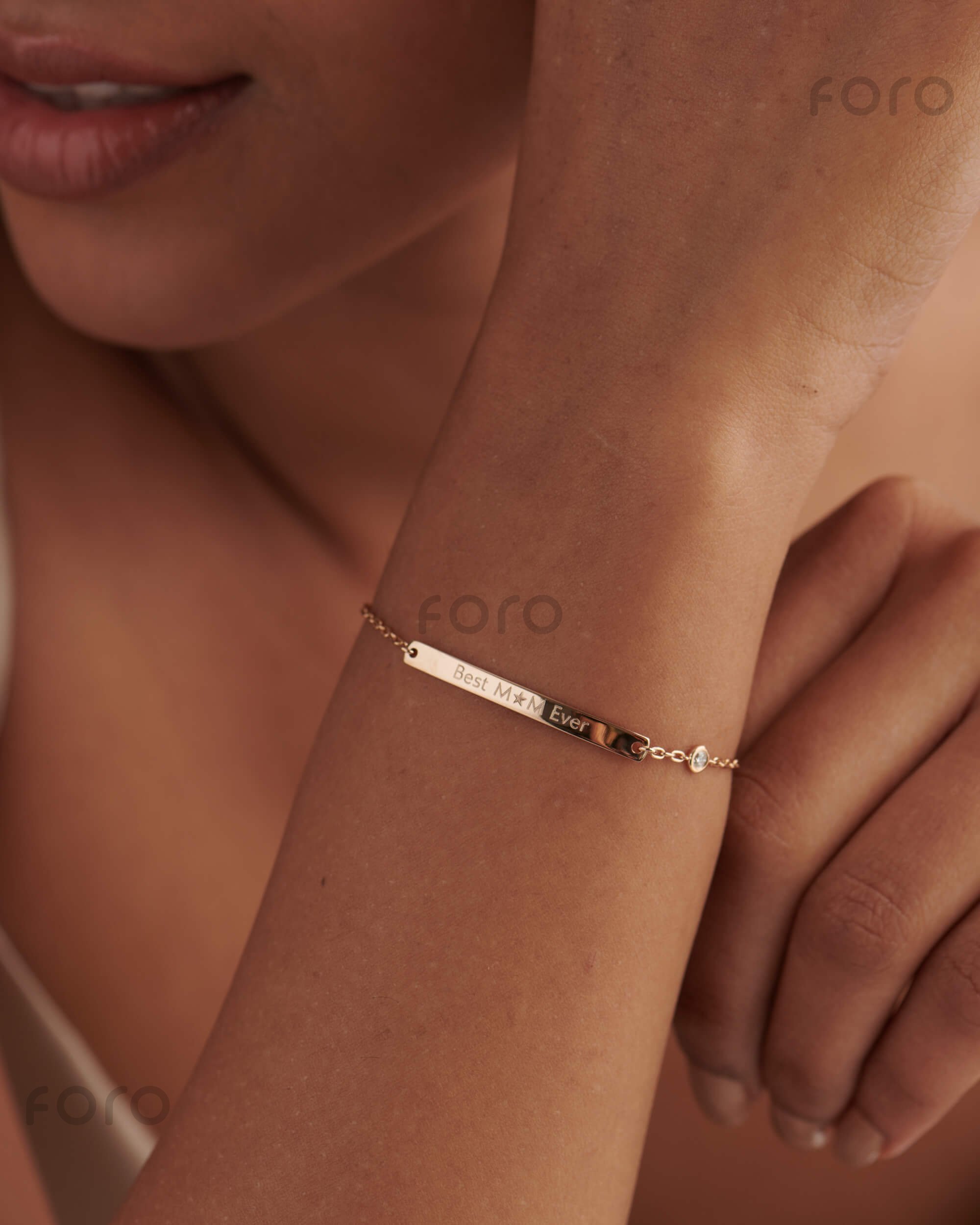 Our personalised bracelet features an engravable bar (30mm) that is simple, elegant and can be personalised. Engrave your memorable date, name or initials to commemorate the special bonds. Handcrafted in solid gold and finished with high polish and a diamond accent to add to the finesse.