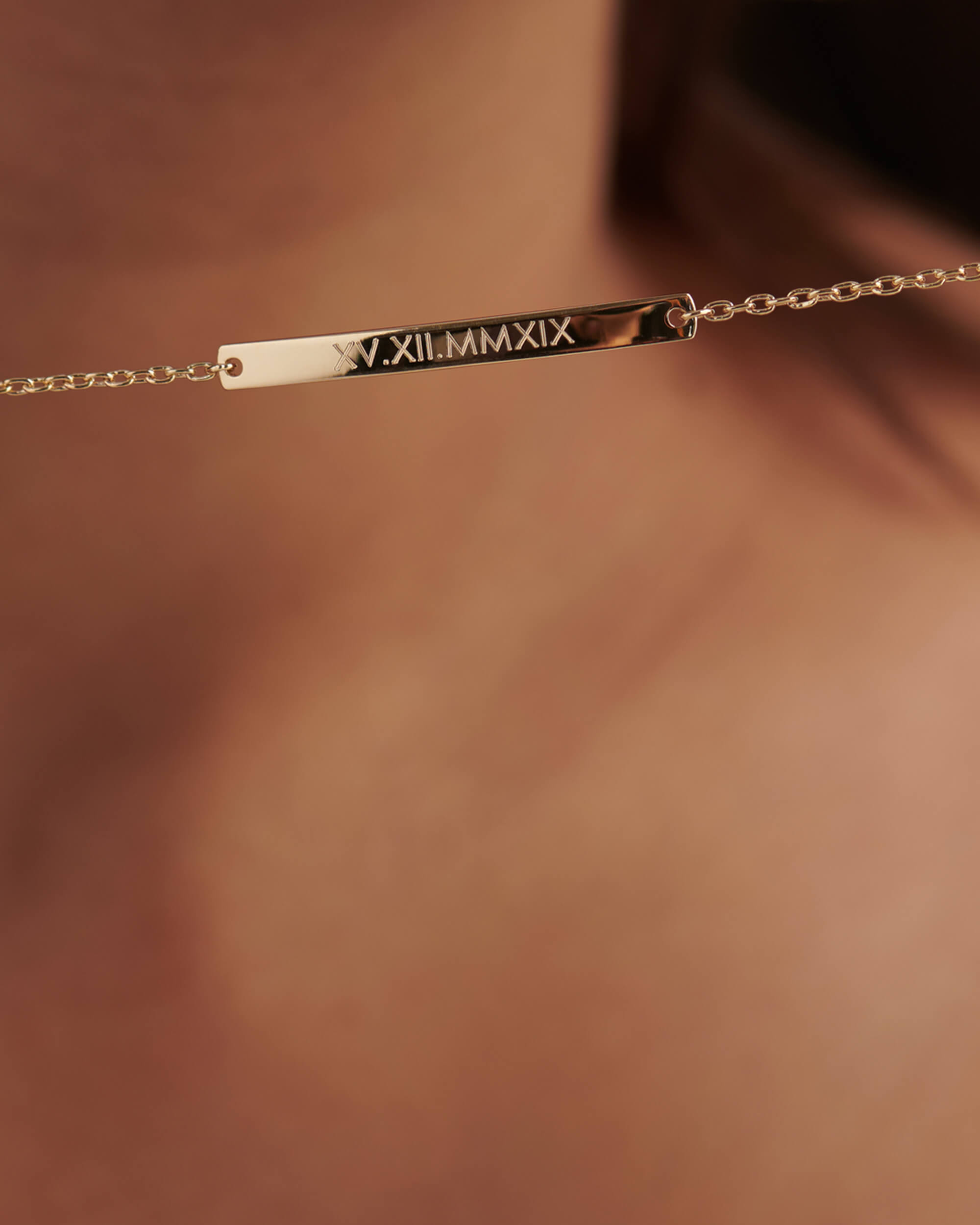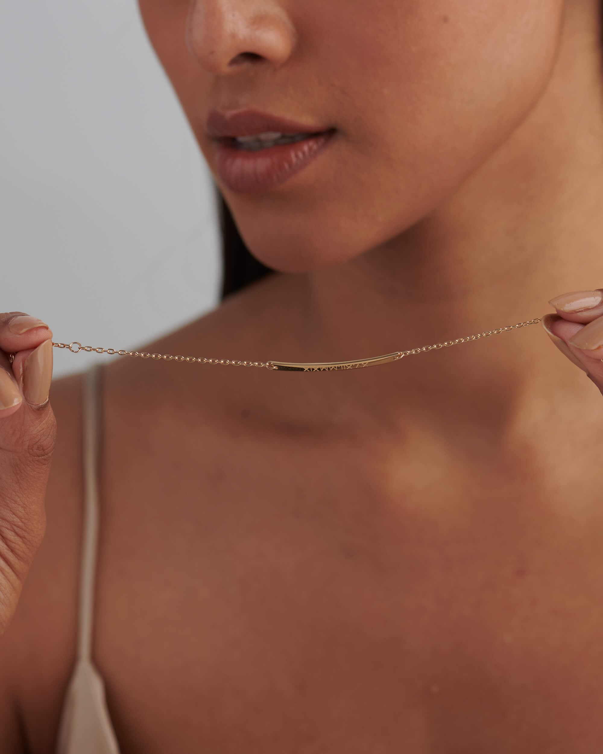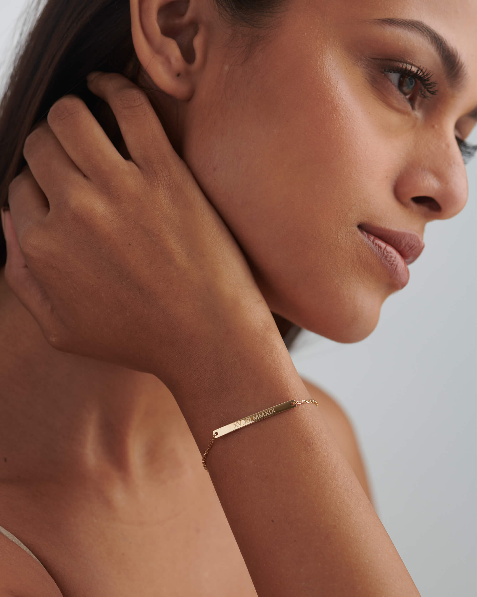 Our personalised bracelet features an engravable bar (30mm) that is simple, elegant and can be personalised. Engrave your memorable date, name or initials to commemorate the special bonds. Handcrafted in solid gold and finished with high polish.