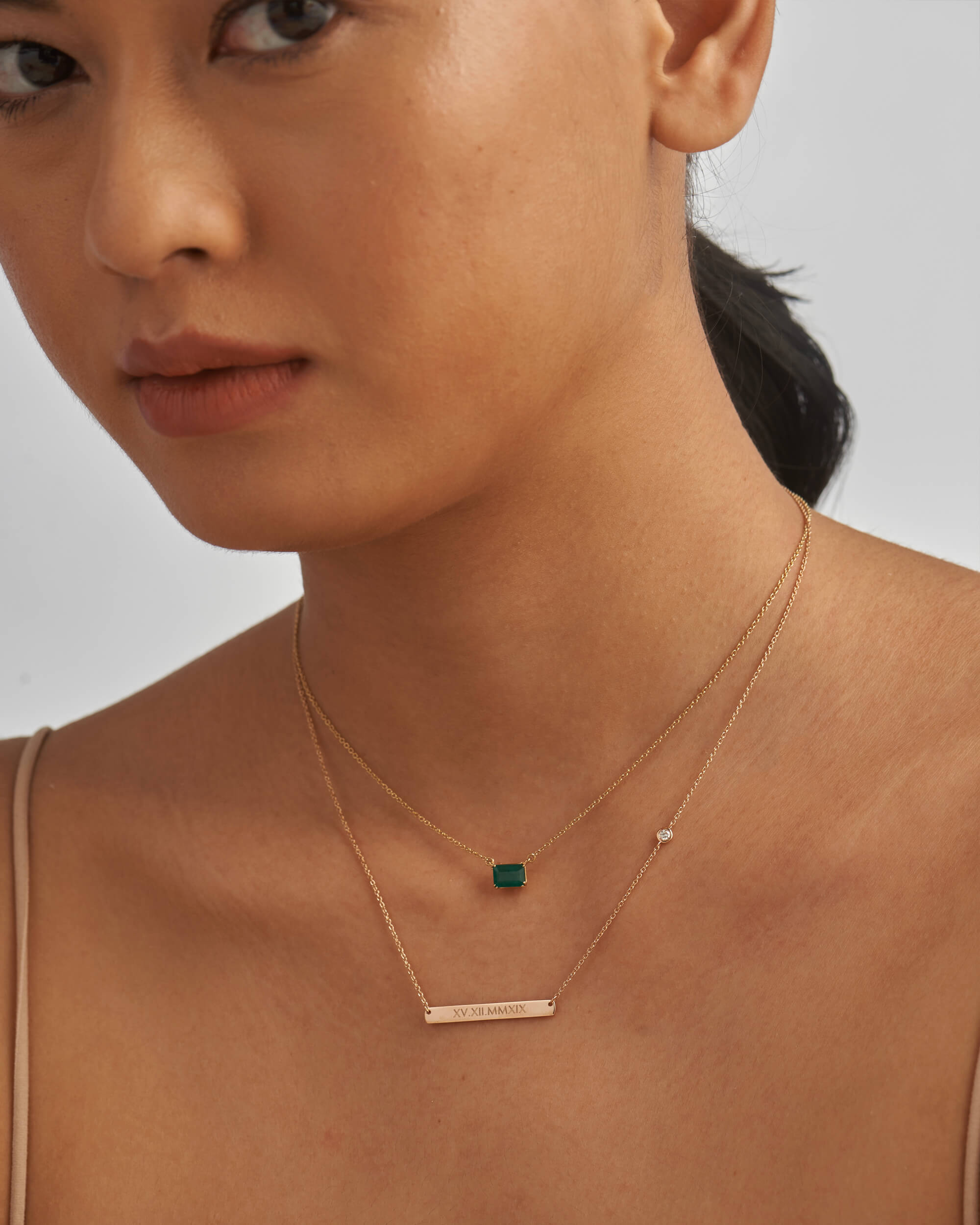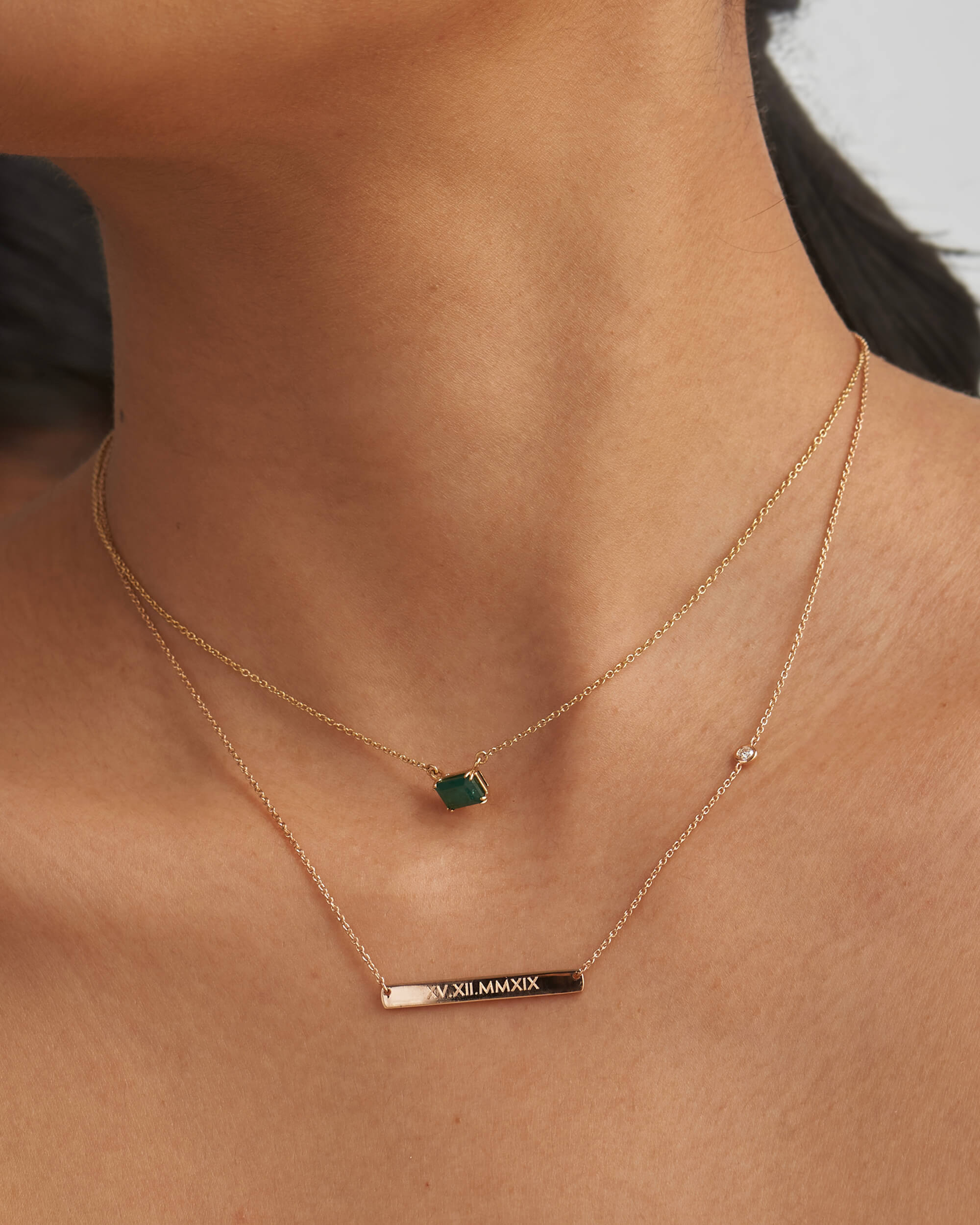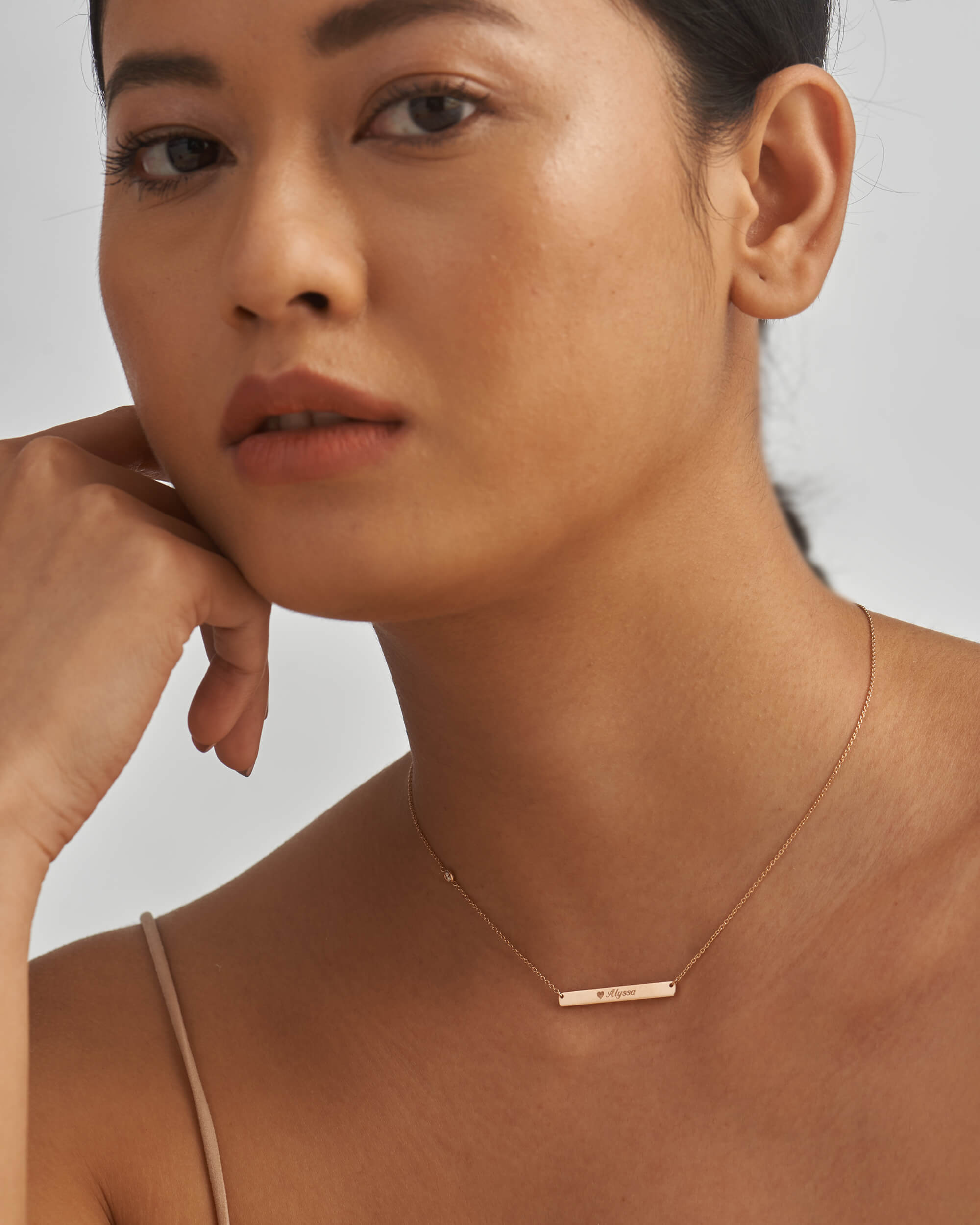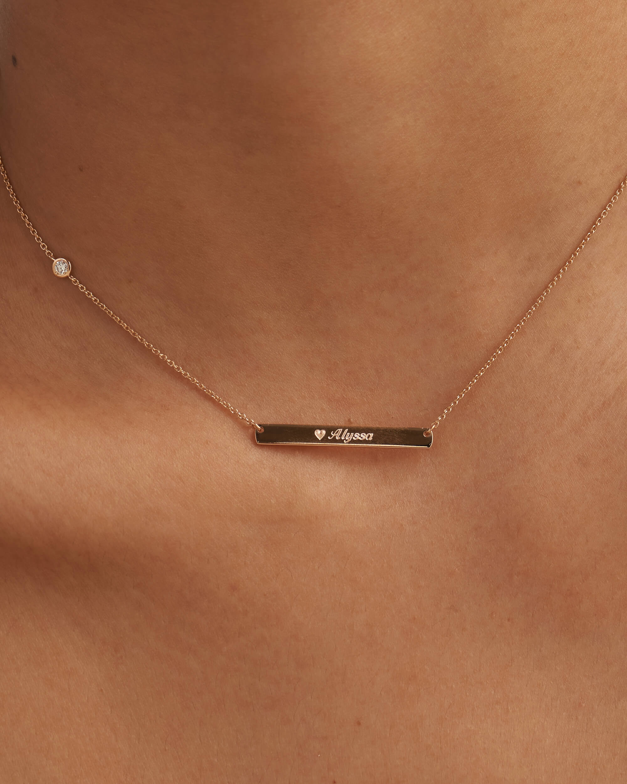 Our personalised necklace features an elegant engraveable bar (30mm) that hangs from a solid gold chain. Engrave your memorable date, name or initials to commemorate the special bonds. Handcrafted in solid gold and finished with high polish and a diamond accent to add to the finesse.