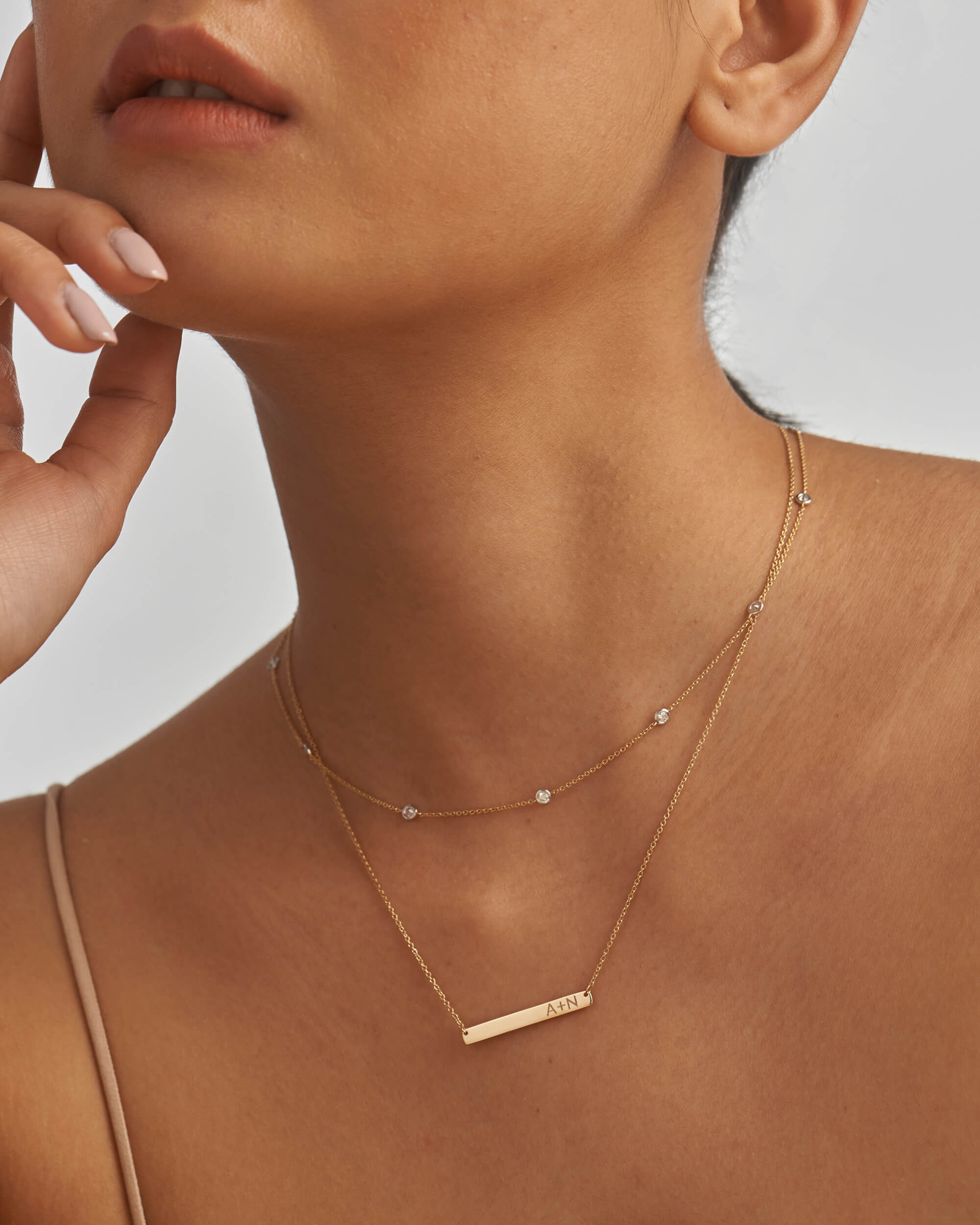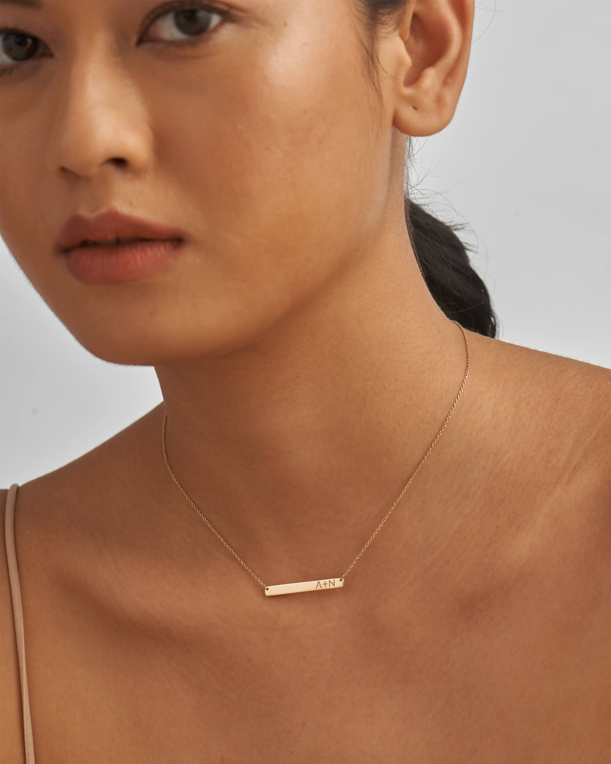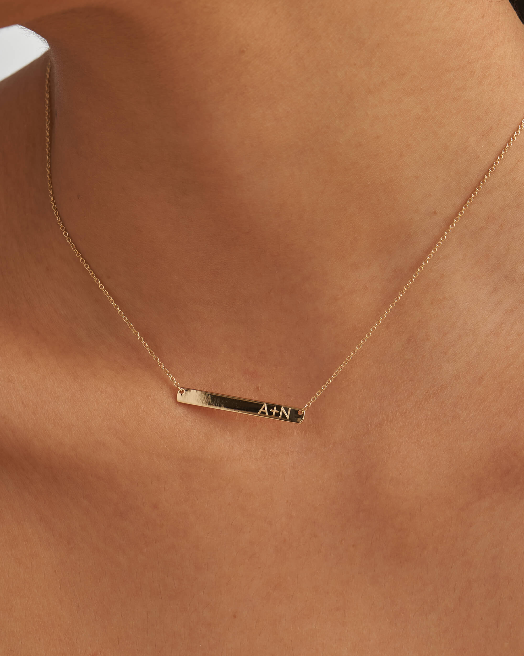 Our personalised necklace features an elegant engravable bar (30mm) that hangs from a solid gold chain. Engrave your memorable date, name or initials to commemorate the special bonds. Handcrafted in solid gold and finished with high polish.